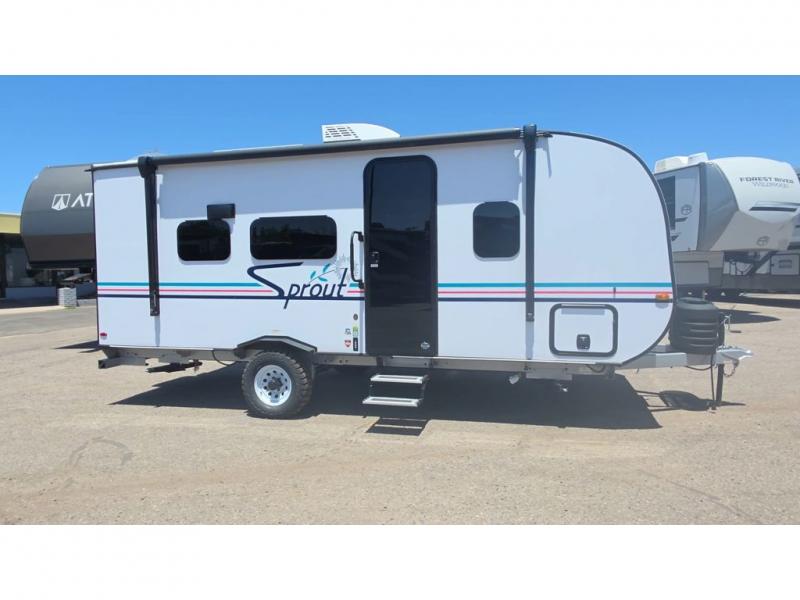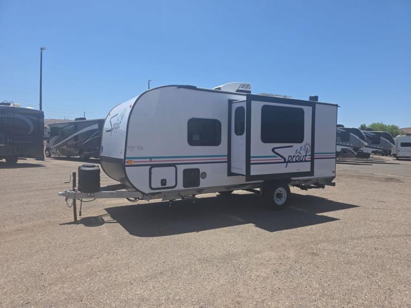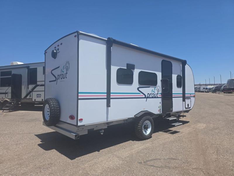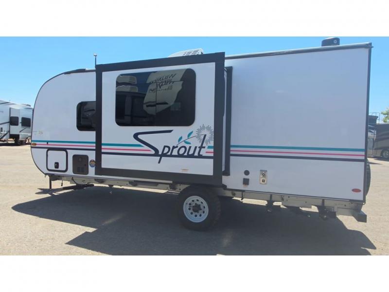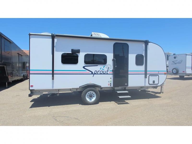 The Sprout travel trailers by Keystone are premium single-axle units that are sure to make an impression at the campground. Each one is built with an exclusive automotive-finished aluminum exterior, a walkable roof, and a 100% composite floor for added durability. There are also tinted safety glass windows, quick drop stabilizer jacks, and an exterior shower with hot and cold water. Inside, you will enjoy blackout night shades and a 6' 6" interior height, along with an ultra bright LED light strip and solid surface countertops in the kitchen. The 13,500 BTU A/C and 20,000 BTU furnace will keep you comfortable, and the Suburban tankless water heater is a convenience you won't want to camp without!