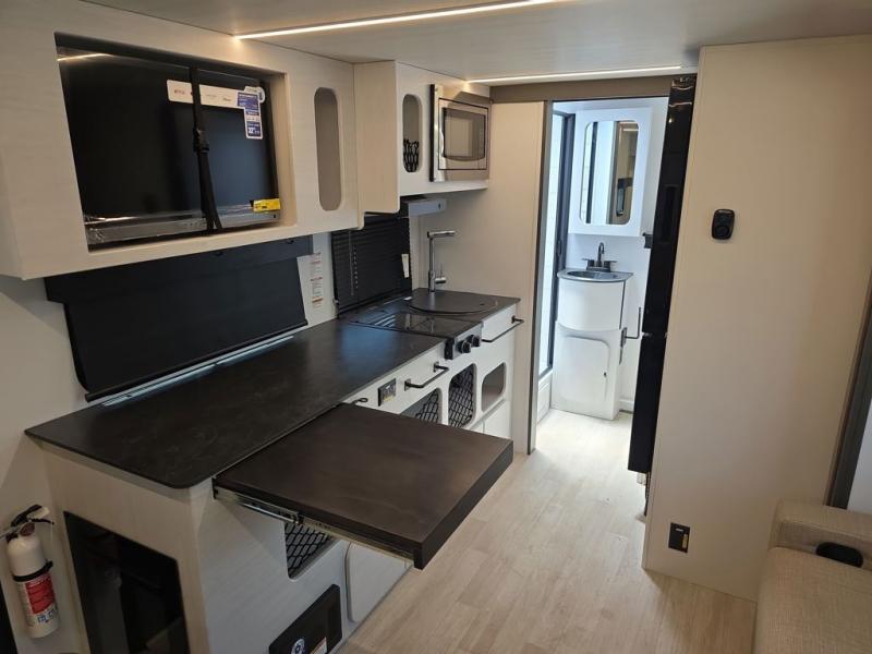 This single axle trailer is both cozy and versatile since there is a fold down sofa/Murphy bed up front! Now you can easily convert seating space into sleeping space, plus there are dual bedside closets to keep your things tidy. A two burner cooktop and air fryer/convection microwave will let you cook meals each day, and there is a huge countertop plus a flip-up extension for even more prep space. This unit also includes a theater dinette where you can relax each day, and the fireplace is sure to make your space feel like home!