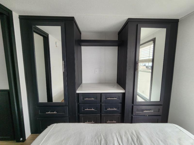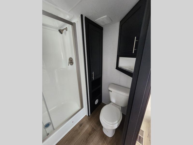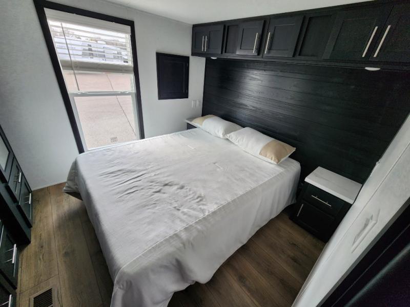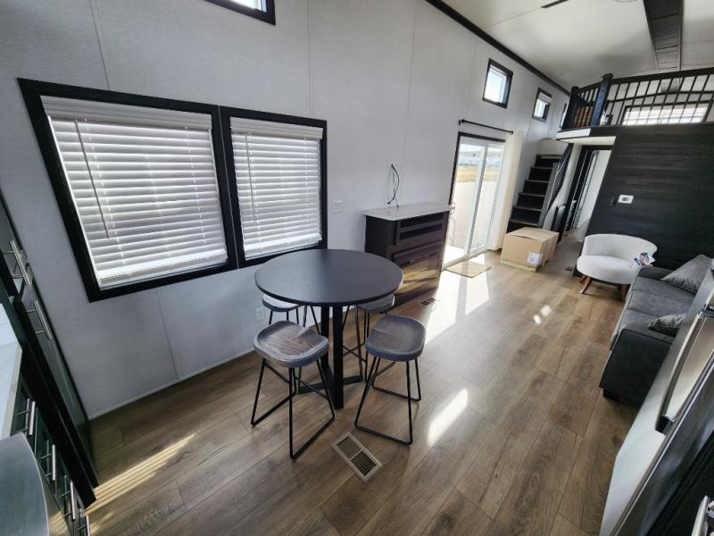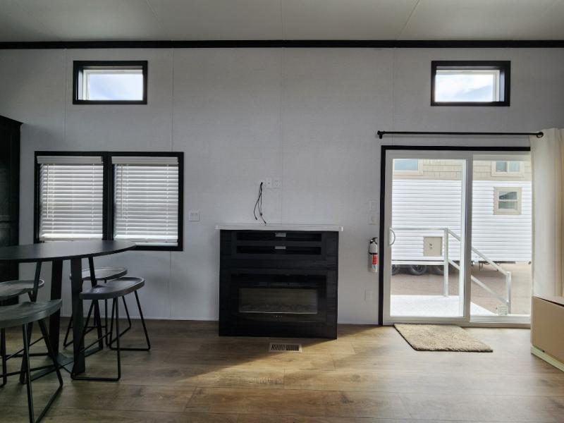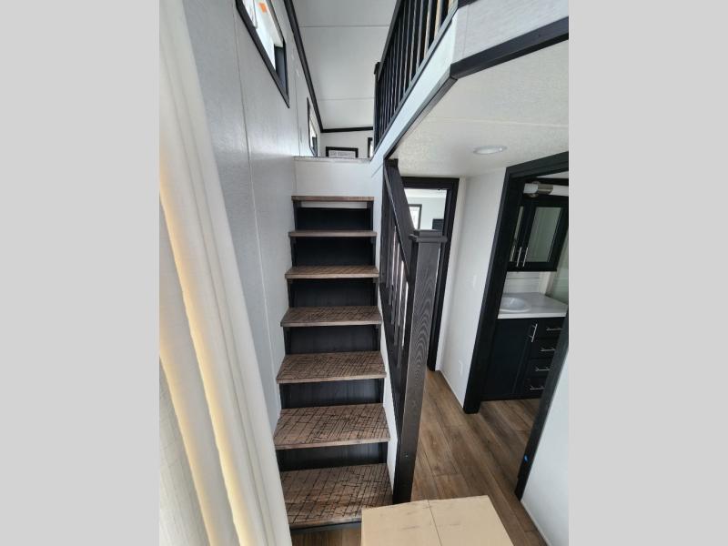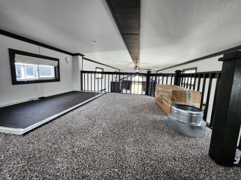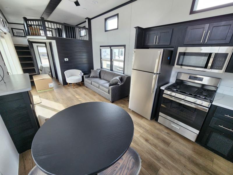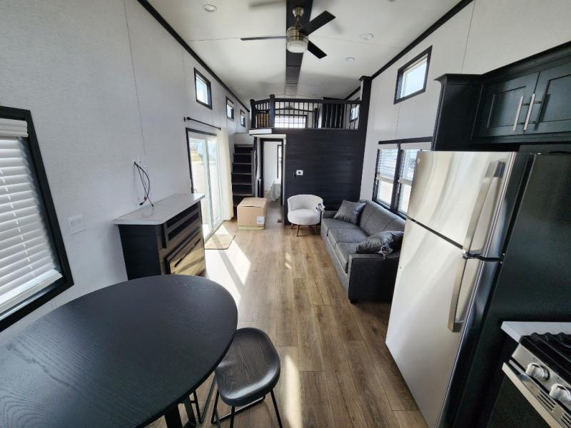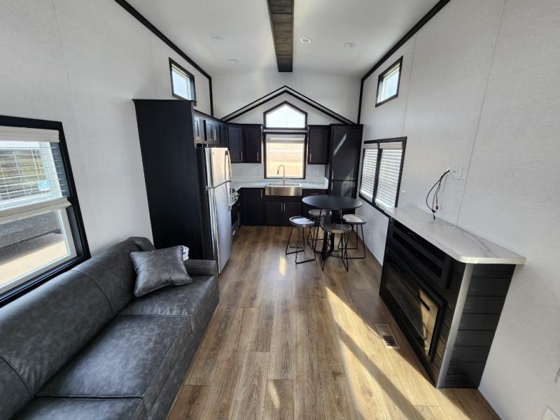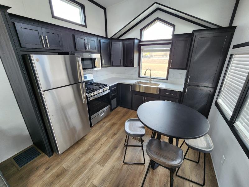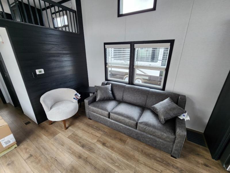 With a front kitchen in this park model, you will have plenty of space to create your favorite meals! You can spend all day relaxing and enjoying the outdoors, and the evenings can be filled with fun inside this model. Across from the hide-a-bed sofa is an entertainment center with an optional fireplace. You'll feel right at home when you use the four-burner range to get breakfast together, and the 18-cubic foot refrigerator can store just about anything. The 6" vinyl sliding patio door lets in plenty of sunlight and is next to the stairs that lead to the loft area. Freshen up in the 54" shower before heading to bed in the rear private bedroom on a king bed!