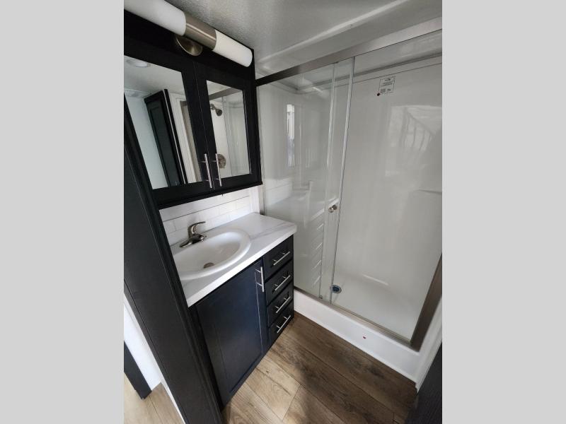 There are countless ways you can enjoy the Kropf Industries Lakeside Series park model! You can enjoy it as a cabin in the woods, or you can stay closer to civilization and use it as a party center. The laminate/self edge countertops and stone/tile backsplash is not only appealing to the eye, but also easy to clean. Stay clean with a 54" one piece fiberglass shower and enjoy your favorite beverages chilled in the residential 18 cubic foot refrigerator. A queen bed offers a good night's rest and mini blinds add extra privacy. There are many upgrade options you can select like an on demand gas water heater, an upright furnace, premium siding, a metal roof for the rain to fall right off, and brick mold window trim for an even more desirable exterior. Come see all of the practical functionality today!