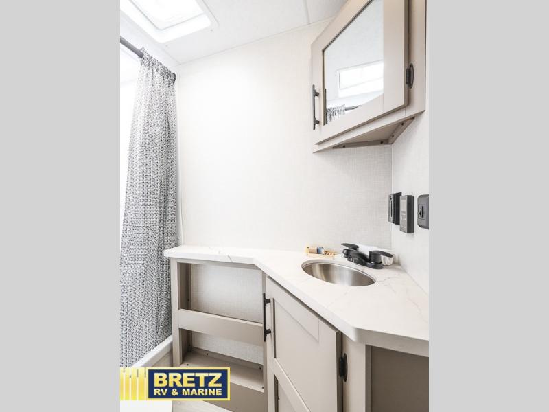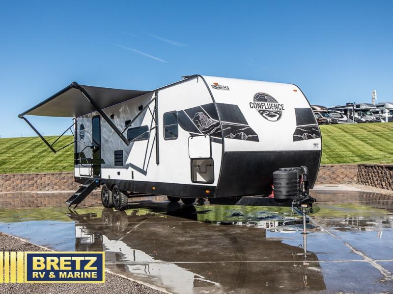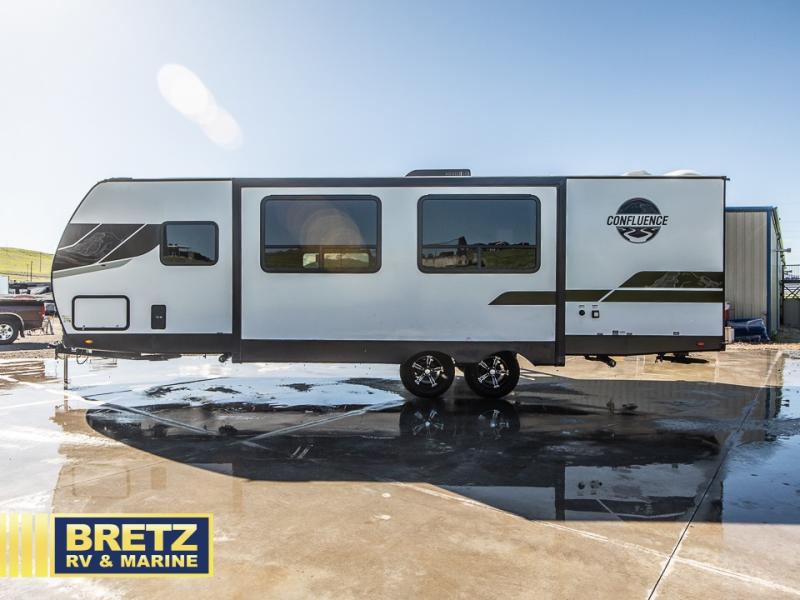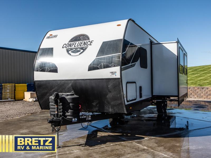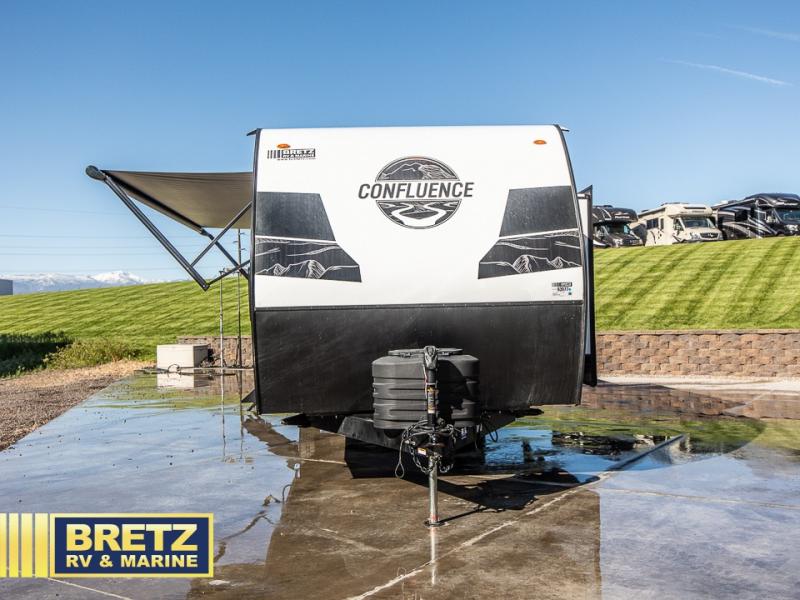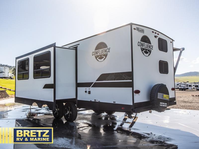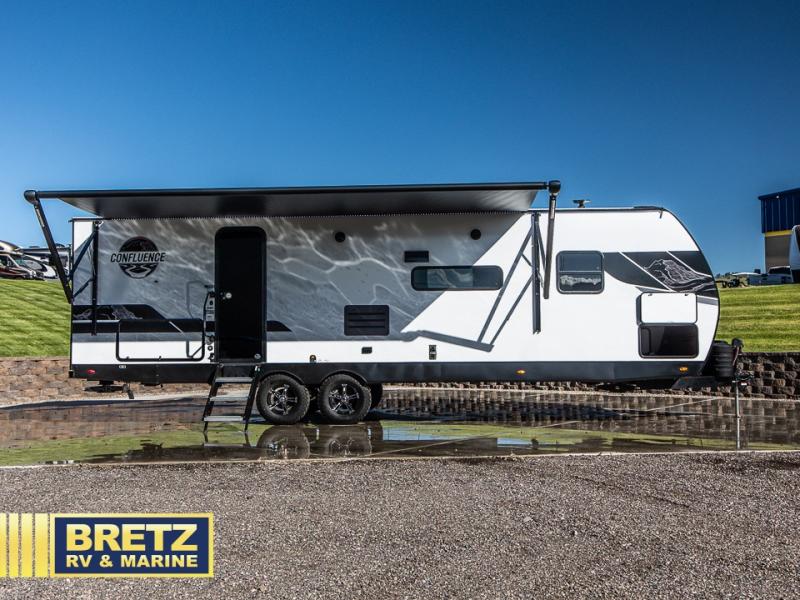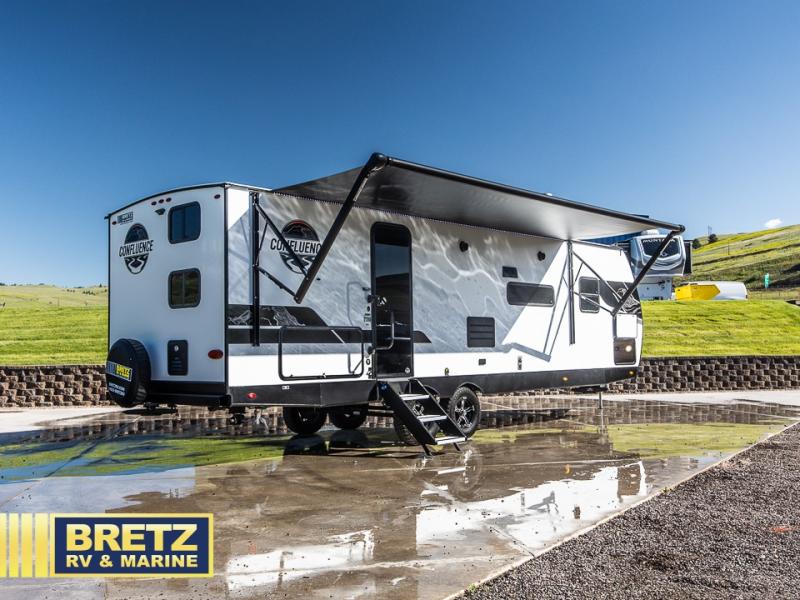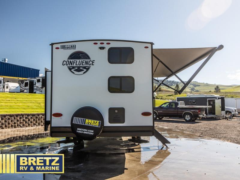 With any Confluence travel trailer by KZ you will find a white exterior fiberglass that is not only eye-catching, but easy to keep clean as well. The protective front diamond plate will help protect your trailer from rock and debris on the way to the campground, and the four stabilizer jacks will make for easy set-up once you arrive. Each model includes the Climate Package which features a heated, insulated, and enclosed underbelly with 12V heat pads and enclosed dump valves so you can camp well into the colder months. These pet-friendly models include a leash latch that will also double as a beverage opener, and there is an outside shower to fill the dogs water bowl. You will also enjoy the multi-media entertainment system with a DVD player, two 6.5" interior speakers for those rainy days. Start a new adventure today in a Confluence trailer trailer!