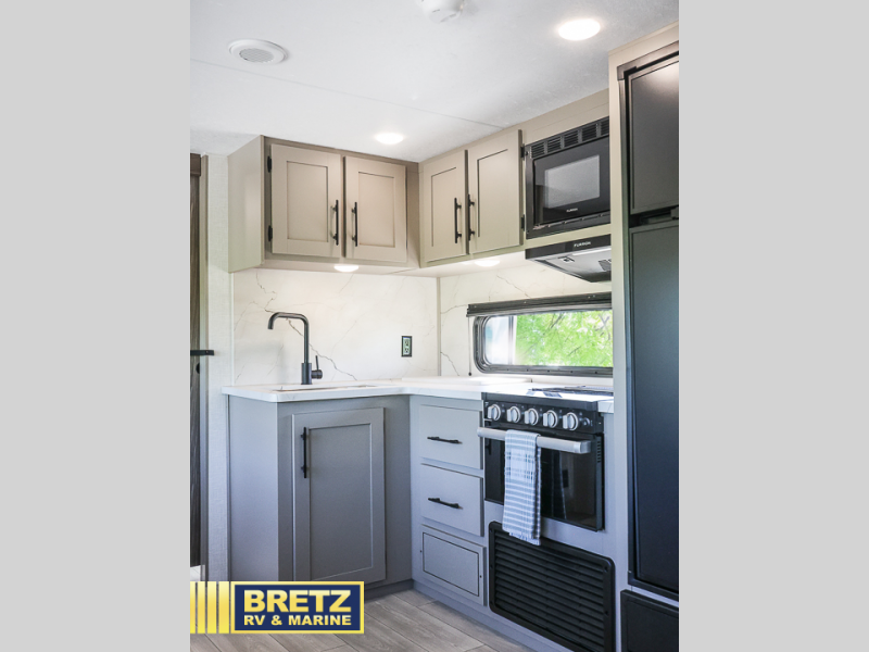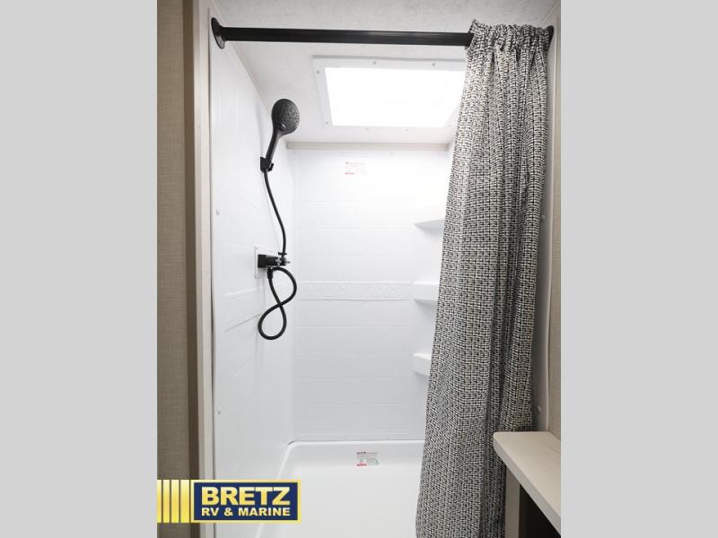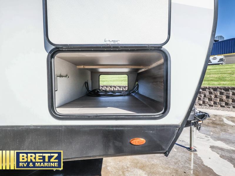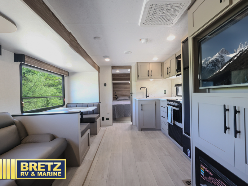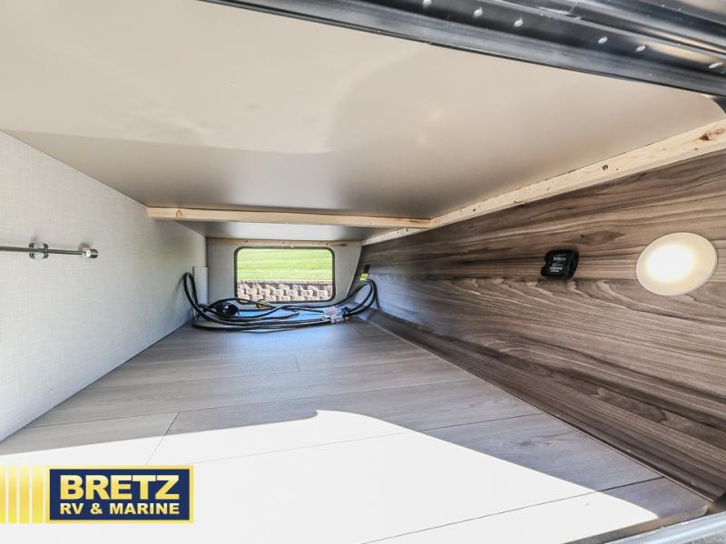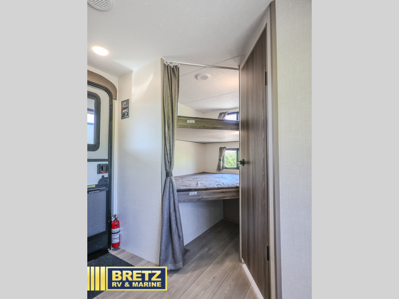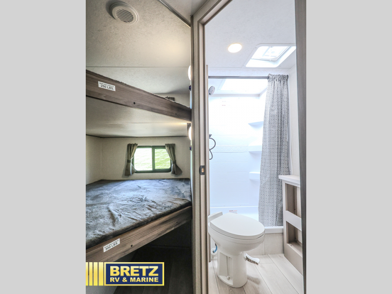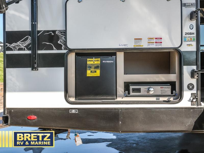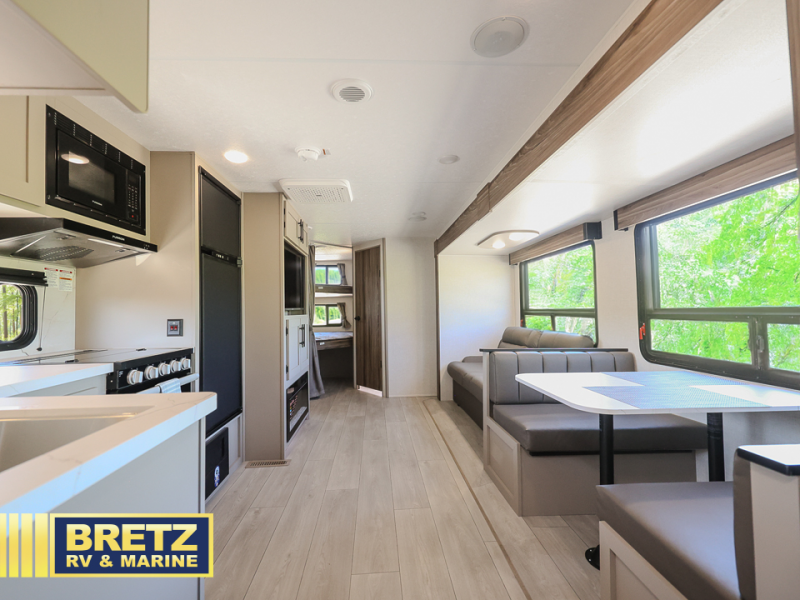 This travel trailer can comfortably sleep eight to nine people, so invite more friends to tag along! Within the large slide out you'll find the sofa and booth dinette that sits directly across from an entertainment center. You can also choose to add the optional 30" fireplace to make it more cozy. Your guests will love the double-size bunks, and the full bath is right next to the bunks to make bathroom visits at night super convenient. This model includes a three burner cooktop and a microwave oven indoors, and an outside griddle and refrigerator at the outside kitchen so you can choose where you want to cook each day. You'll appreciate the pass-through storage for fishing poles, hiking gear, and extra lawn chairs!