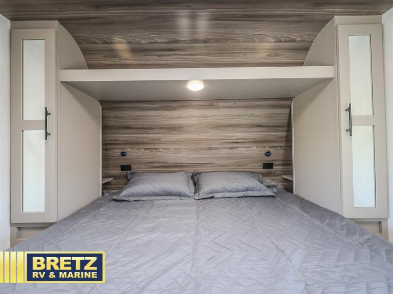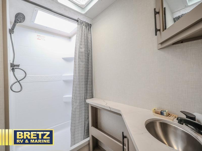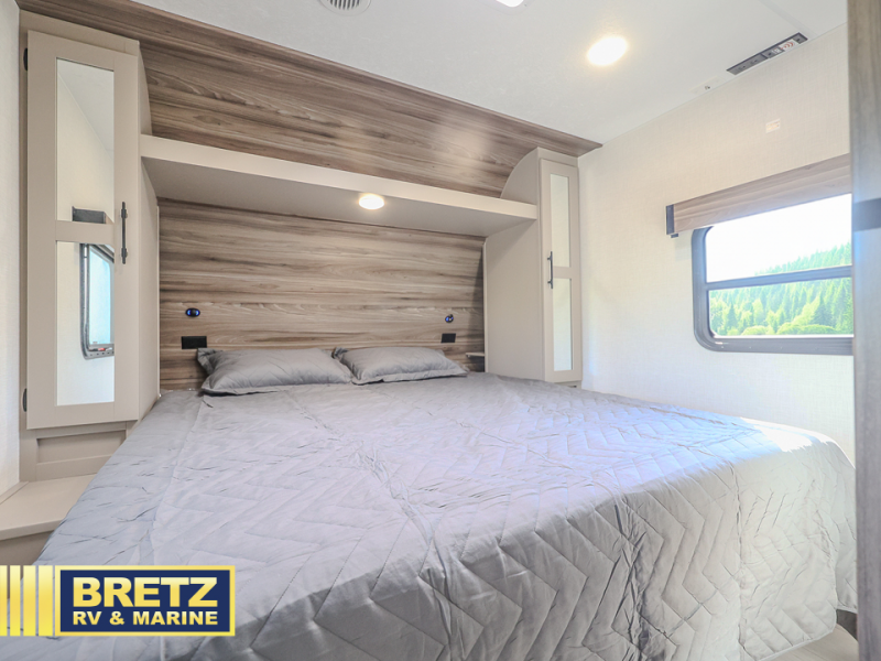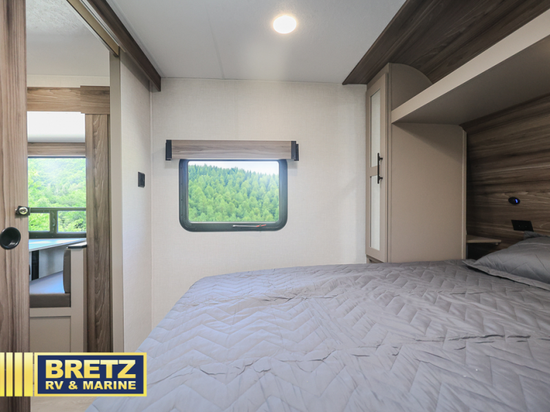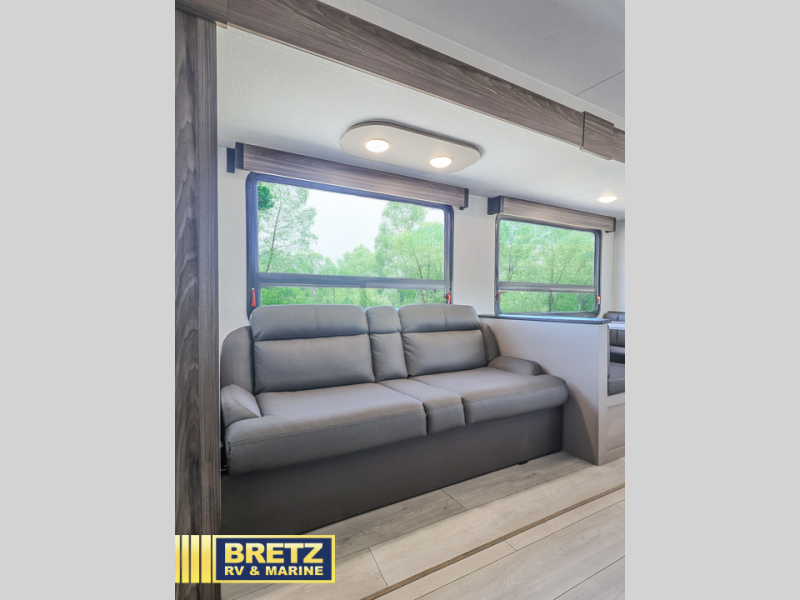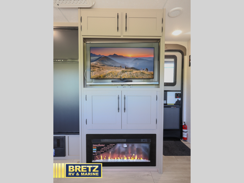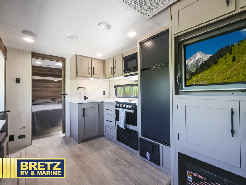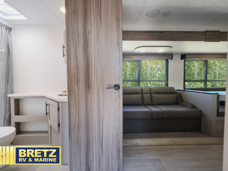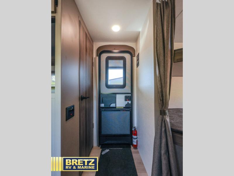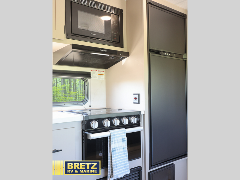 This travel trailer can comfortably sleep eight to nine people, so invite more friends to tag along! Within the large slide out you'll find the sofa and booth dinette that sits directly across from an entertainment center. You can also choose to add the optional 30" fireplace to make it more cozy. Your guests will love the double-size bunks, and the full bath is right next to the bunks to make bathroom visits at night super convenient. This model includes a three burner cooktop and a microwave oven indoors, and an outside griddle and refrigerator at the outside kitchen so you can choose where you want to cook each day. You'll appreciate the pass-through storage for fishing poles, hiking gear, and extra lawn chairs!