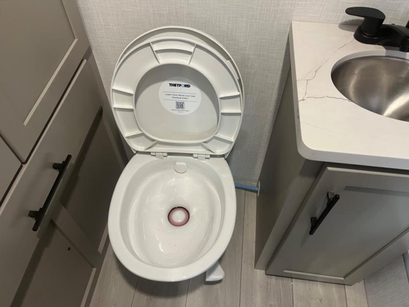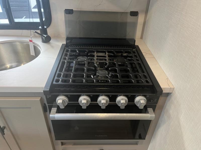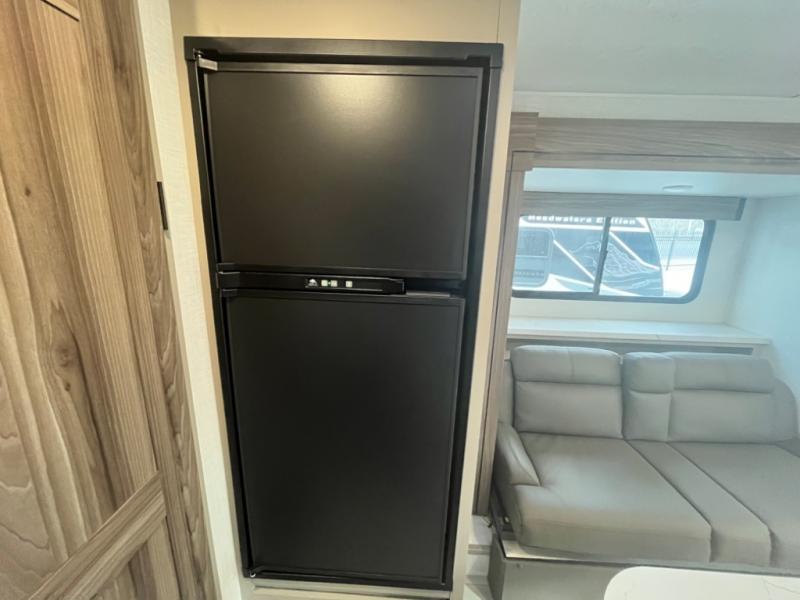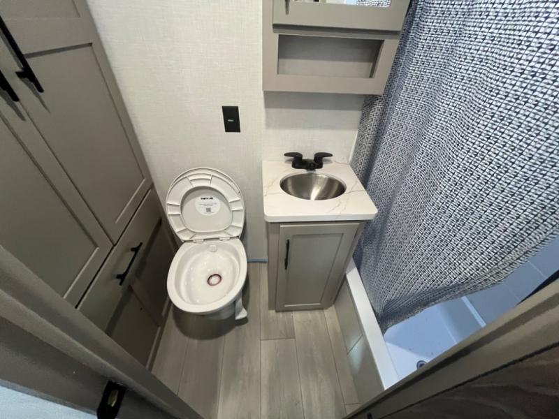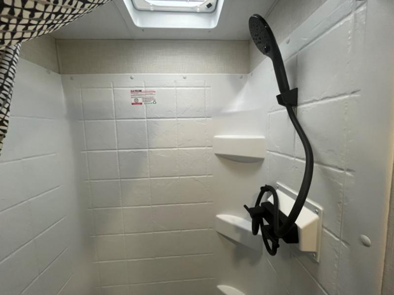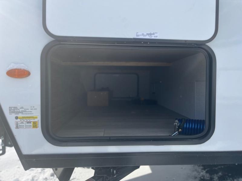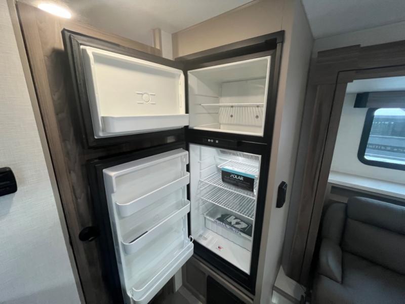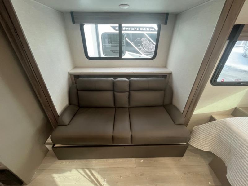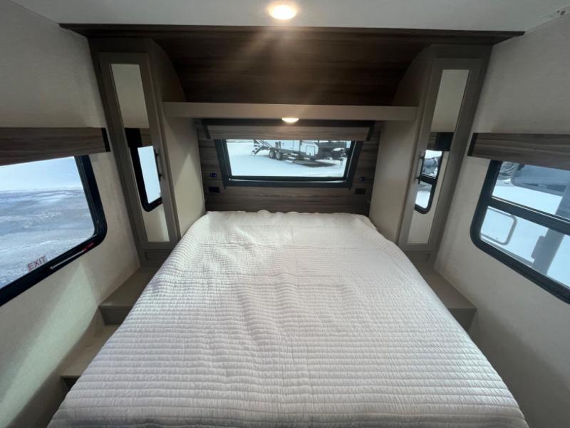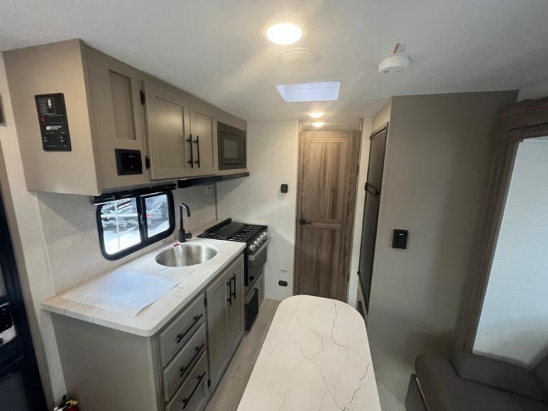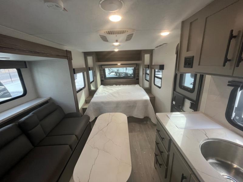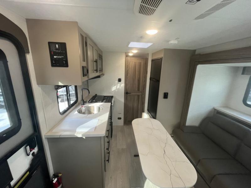 If you're wanting to upgrade from a tent to a travel trailer, this unit will be perfect for two to three campers. Instead of an air mattress, you'll sleep soundly on the front queen bed, and there are dual bedroom wardrobes so you don't have to live out of suitcases. The full rear bath is sure to come in handy, especially at night and you'll find more storage space here in the bath closet. When you're not wanting to grill on an open flame outdoors, the 17" oven with a three burner cooktop and the microwave oven will let you cook meals for your crew. There is also a 64" Jackknife sofa slide that will provide seating space, sleeping space for a guest, and extra floor space inside!