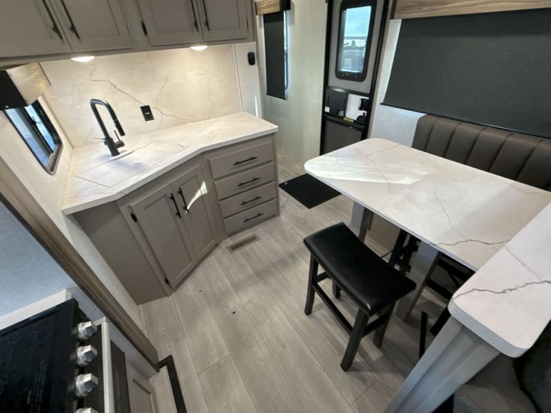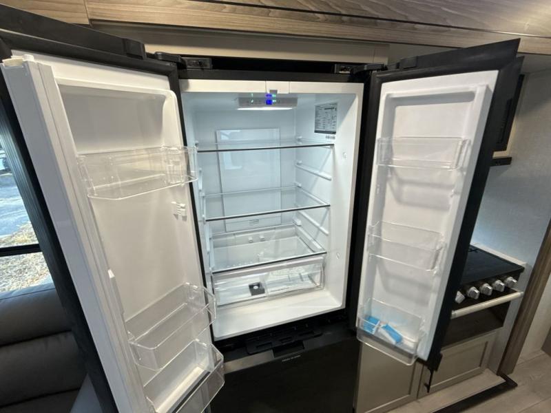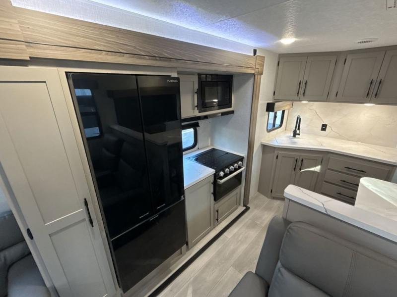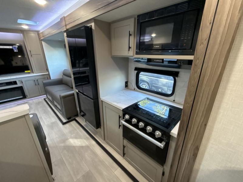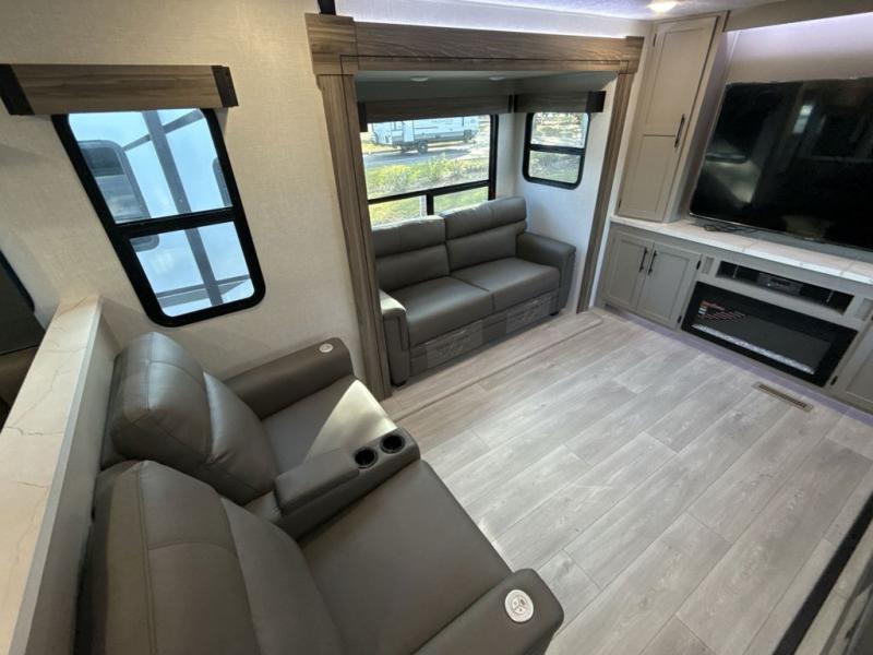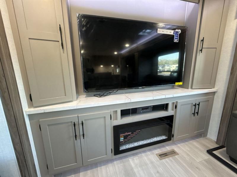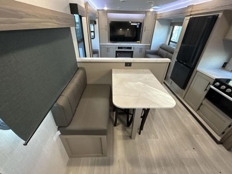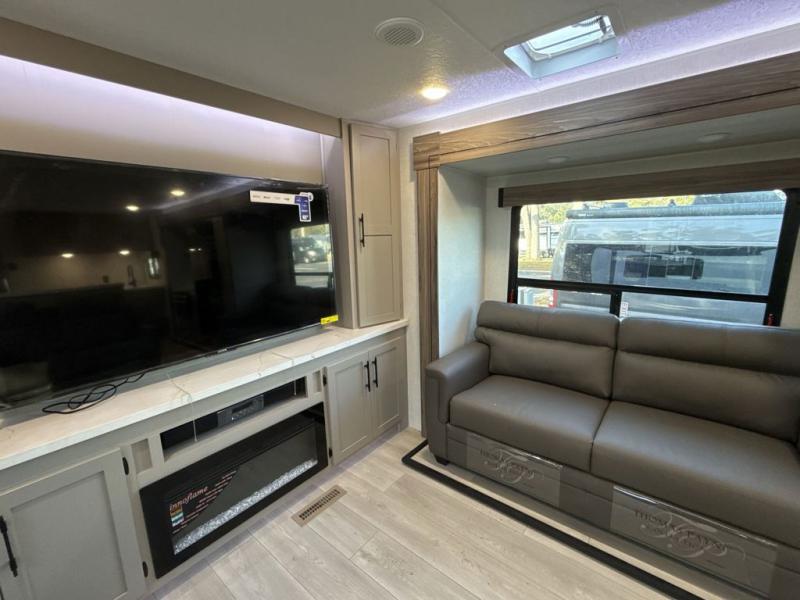 Head for the hills, lake, or woods in this spacious travel trailer. Once your gear is unloaded from the pass-through storage, set up the 19' power awning with LED lights and relax with a cold drink. Once you head inside you can make lunch on the three burner range and dine at the dinette that includes two chairs and bench seating. The rear living area includes a rear entertainment center with an LED TV and a 34" fireplace for a cozy atmosphere. There is also theater seating here and two 70" sofas within the dual opposing slides where your guests can sleep. And you will enjoy the front private bedroom with a king bed all to yourselves!