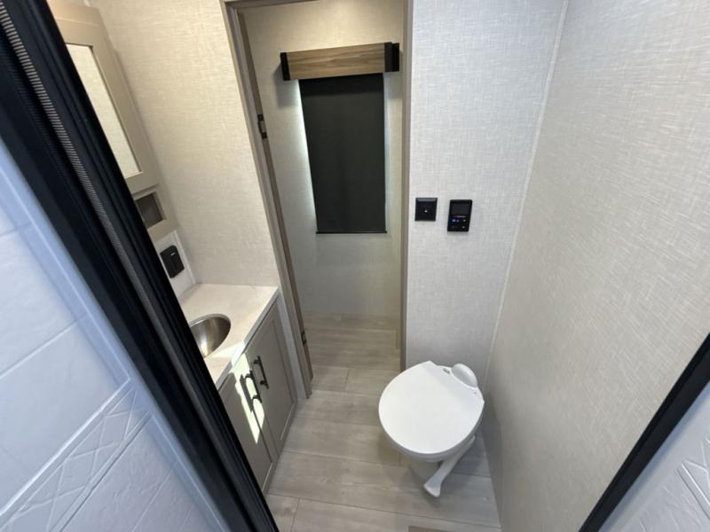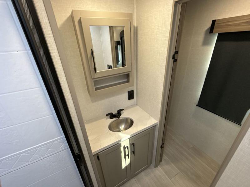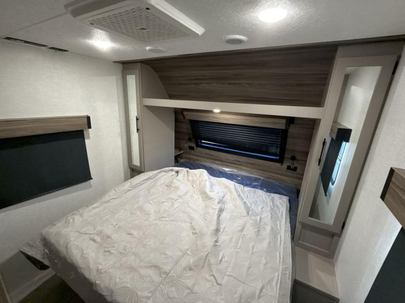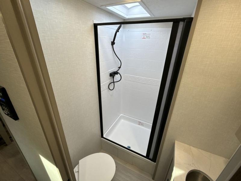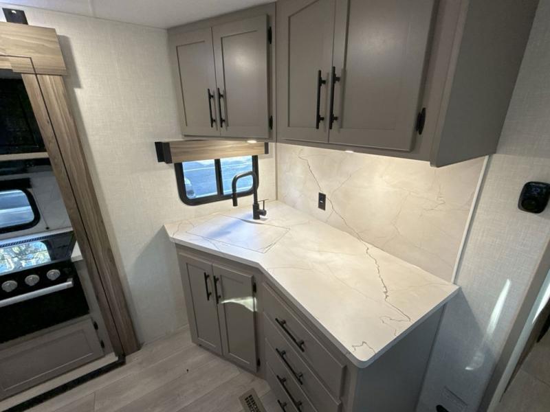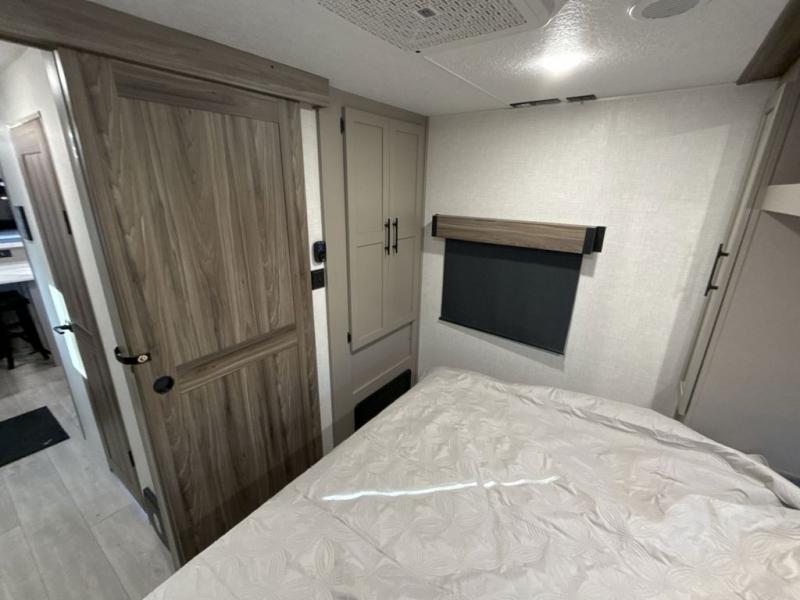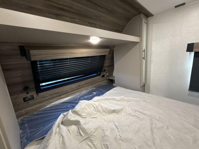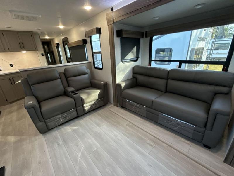 Head for the hills, lake, or woods in this spacious travel trailer. Once your gear is unloaded from the pass-through storage, set up the 19' power awning with LED lights and relax with a cold drink. Once you head inside you can make lunch on the three burner range and dine at the dinette that includes two chairs and bench seating. The rear living area includes a rear entertainment center with an LED TV and a 34" fireplace for a cozy atmosphere. There is also theater seating here and two 70" sofas within the dual opposing slides where your guests can sleep. And you will enjoy the front private bedroom with a king bed all to yourselves!
