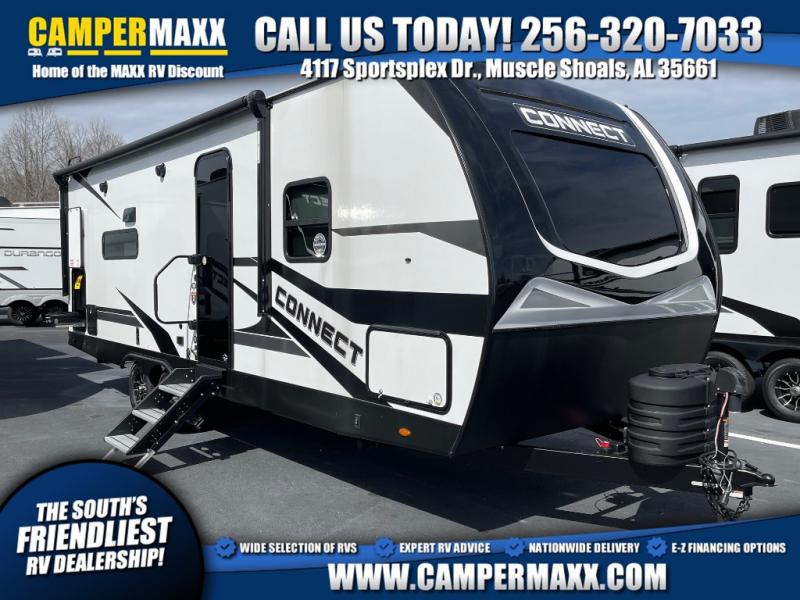 Hitch up this Connect travel trailer and head out for a fabulous weekend away! You will enjoy added space in the living area because of the single slide that holds the booth dinette, and another convenient feature is the dual-entry bathroom that can be accessed from the main hallway or the bedroom. You will be quite surprised to find a king-size bed inside the bedroom, but you will be immensely happy that it's there come bedtime. A pass-through storage on the exterior allows you to bring along extra gear, and the interior is kept cozy on chilly fall evenings with the 34" fireplace.