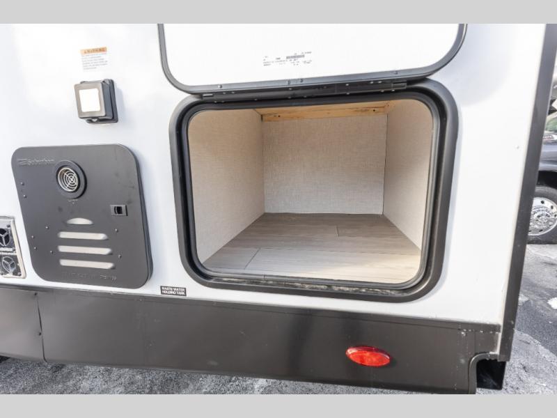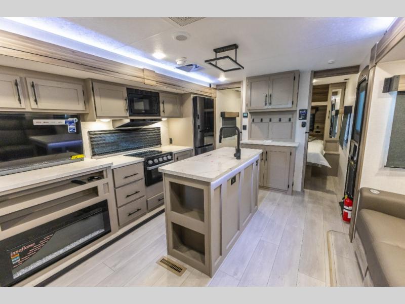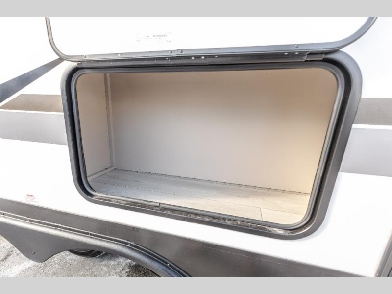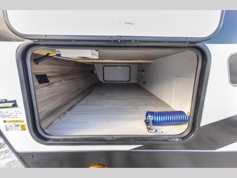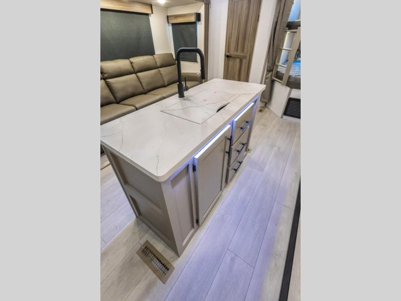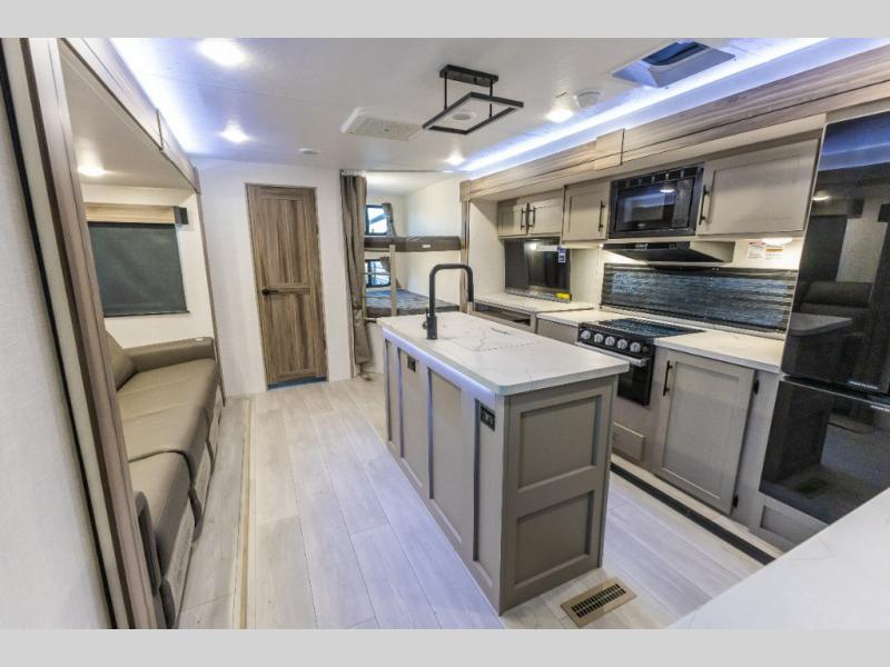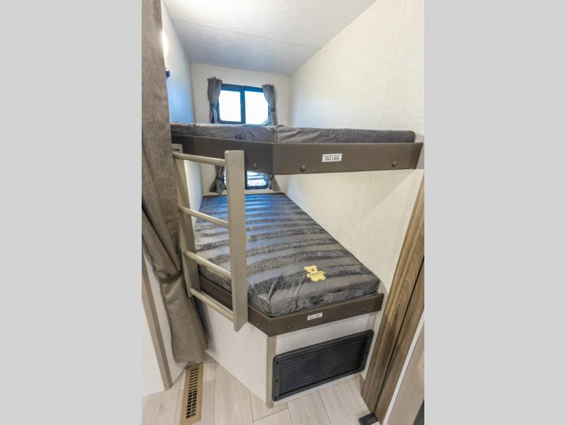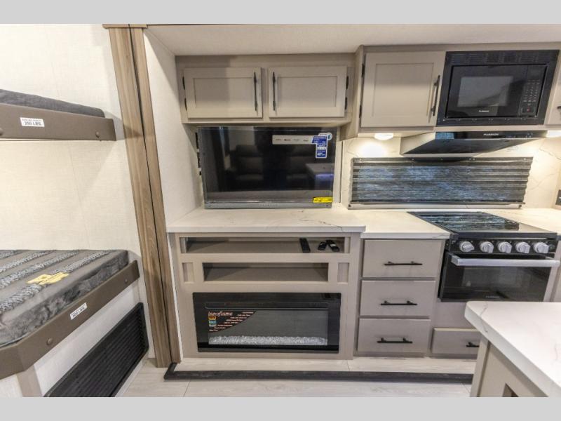 You'll love how spacious this travel trailer is thanks to the dual opposing slides in the combined kitchen and living area. You'll also find theater seating here across from the fireplace and LED TV to make it a movie night. The kids or your guests can sleep on the rear corner double-size bunks, and there is a trunk door under the bunks for easy storage. You'll find a king bed in the front private bedroom for a great night's rest, and the dual wardrobes will let you keep your room tidy. This unit also includes a kitchen island and a hutch for more counter and storage space; how convenient!