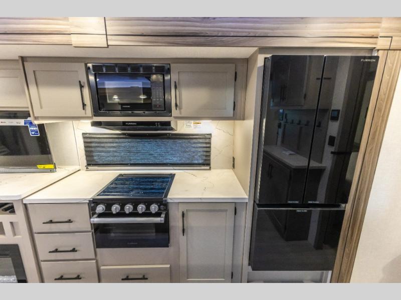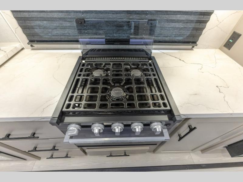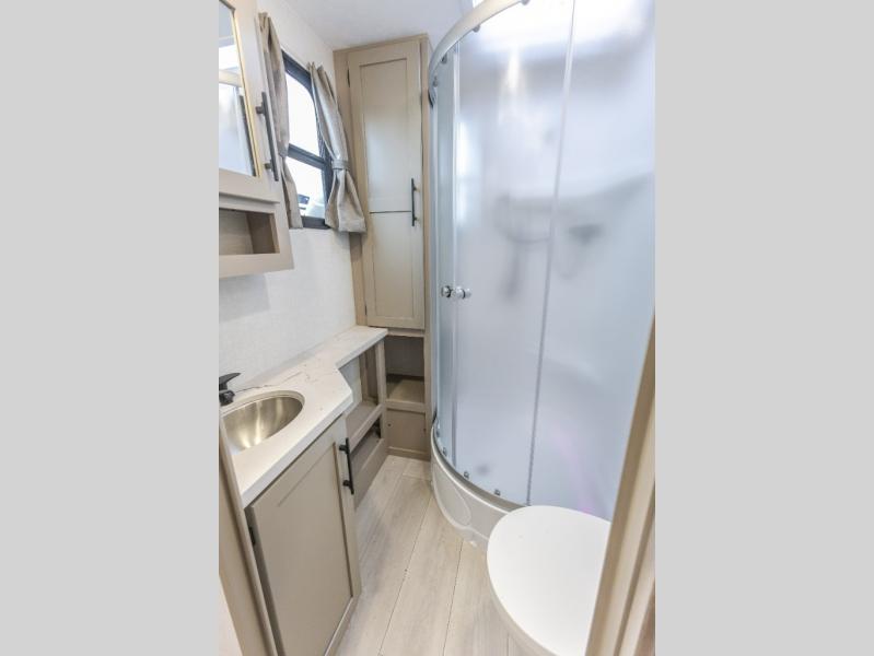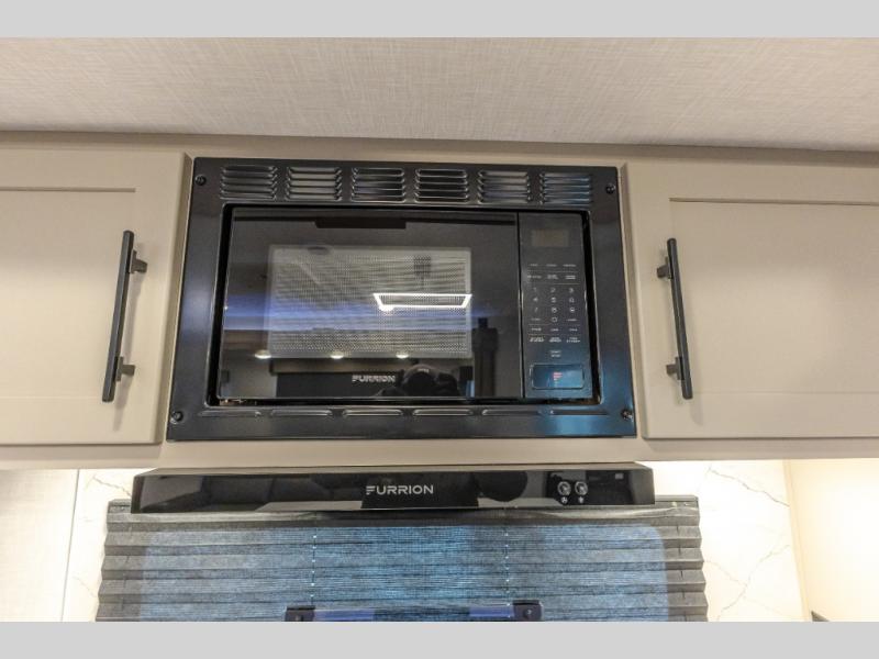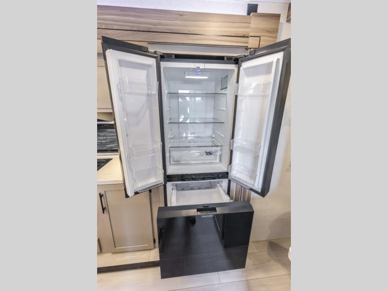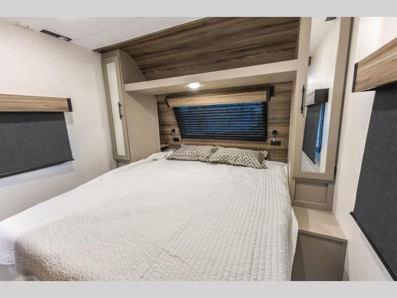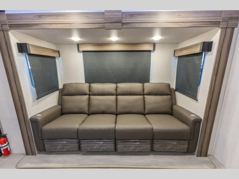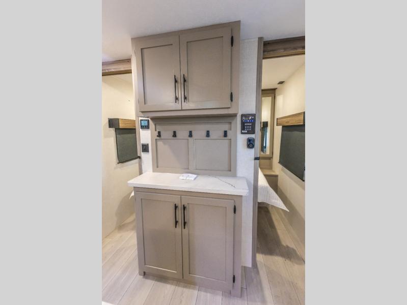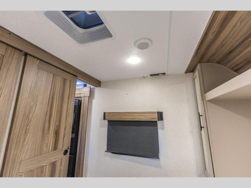 You'll love how spacious this travel trailer is thanks to the dual opposing slides in the combined kitchen and living area. You'll also find theater seating here across from the fireplace and LED TV to make it a movie night. The kids or your guests can sleep on the rear corner double-size bunks, and there is a trunk door under the bunks for easy storage. You'll find a king bed in the front private bedroom for a great night's rest, and the dual wardrobes will let you keep your room tidy. This unit also includes a kitchen island and a hutch for more counter and storage space; how convenient!