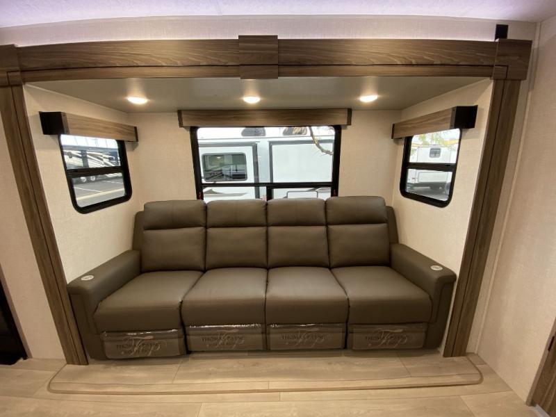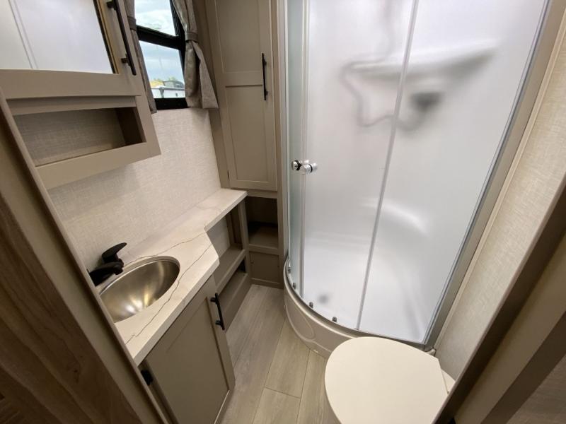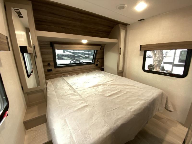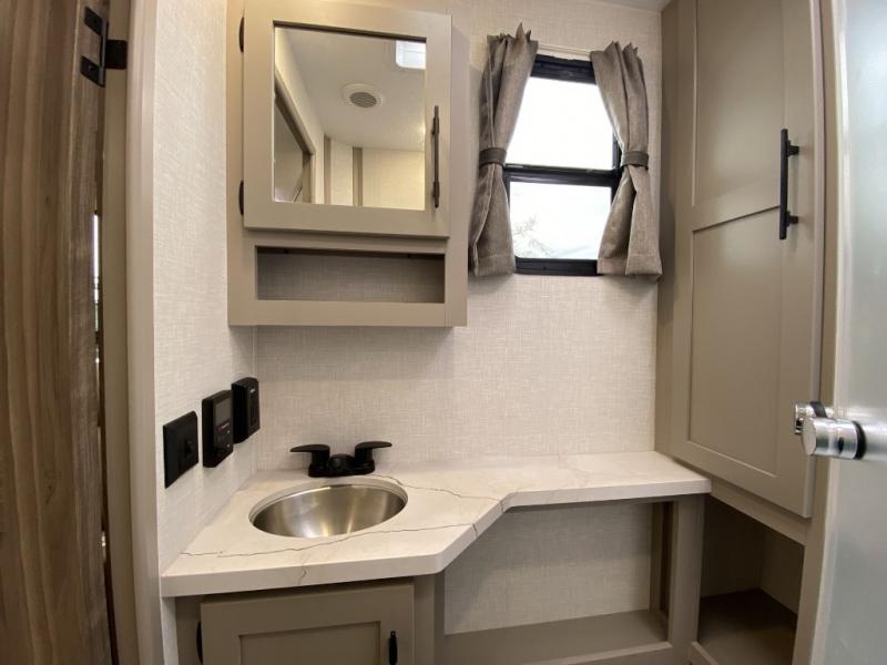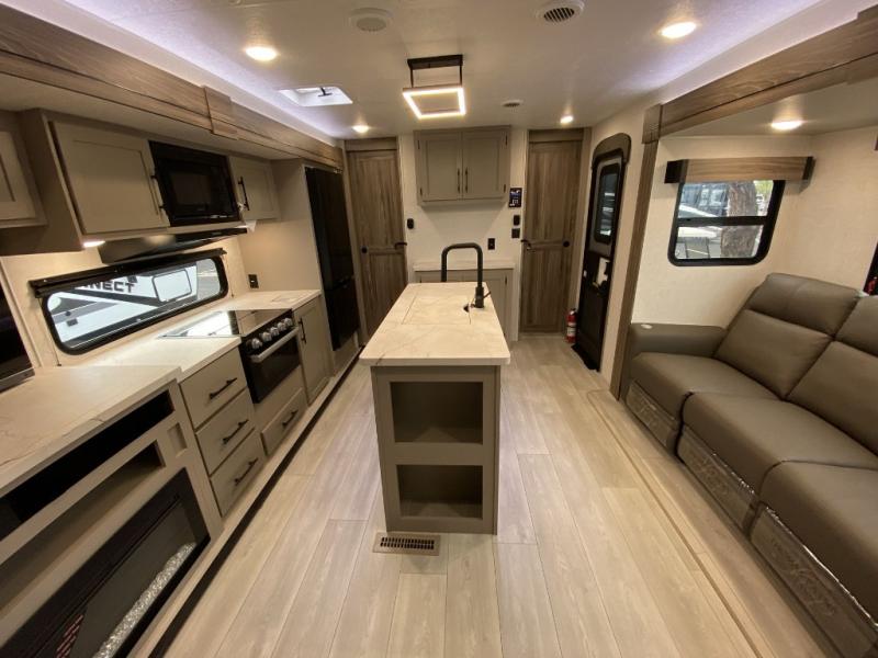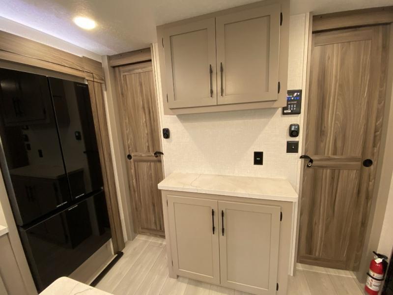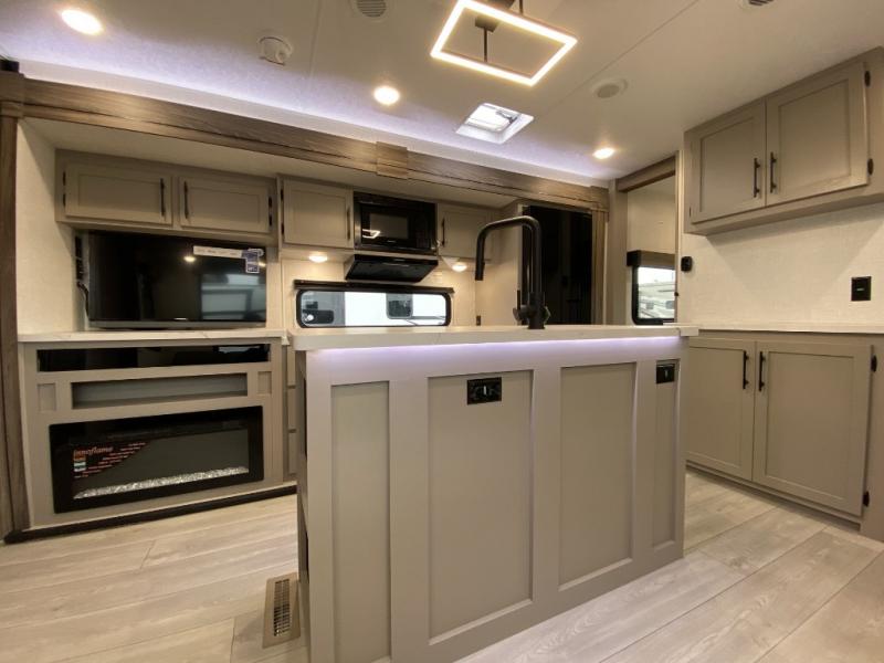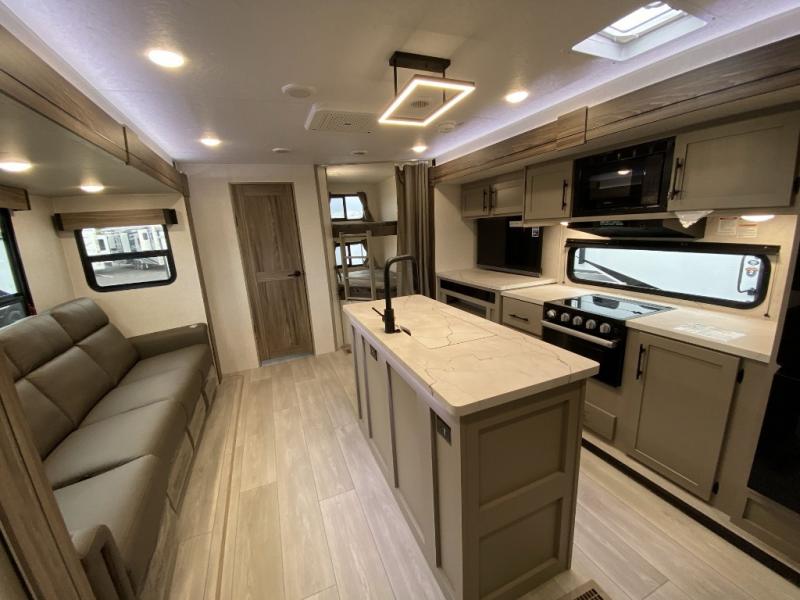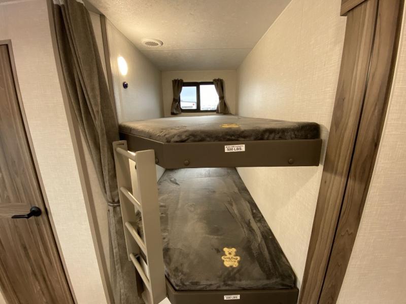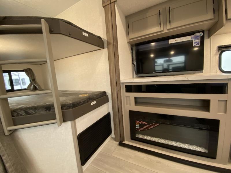You'll love how spacious this travel trailer is thanks to the dual opposing slides in the combined kitchen and living area. You'll also find theater seating here across from the fireplace and LED TV to make it a movie night. The kids or your guests can sleep on the rear corner double-size bunks, and there is a trunk door under the bunks for easy storage. You'll find a king bed in the front private bedroom for a great night's rest, and the dual wardrobes will let you keep your room tidy. This unit also includes a kitchen island and a hutch for more counter and storage space; how convenient!