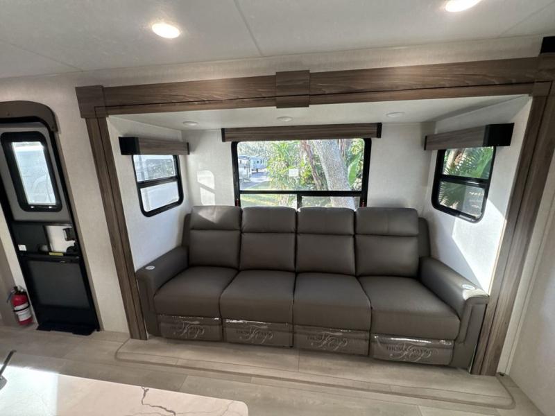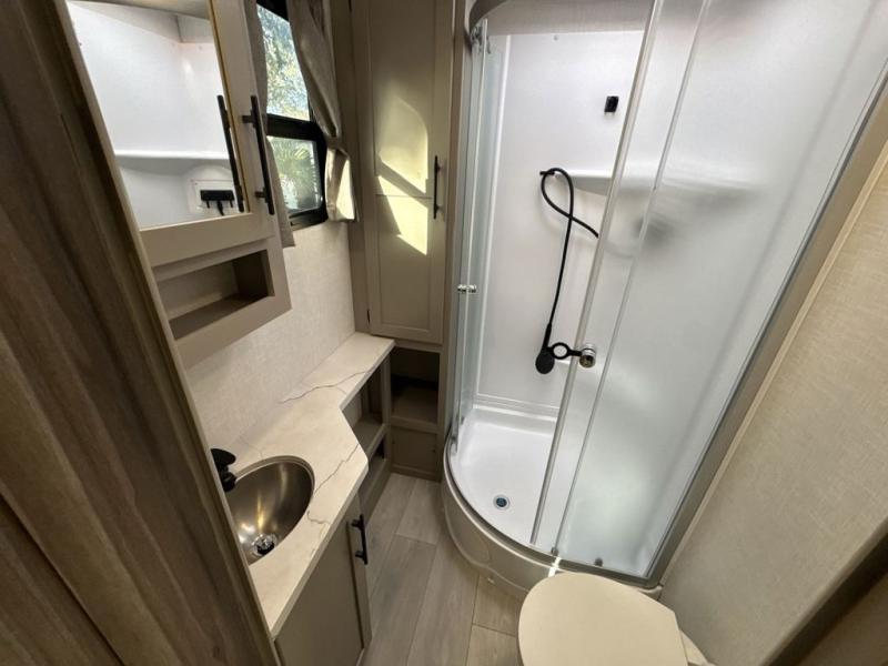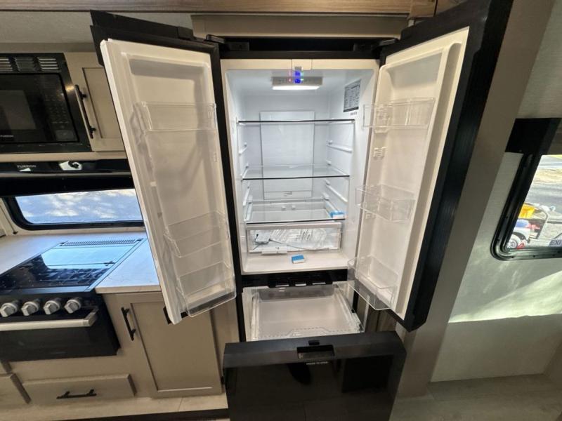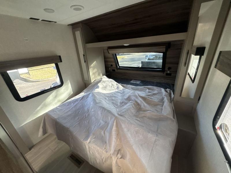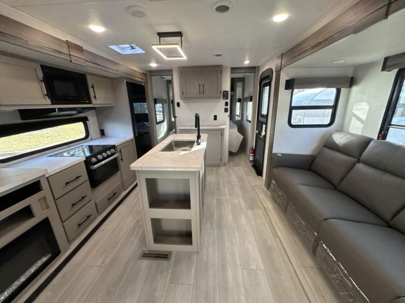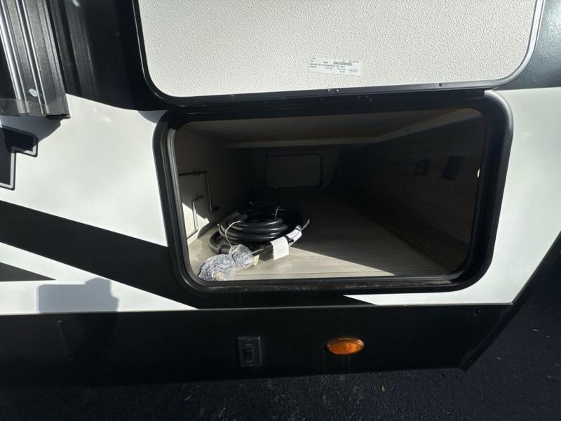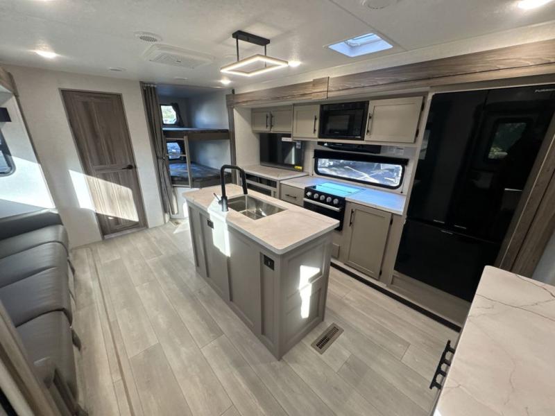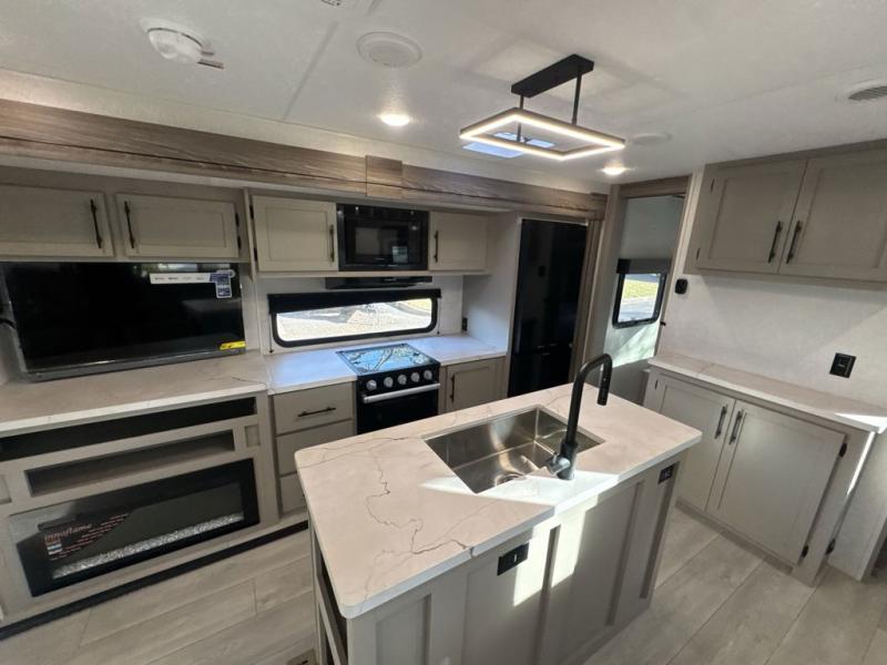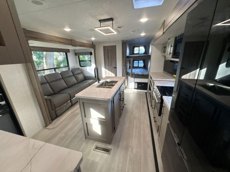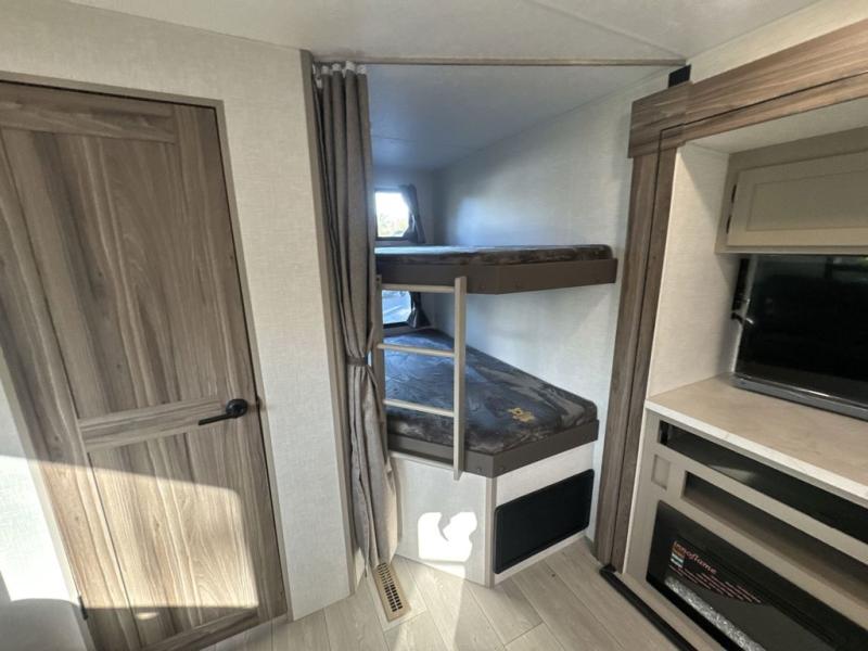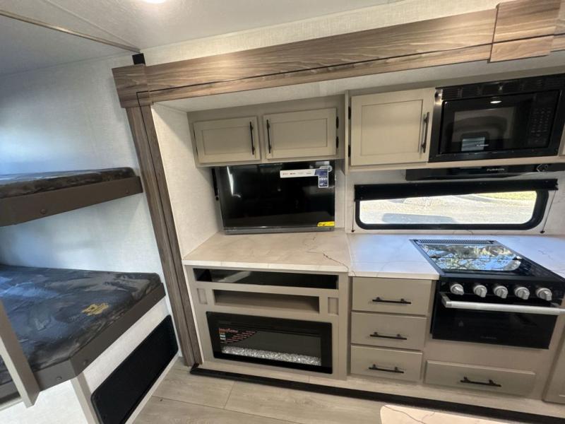 You'll love how spacious this travel trailer is thanks to the dual opposing slides in the combined kitchen and living area. You'll also find theater seating here across from the fireplace and LED TV to make it a movie night. The kids or your guests can sleep on the rear corner double-size bunks, and there is a trunk door under the bunks for easy storage. You'll find a king bed in the front private bedroom for a great night's rest, and the dual wardrobes will let you keep your room tidy. This unit also includes a kitchen island and a hutch for more counter and storage space; how convenient!