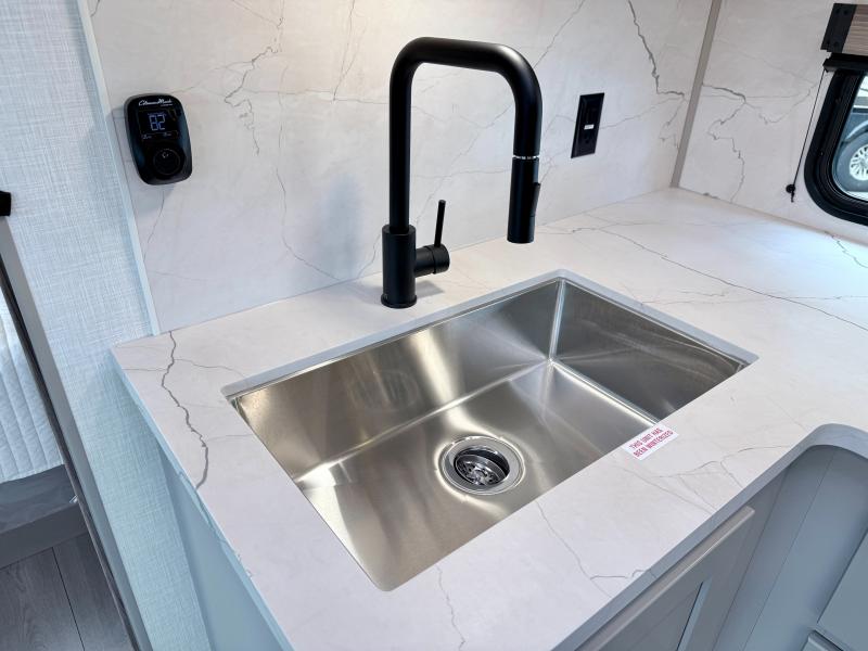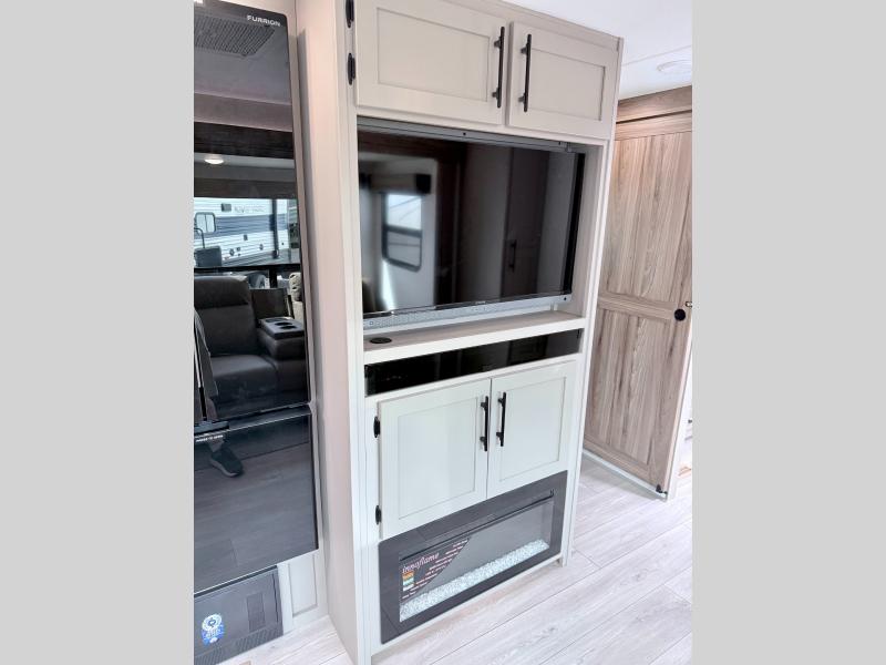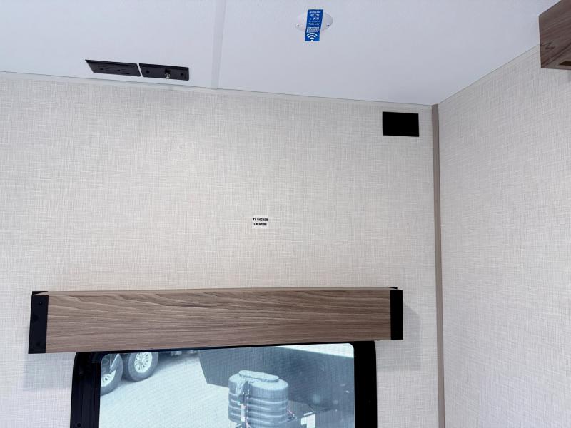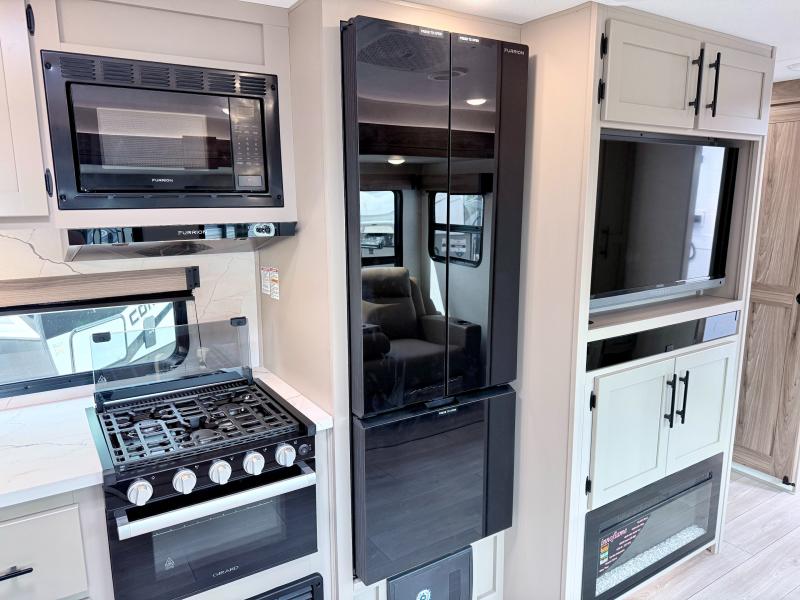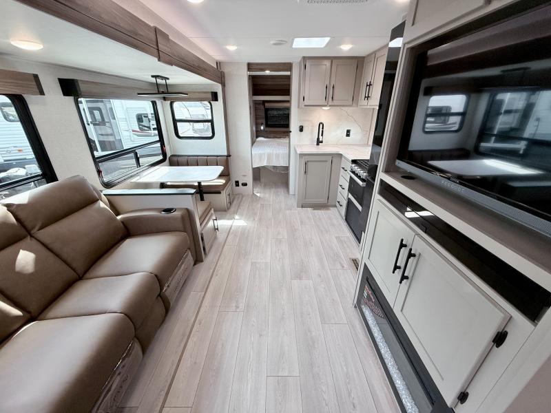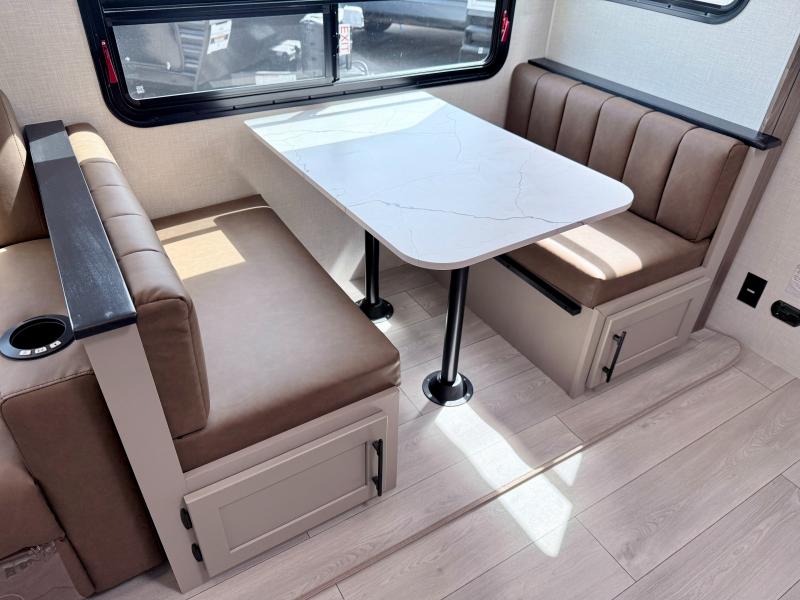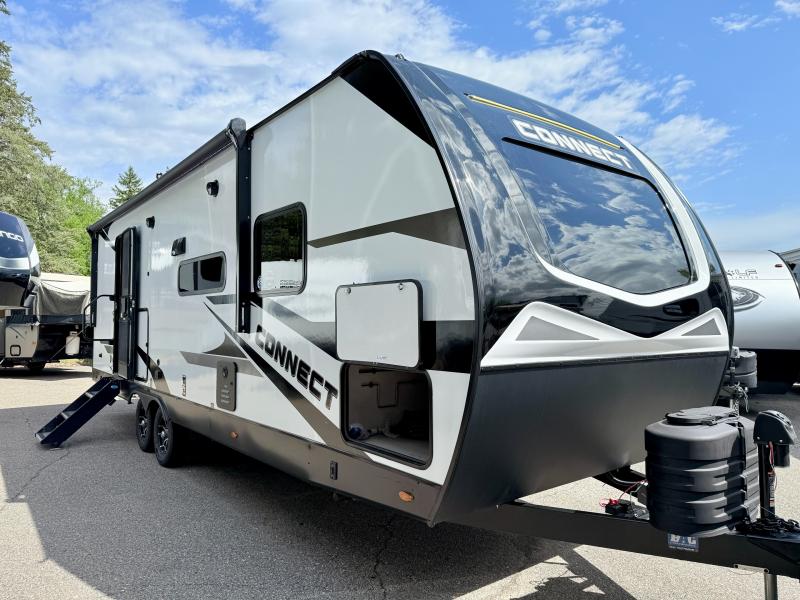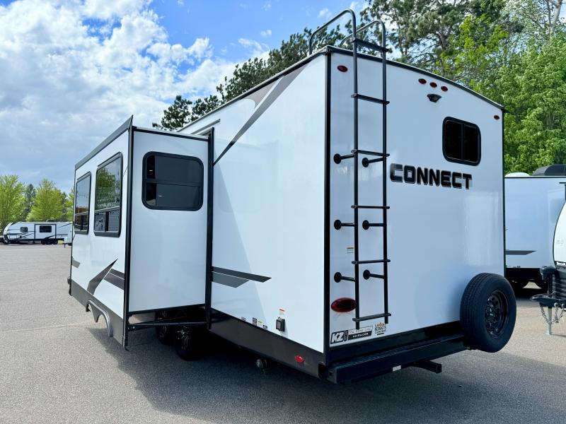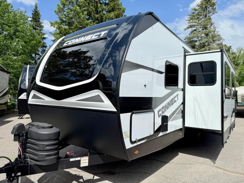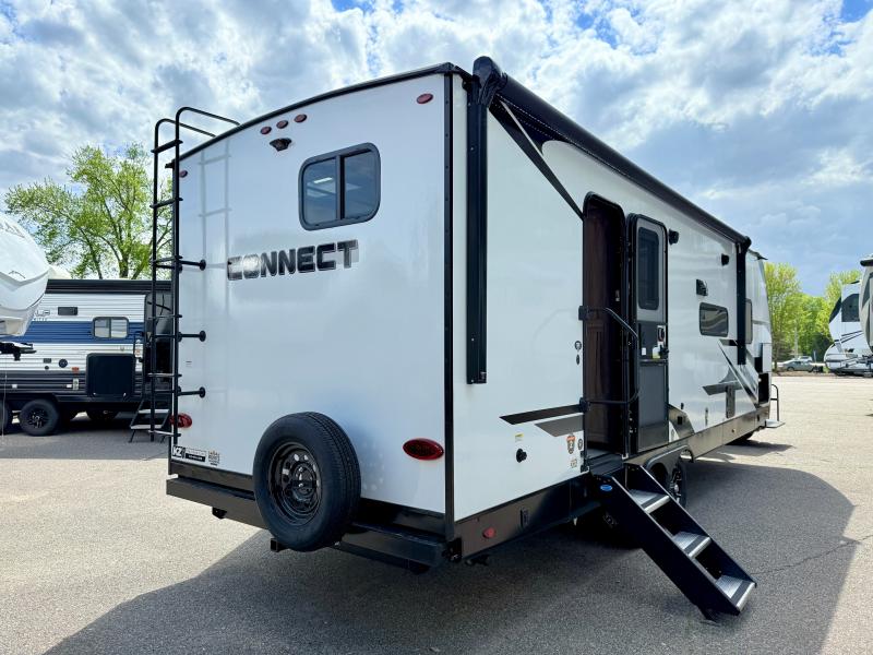 Your needs will be met and your desires will be fulfilled with this Connect travel trailer! Probably the thing you miss most when you camp is your comfortable bed back at home, and that's exactly why this trailer comes with a Serta Comfort foam king mattress in the private bedroom. The other thing you are prone to miss is your bathroom, and the full rear bathroom on this trailer is an excellent replacement with its 30" x 36" shower, skylight, linen closet, MaxxAir vent, porcelain foot-flush toilet, and dual sink vanity. Sit back on the hide-a-bed sofa and enjoy a night of relaxation in front of the LED TV and 34" fireplace. You can even grab a couple of drinks from the 10 cu. ft. 12V refrigerator, snacks from the walk-in pantry with coat hooks, or you can make it a fun evening by playing a game together at the booth dinette.