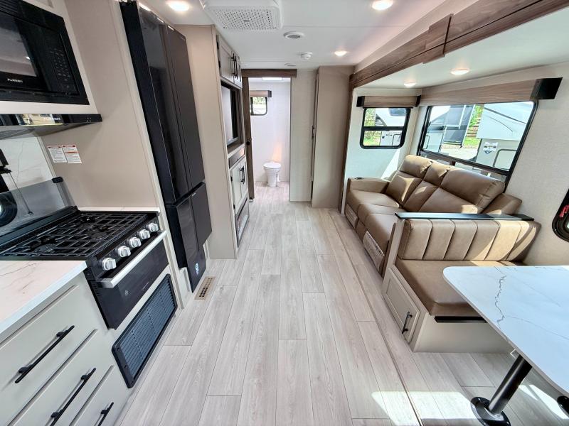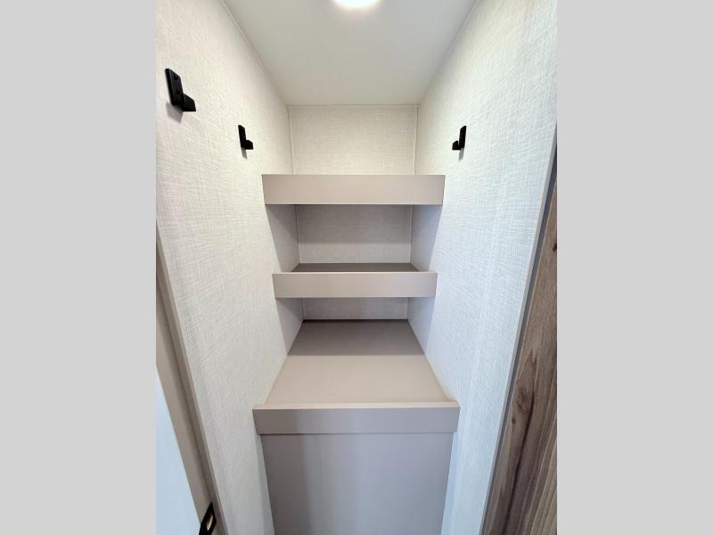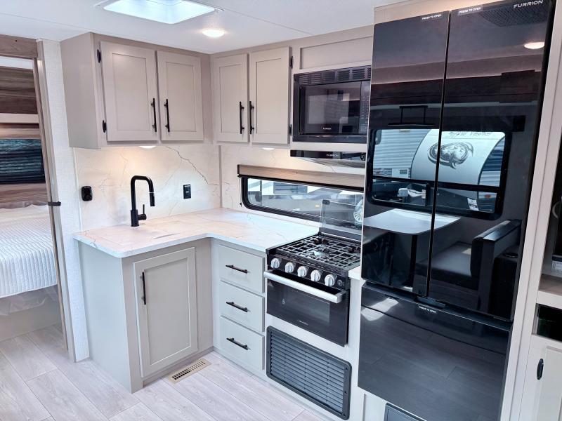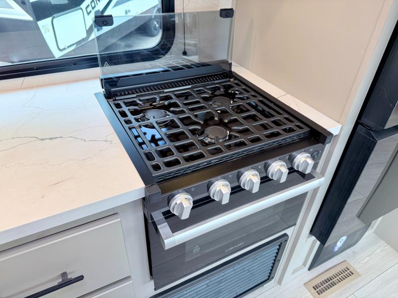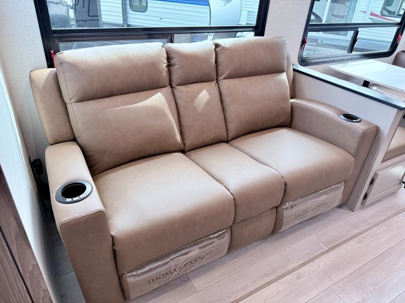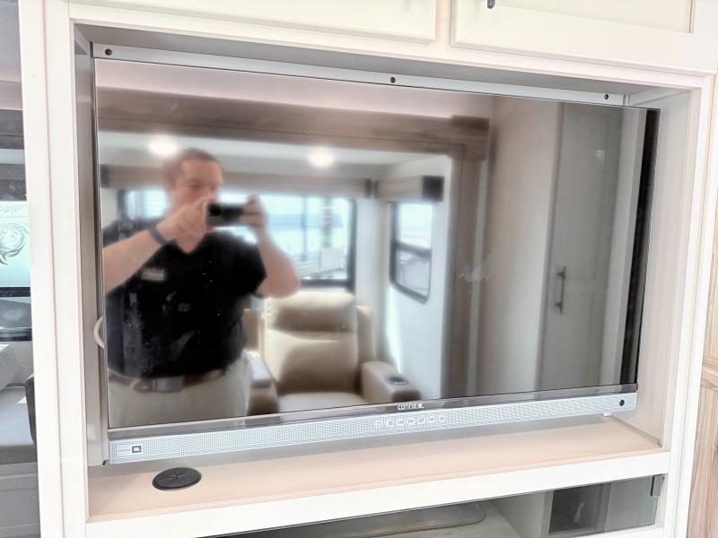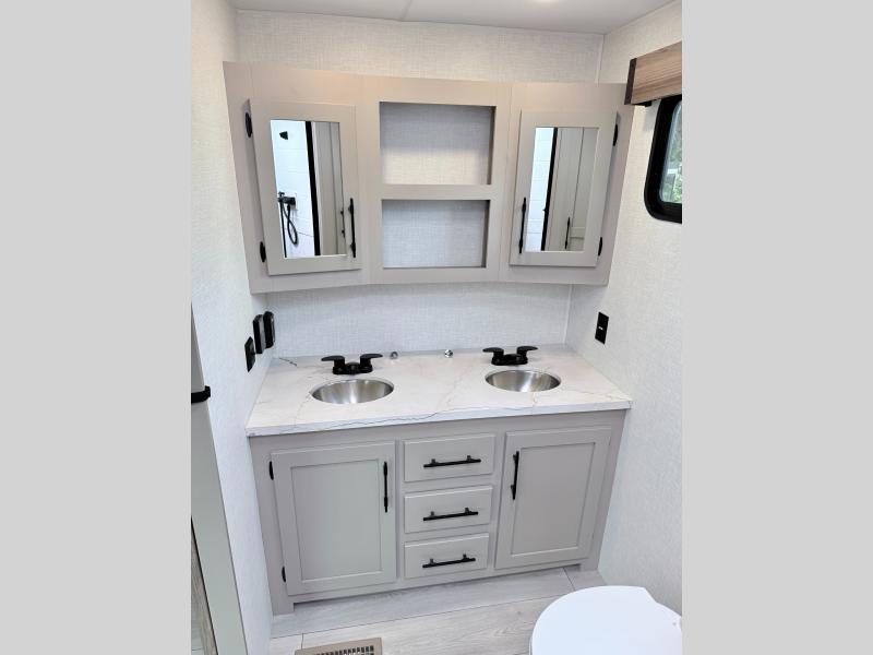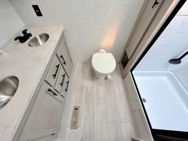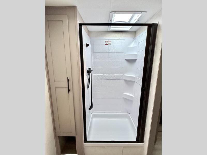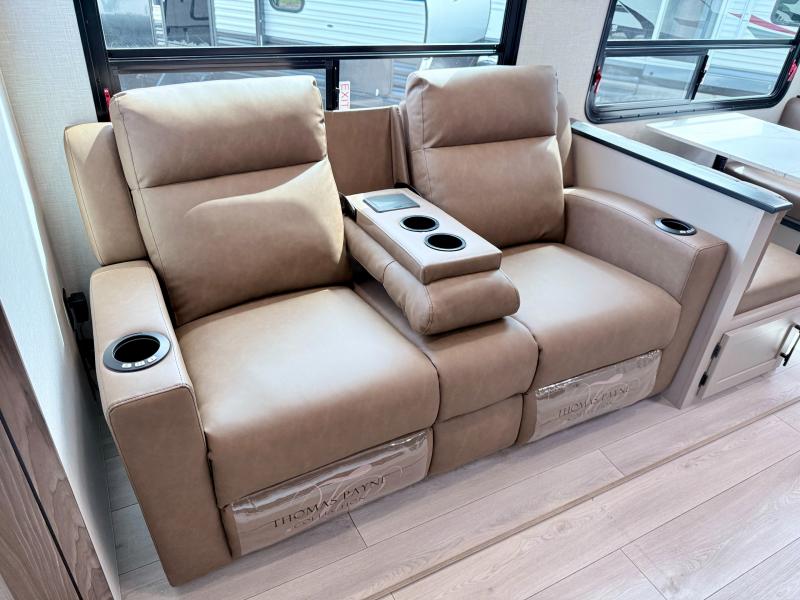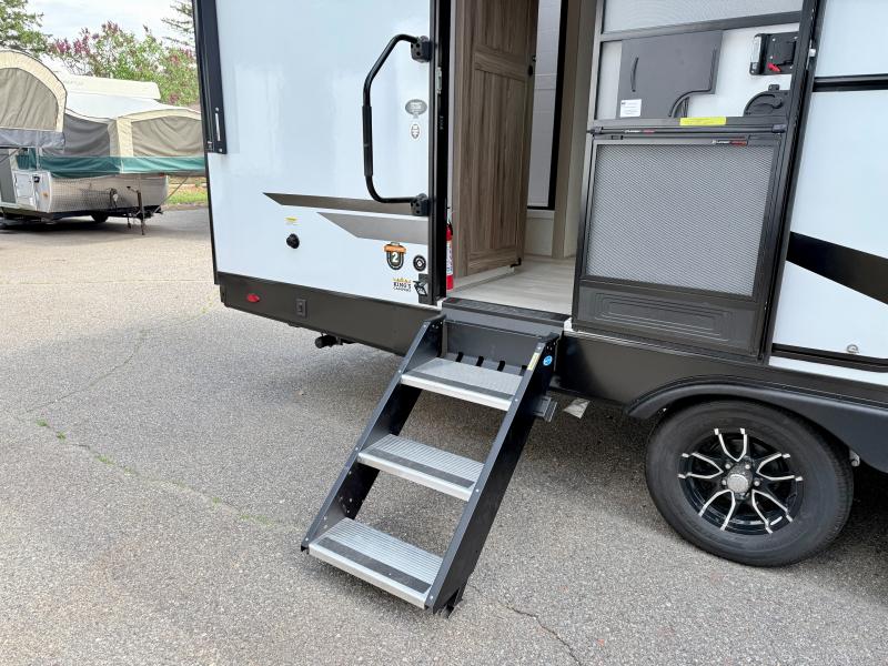 Your needs will be met and your desires will be fulfilled with this Connect travel trailer! Probably the thing you miss most when you camp is your comfortable bed back at home, and that's exactly why this trailer comes with a Serta Comfort foam king mattress in the private bedroom. The other thing you are prone to miss is your bathroom, and the full rear bathroom on this trailer is an excellent replacement with its 30" x 36" shower, skylight, linen closet, MaxxAir vent, porcelain foot-flush toilet, and dual sink vanity. Sit back on the hide-a-bed sofa and enjoy a night of relaxation in front of the LED TV and 34" fireplace. You can even grab a couple of drinks from the 10 cu. ft. 12V refrigerator, snacks from the walk-in pantry with coat hooks, or you can make it a fun evening by playing a game together at the booth dinette.