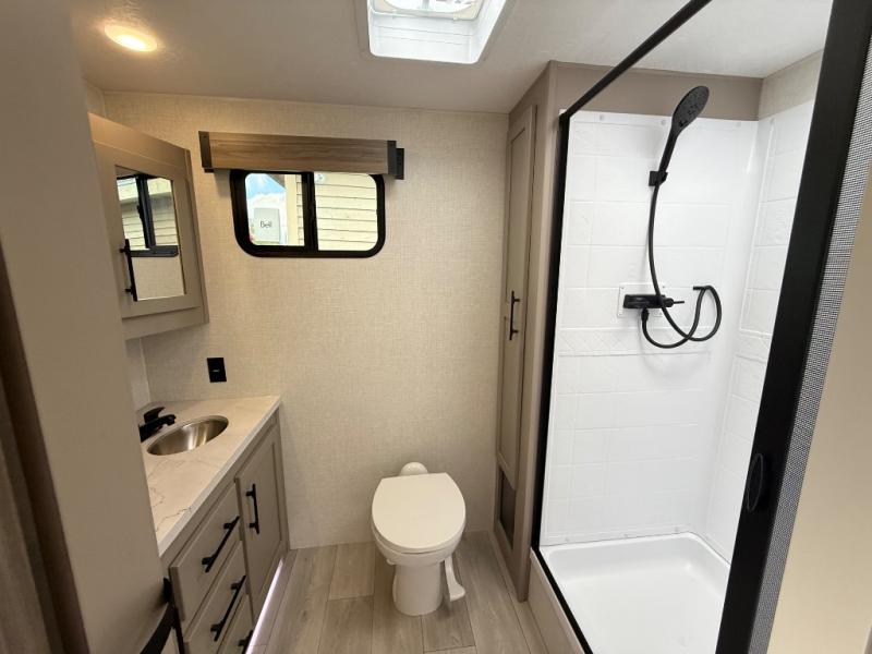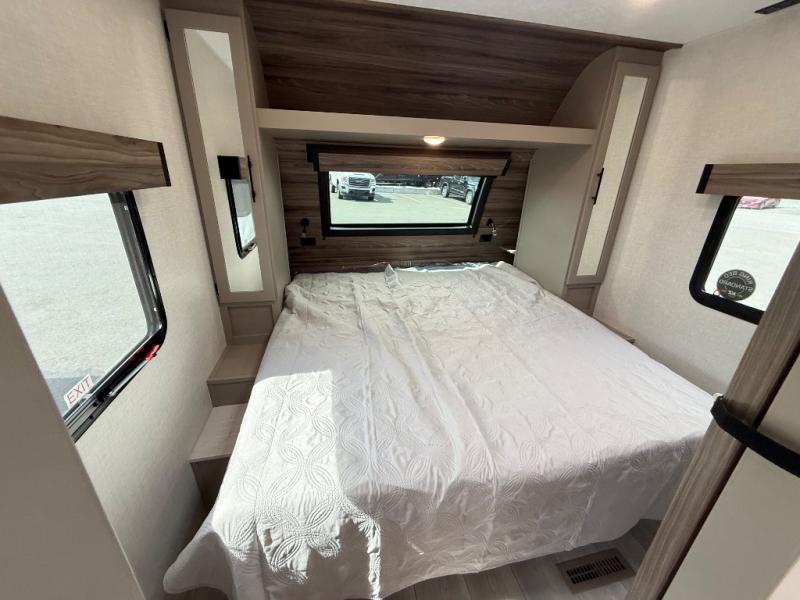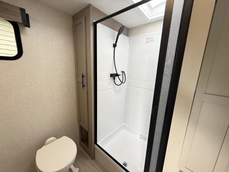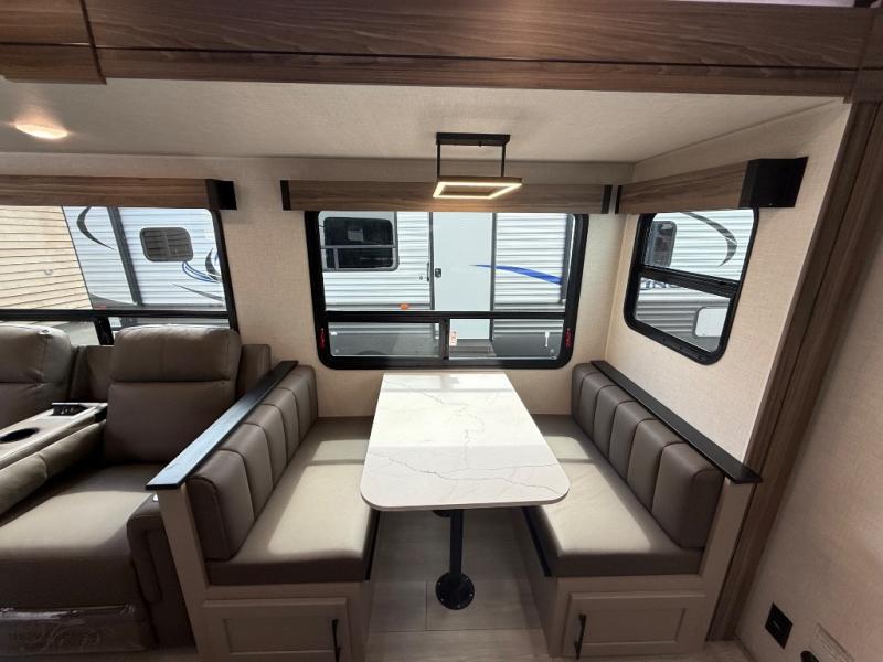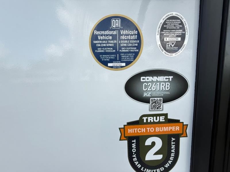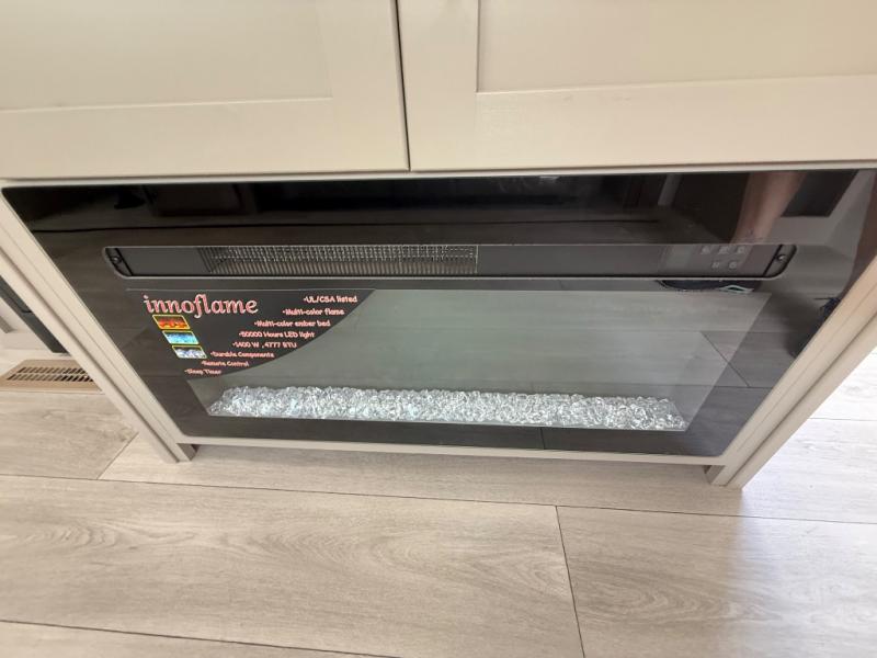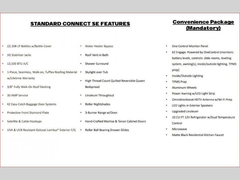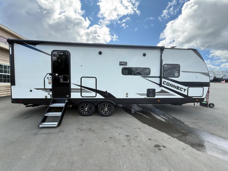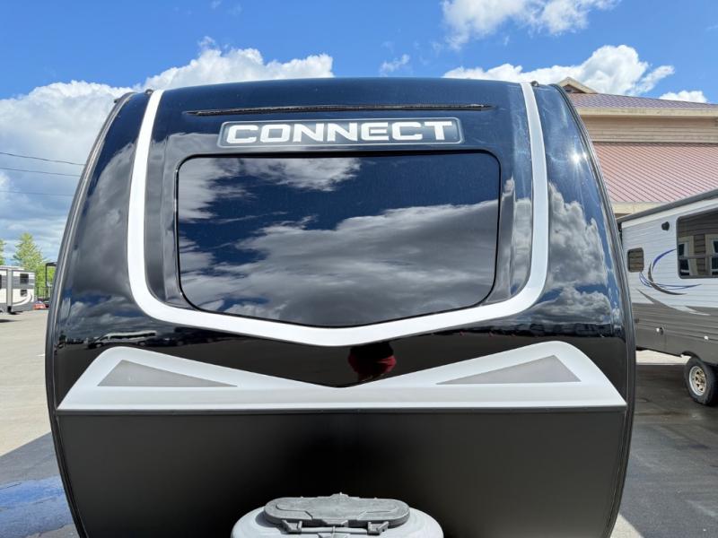 Your needs will be met and your desires will be fulfilled with this Connect travel trailer! Probably the thing you miss most when you camp is your comfortable bed back at home, and that's exactly why this trailer comes with a Serta Comfort foam king mattress in the private bedroom. The other thing you are prone to miss is your bathroom, and the full rear bathroom on this trailer is an excellent replacement with its 30" x 36" shower, skylight, linen closet, MaxxAir vent, porcelain foot-flush toilet, and dual sink vanity. Sit back on the hide-a-bed sofa and enjoy a night of relaxation in front of the LED TV and 34" fireplace. You can even grab a couple of drinks from the 10 cu. ft. 12V refrigerator, snacks from the walk-in pantry with coat hooks, or you can make it a fun evening by playing a game together at the booth dinette.