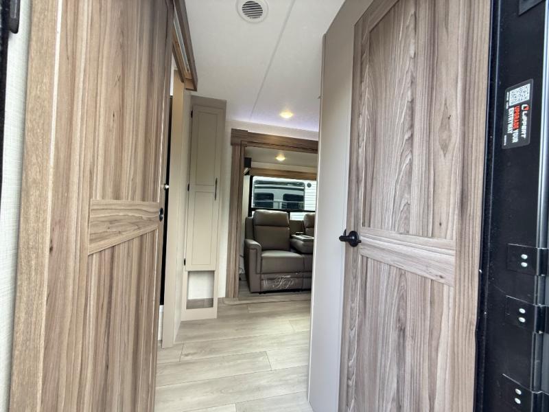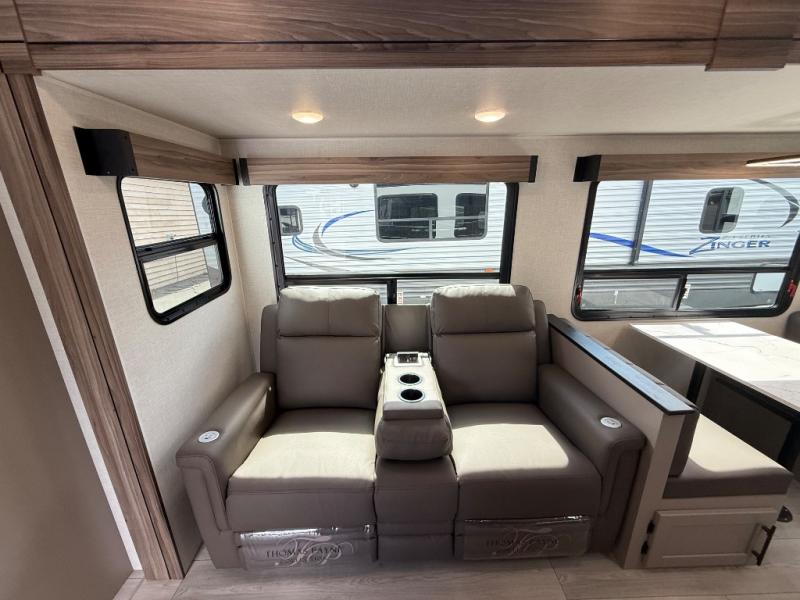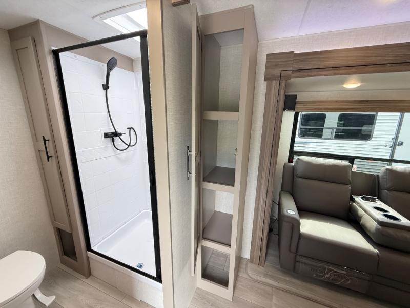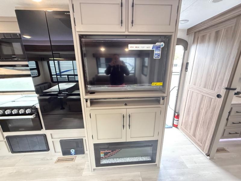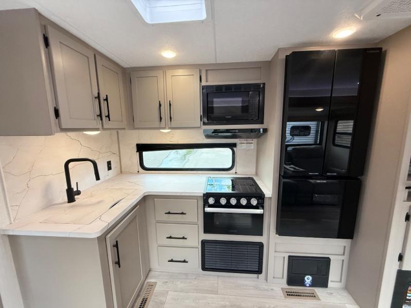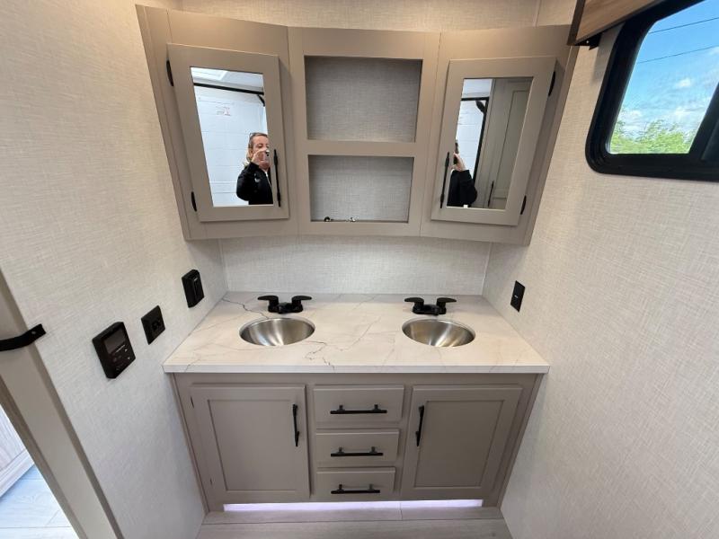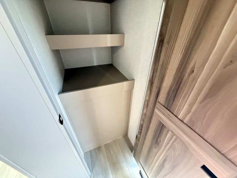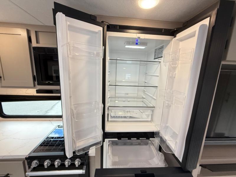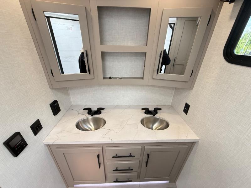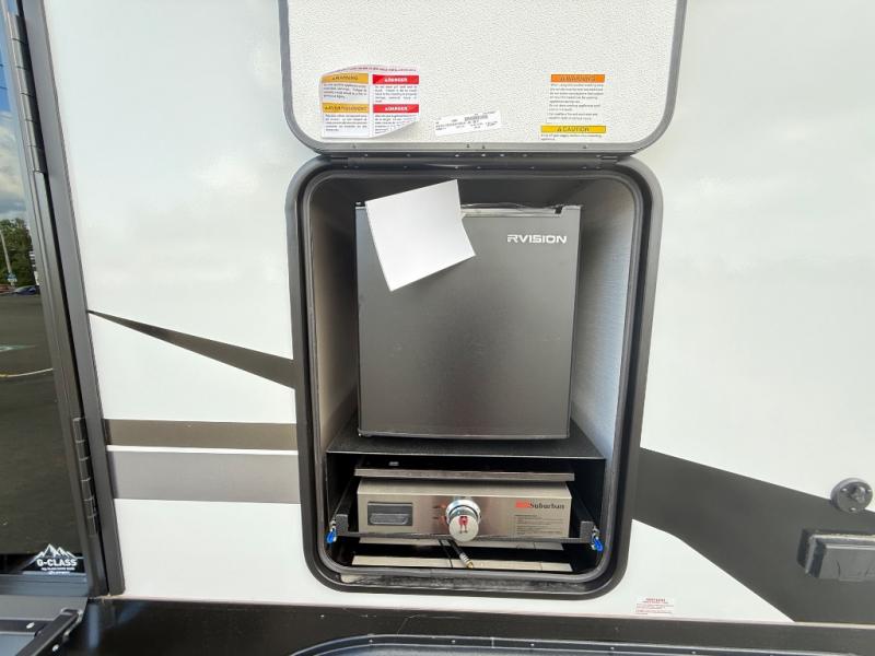 Your needs will be met and your desires will be fulfilled with this Connect travel trailer! Probably the thing you miss most when you camp is your comfortable bed back at home, and that's exactly why this trailer comes with a Serta Comfort foam king mattress in the private bedroom. The other thing you are prone to miss is your bathroom, and the full rear bathroom on this trailer is an excellent replacement with its 30" x 36" shower, skylight, linen closet, MaxxAir vent, porcelain foot-flush toilet, and dual sink vanity. Sit back on the hide-a-bed sofa and enjoy a night of relaxation in front of the LED TV and 34" fireplace. You can even grab a couple of drinks from the 10 cu. ft. 12V refrigerator, snacks from the walk-in pantry with coat hooks, or you can make it a fun evening by playing a game together at the booth dinette.