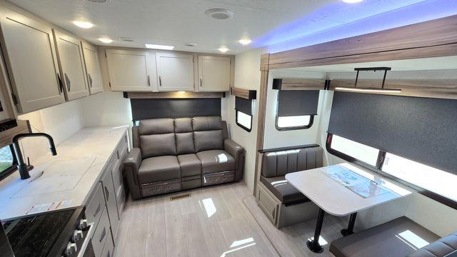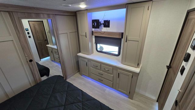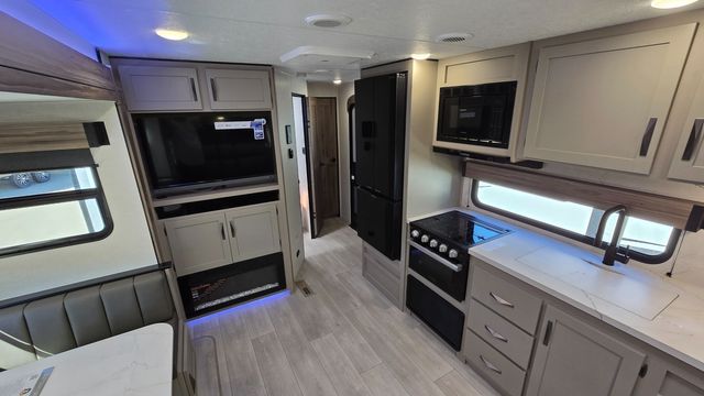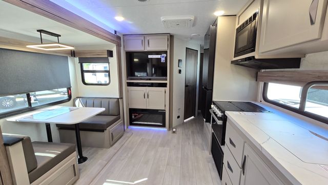 This is the perfect couple's travel trailer! You will enjoy added space in the living area because of the slide that holds the booth dinette or optional table and chairs, and another convenient feature is the dual-entry bathroom that can be accessed from the main hallway or the bedroom. You will be quite surprised to find a king-size bed slide inside the bedroom, along with a walk-in closet with a clothes rod to keep your things organized. A pass-through storage on the exterior allows you to bring along extra gear, and the interior is kept cozy on chilly fall evenings with the 34" fireplace. There is even an outside kitchen to grill up the catch of the day outdoors!