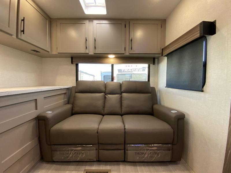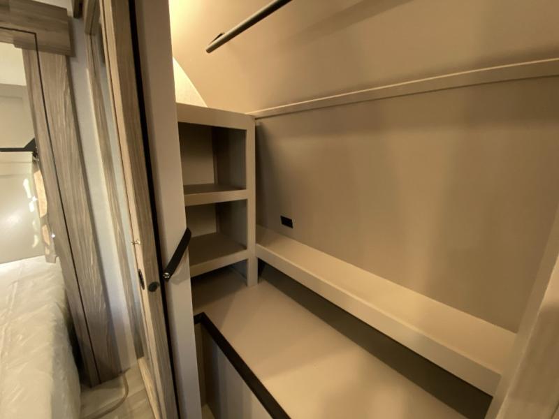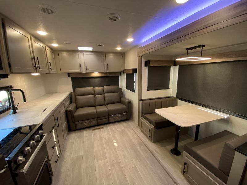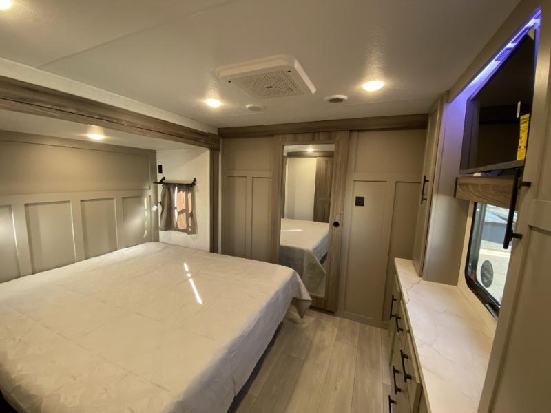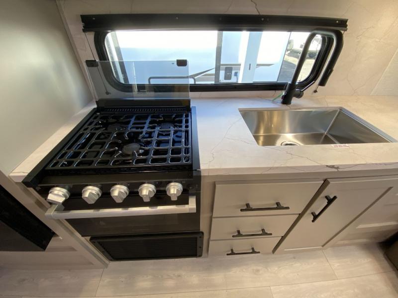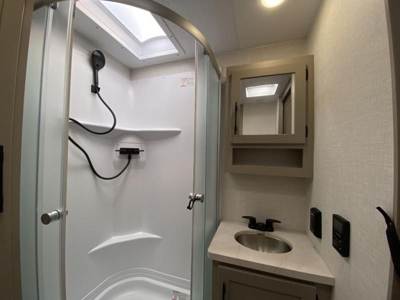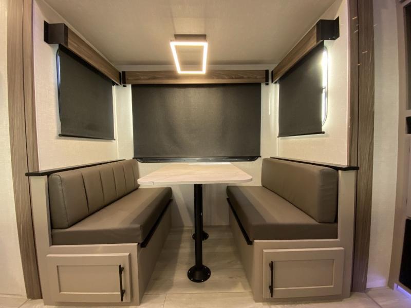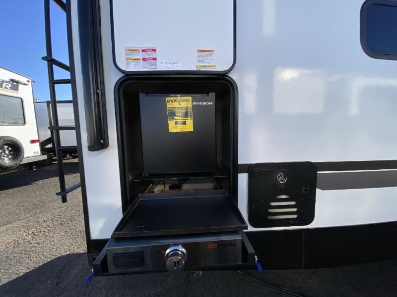 This is the perfect couple's travel trailer! You will enjoy added space in the living area because of the slide that holds the booth dinette and another convenient feature is the dual-entry bathroom that can be accessed from the main hallway or the bedroom. You will be quite surprised to find a king-size bed slide inside the bedroom, along with a walk-in closet with a clothes rod to keep your things organized. A pass-through storage on the exterior allows you to bring along extra gear, and the interior is kept cozy on chilly fall evenings with the 34" fireplace. There is even an outside kitchen to grill up the catch of the day outdoors!