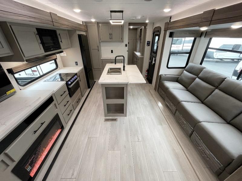 The perfect couple's trailer is found in this Connect! After you wake up each morning on the king bed slide, you can use the walk-in closet to get ready for the day. There is also a dresser here and a TV mount if you want the option to watch movies in bed. A three burner range and microwave oven in the full kitchen will let you make breakfast before heading out for the day, and the theater seating will provide a place to relax once you get back. The entertainment center with a fireplace will make this room feel more like home, and the kitchen island includes ample counter space with its flip-up top. The full rear bath includes dual bath sinks so you both can get ready at the same time, and the wardrobe with washer and dryer prep gives you the option to add these appliances.