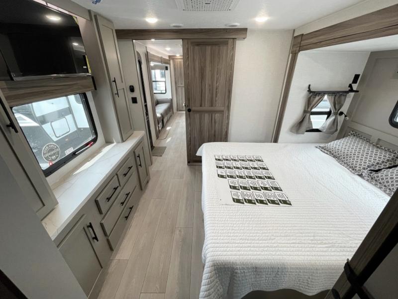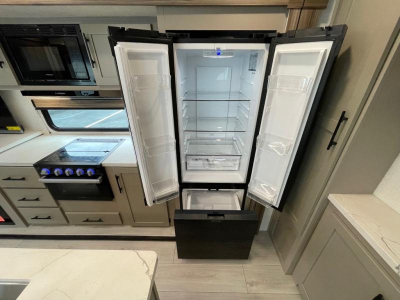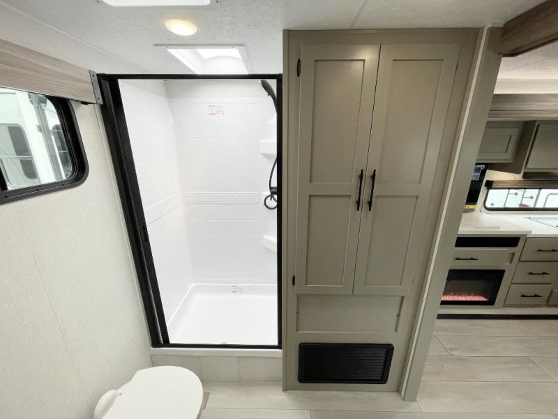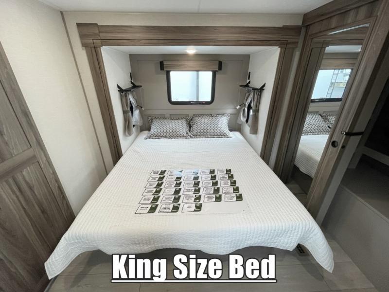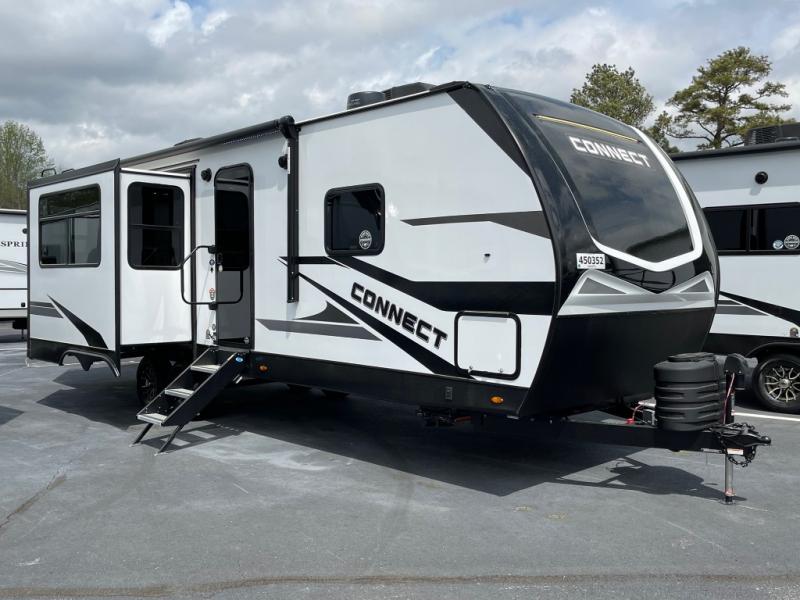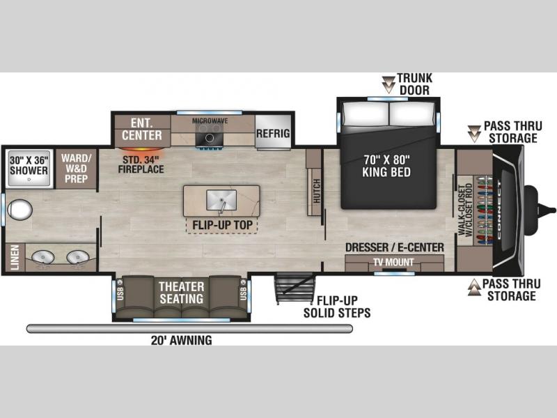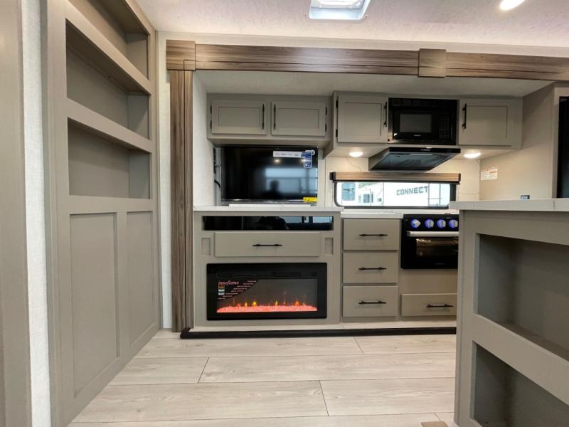 The perfect couple's trailer is found in this Connect! After you wake up each morning on the king bed slide, you can use the walk-in closet to get ready for the day. There is also a dresser here and a TV mount if you want the option to watch movies in bed. A three burner range and microwave oven in the full kitchen will let you make breakfast before heading out for the day, and the theater seating will provide a place to relax once you get back. The entertainment center with a fireplace will make this room feel more like home, and the kitchen island includes ample counter space with its flip-up top. The full rear bath includes dual bath sinks so you both can get ready at the same time, and the wardrobe with washer and dryer prep gives you the option to add these appliances.