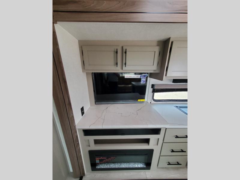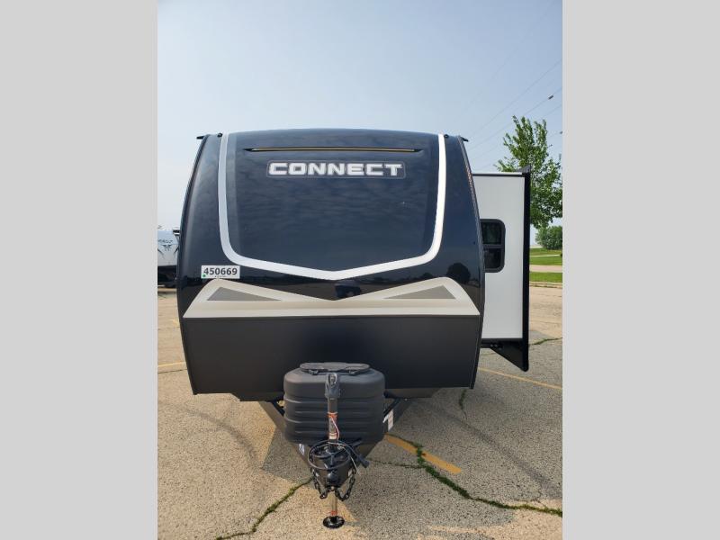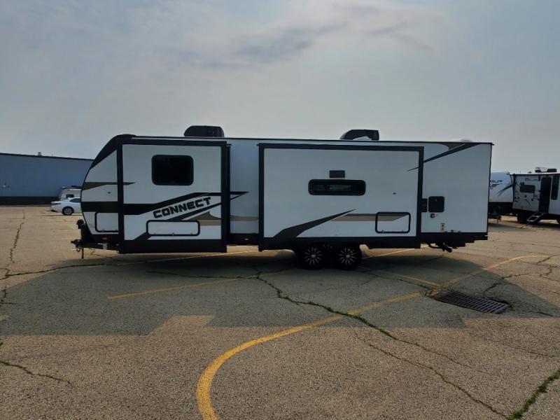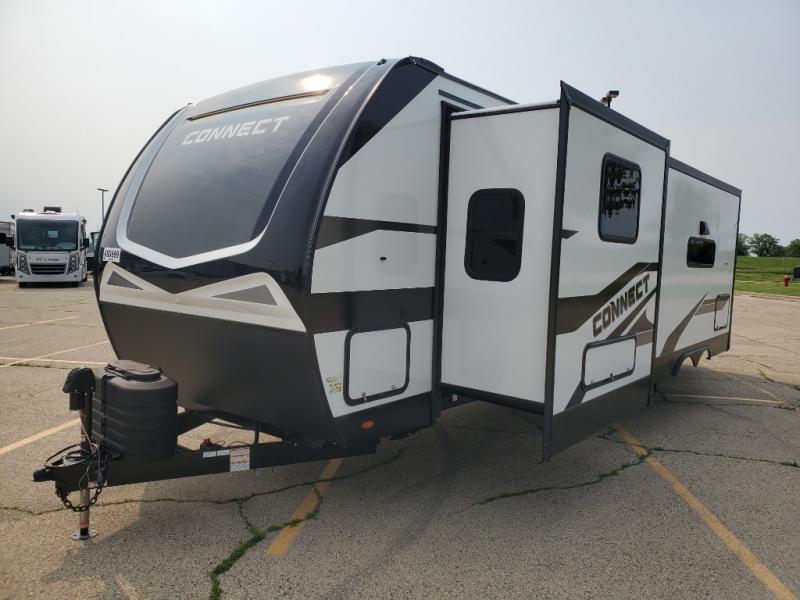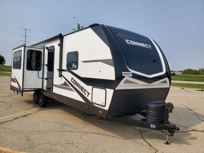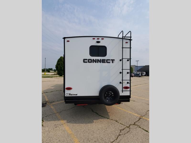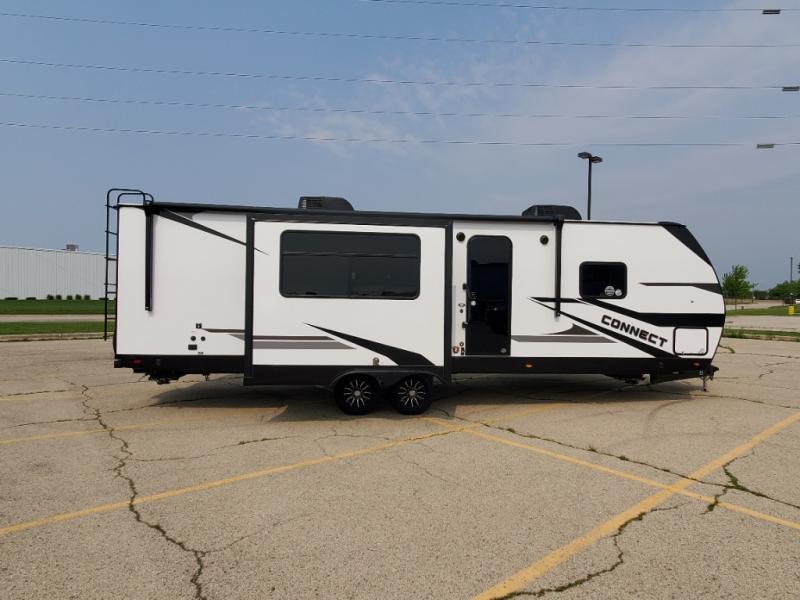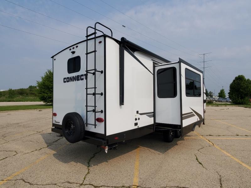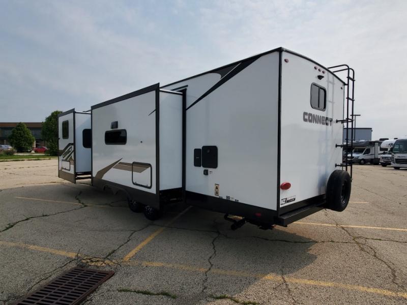 The perfect couple's trailer is found in this Connect! After you wake up each morning on the king bed slide, you can use the walk-in closet to get ready for the day. There is also a dresser here and a TV mount if you want the option to watch movies in bed. A three burner range and microwave oven in the full kitchen will let you make breakfast before heading out for the day, and the theater seating will provide a place to relax once you get back. The entertainment center with a fireplace will make this room feel more like home, and the kitchen island includes ample counter space with its flip-up top. The full rear bath includes dual bath sinks so you both can get ready at the same time, and the wardrobe with washer and dryer prep gives you the option to add these appliances.