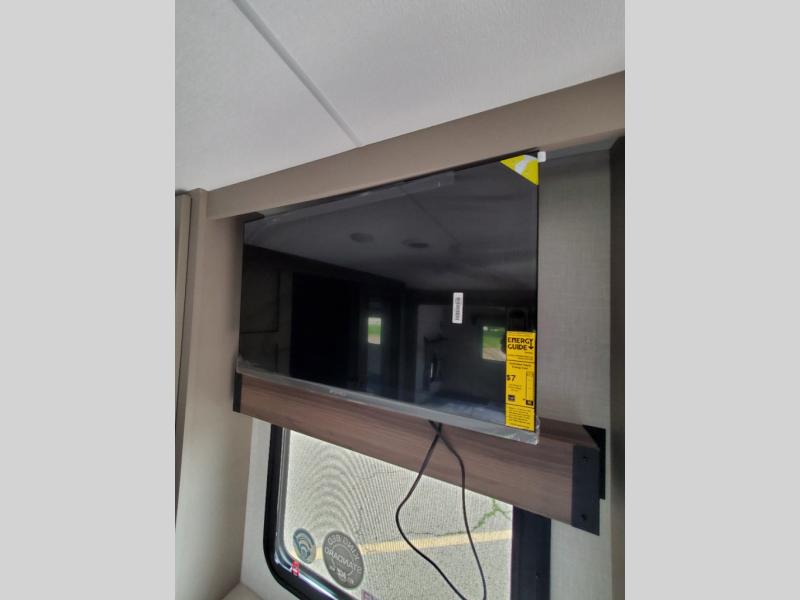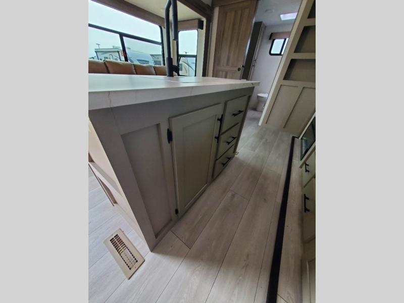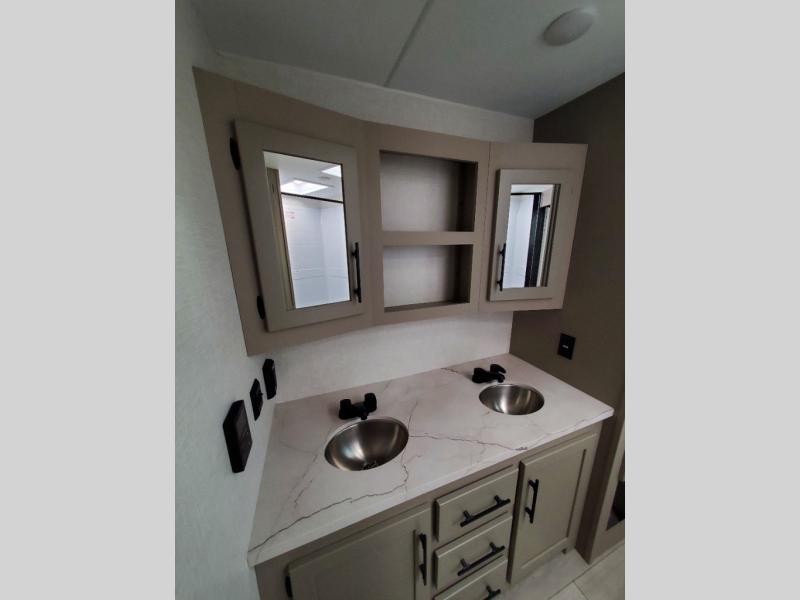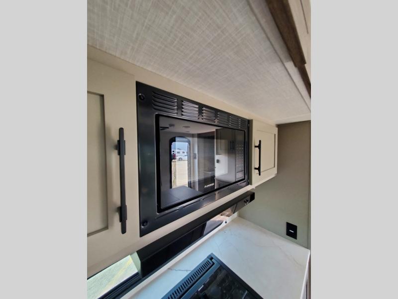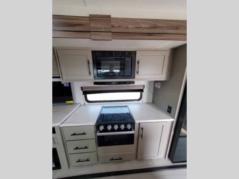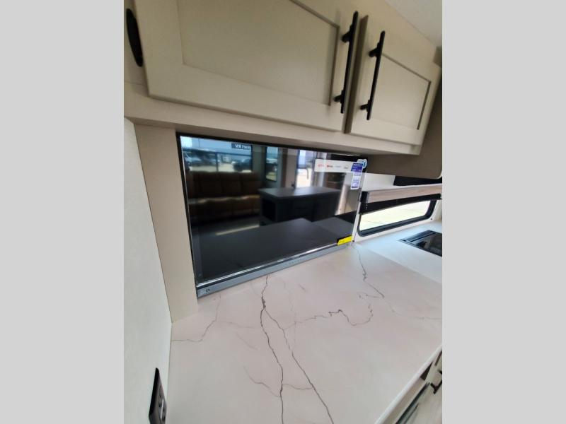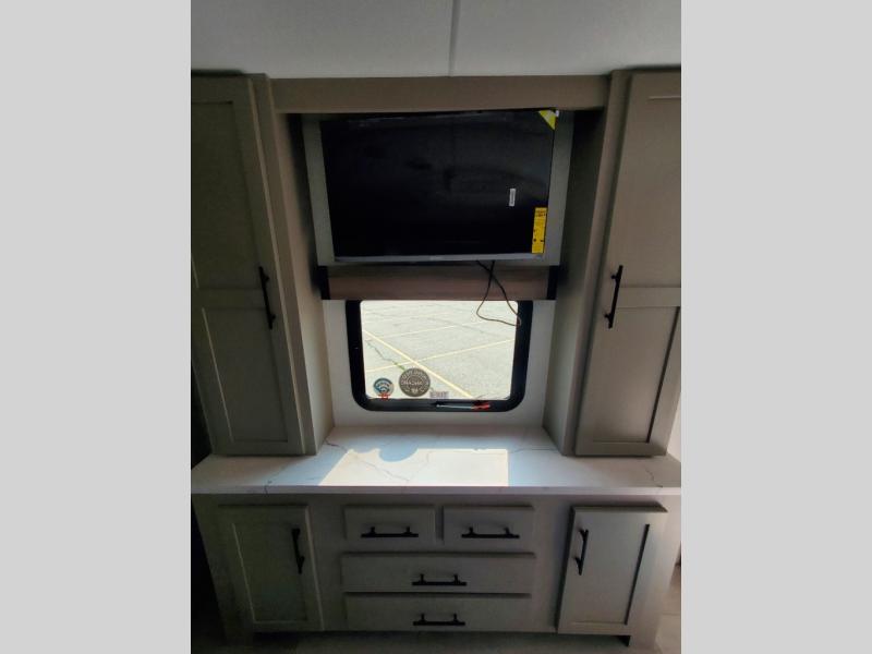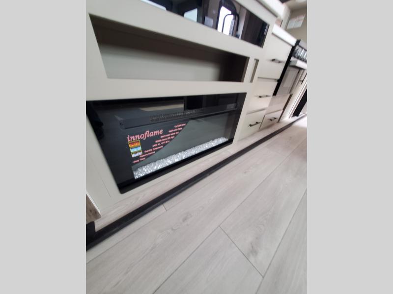 The perfect couple's trailer is found in this Connect! After you wake up each morning on the king bed slide, you can use the walk-in closet to get ready for the day. There is also a dresser here and a TV mount if you want the option to watch movies in bed. A three burner range and microwave oven in the full kitchen will let you make breakfast before heading out for the day, and the theater seating will provide a place to relax once you get back. The entertainment center with a fireplace will make this room feel more like home, and the kitchen island includes ample counter space with its flip-up top. The full rear bath includes dual bath sinks so you both can get ready at the same time, and the wardrobe with washer and dryer prep gives you the option to add these appliances.