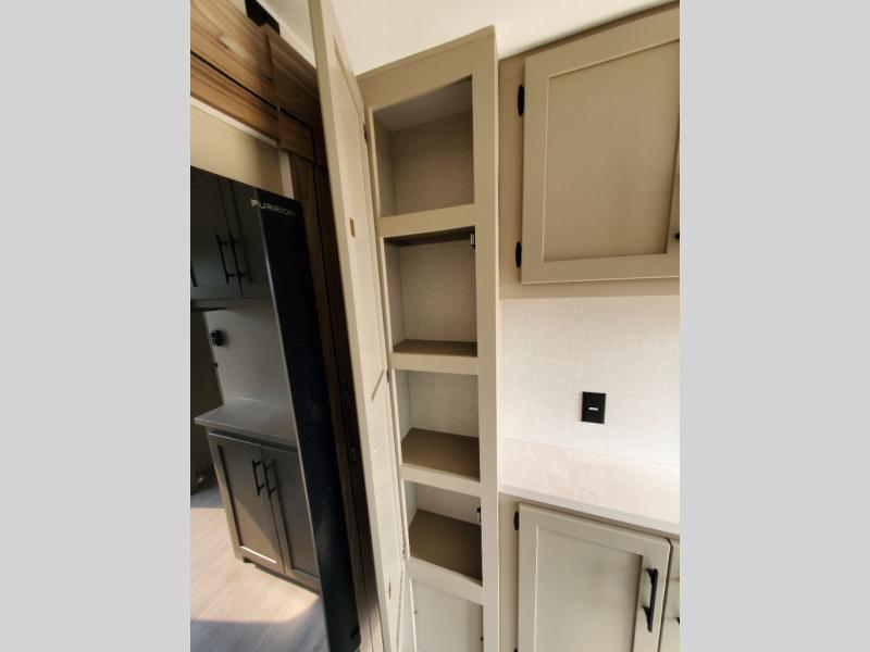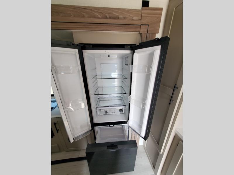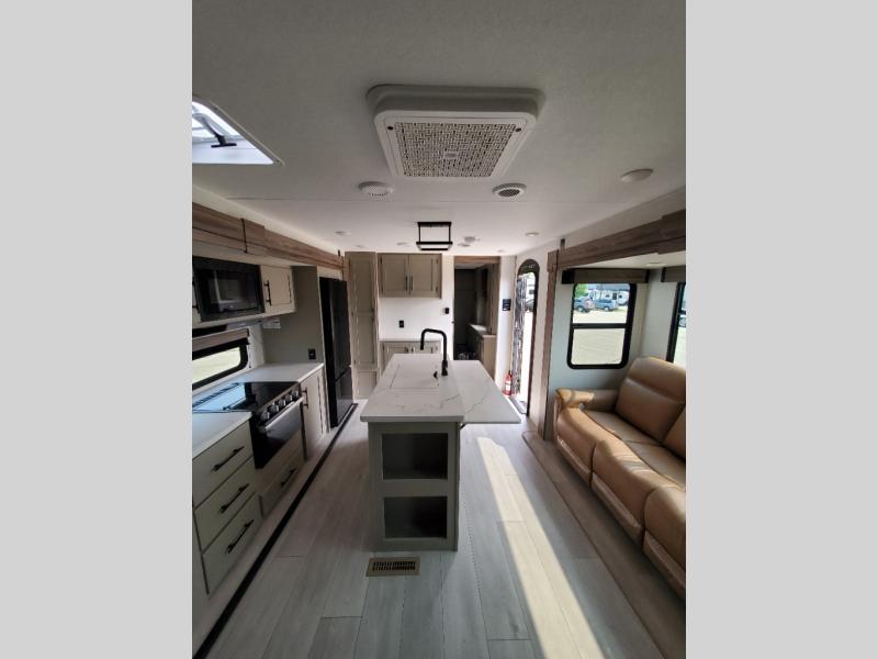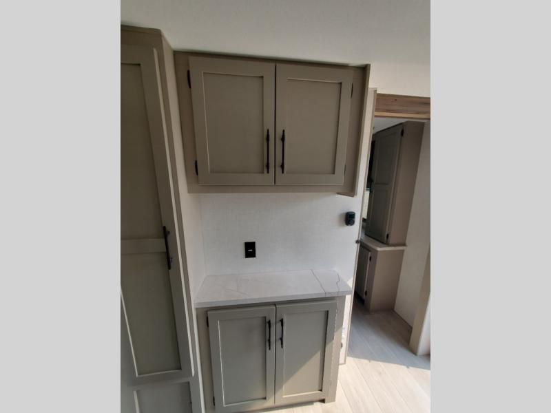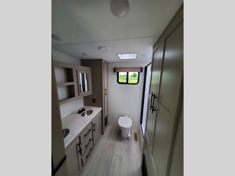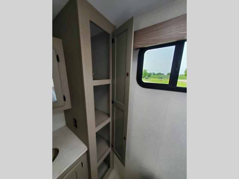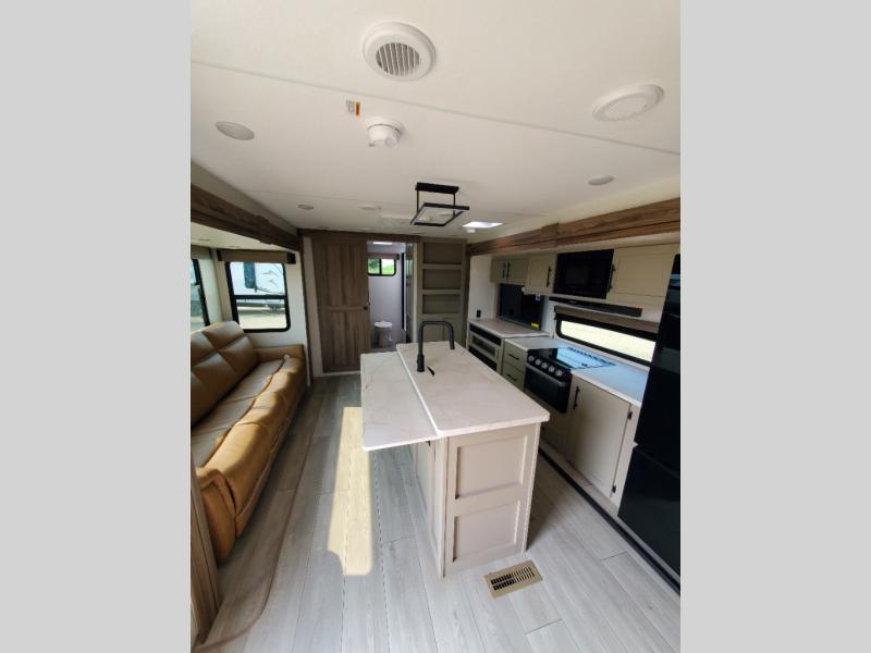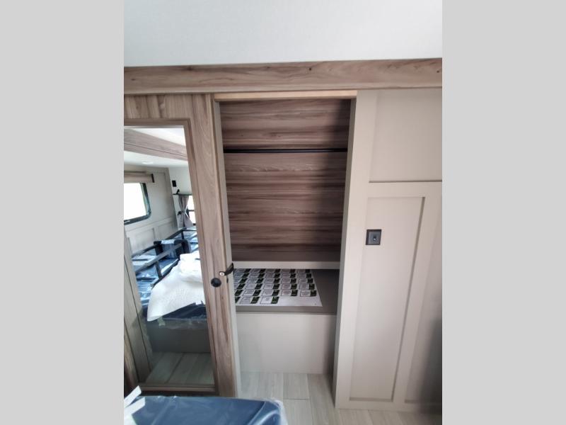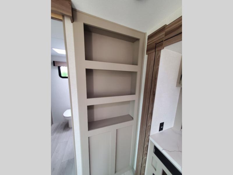 The perfect couple's trailer is found in this Connect! After you wake up each morning on the king bed slide, you can use the walk-in closet to get ready for the day. There is also a dresser here and a TV mount if you want the option to watch movies in bed. A three burner range and microwave oven in the full kitchen will let you make breakfast before heading out for the day, and the theater seating will provide a place to relax once you get back. The entertainment center with a fireplace will make this room feel more like home, and the kitchen island includes ample counter space with its flip-up top. The full rear bath includes dual bath sinks so you both can get ready at the same time, and the wardrobe with washer and dryer prep gives you the option to add these appliances.