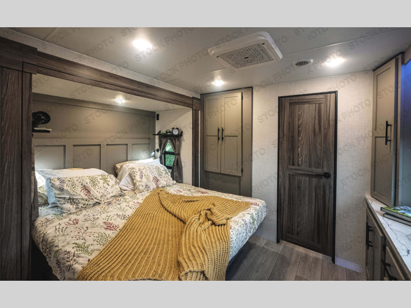 Pack your bags and head to the lake in this cozy travel trailer for five. Once you unload your gear from the pass-through storage, prepare a quick lunch on the mini outside kitchen with a griddle and relax under the patio awning. If the weather is raining on your parade, just head indoors to cook on the three burner cooktop, and you'll find ample counter space in this rear kitchen to set out drinks and sides. Your crew can relax on the hide-a-bed sofa and booth dinette within the large slide out, and there is an LED TV and a 34" fireplace for a more at-home atmosphere. One of your favorite features of this trailer will probably be the master suite with a king bed slide out, a dresser and an entertainment center, plus easy access to the front full bath. Here, you'll find dual bath sinks, a spacious shower, plus a walk-in closet with a closet rod to keep your outfits wrinkle free. There is even a wardrobe in the bedroom with washer and dryer prep so you can keep all those clothes fresh and clean!
