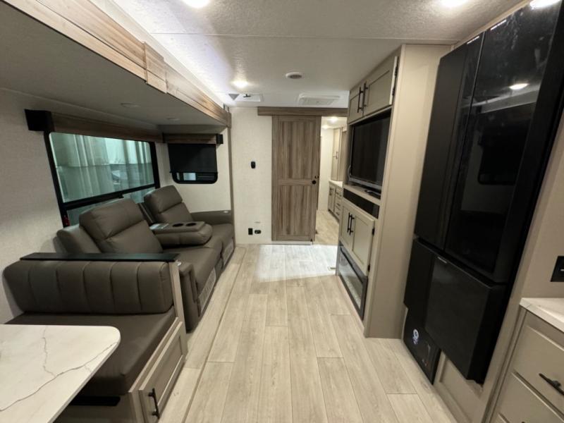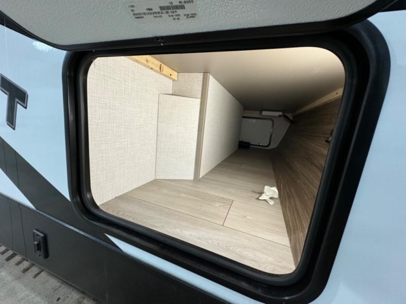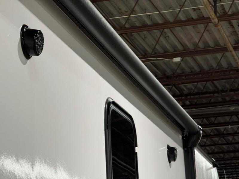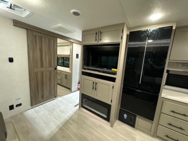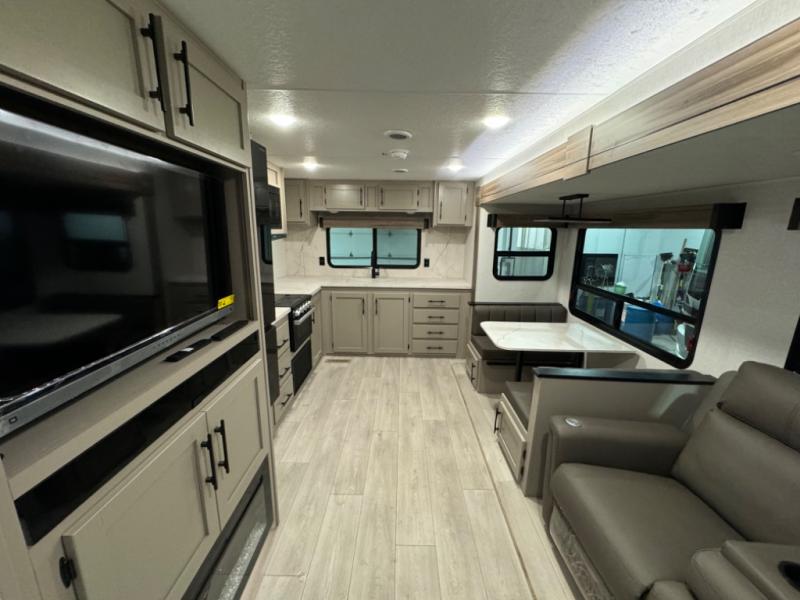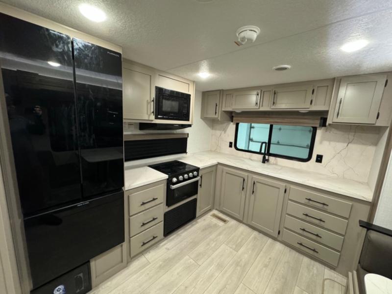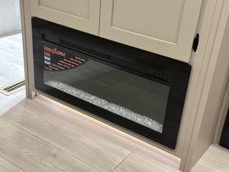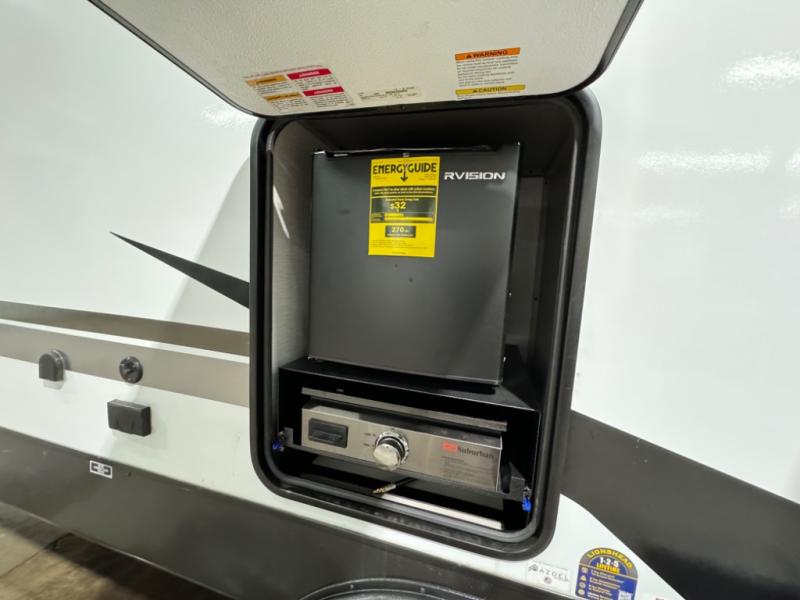 Pack your bags and head to the lake in this cozy RV for five. Once you unload your gear from the pass-through storage, prepare a quick lunch on the mini outside kitchen with a griddle and relax under the patio awning. If the weather is raining on your parade, just head indoors to cook on the three burner cooktop, and you'll find ample counter space in this rear kitchen to set out drinks and sides. Your crew can relax on the hide-a-bed sofa and booth dinette within the large slide out, and there is an LED TV and a 34" fireplace for a more at-home atmosphere. One of your favorite features of this trailer will probably be the master suite with a king bed slide out, a dresser and an entertainment center, plus easy access to the front full bath. Here, you'll find dual bath sinks, a spacious shower, plus a walk-in closet with a closet rod to keep your outfits wrinkle free. There is even a wardrobe in the bedroom with washer and dryer prep so you can keep all those clothes fresh and clean!