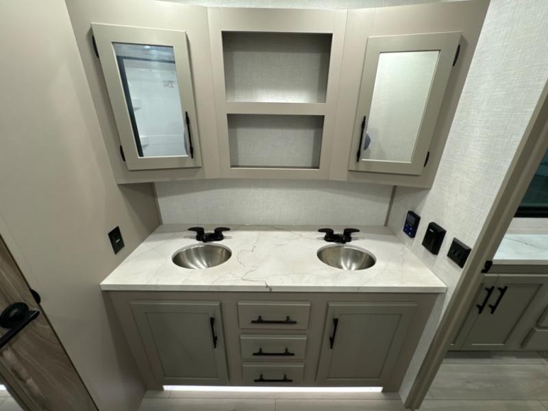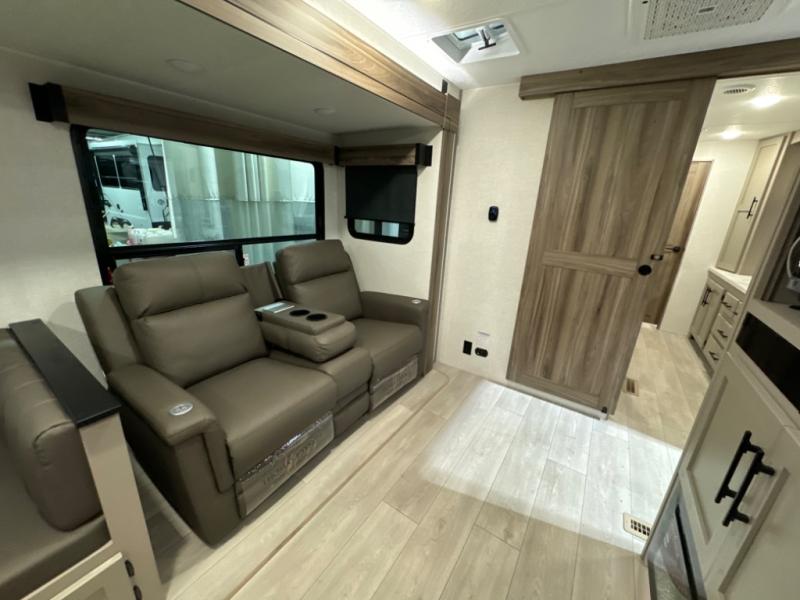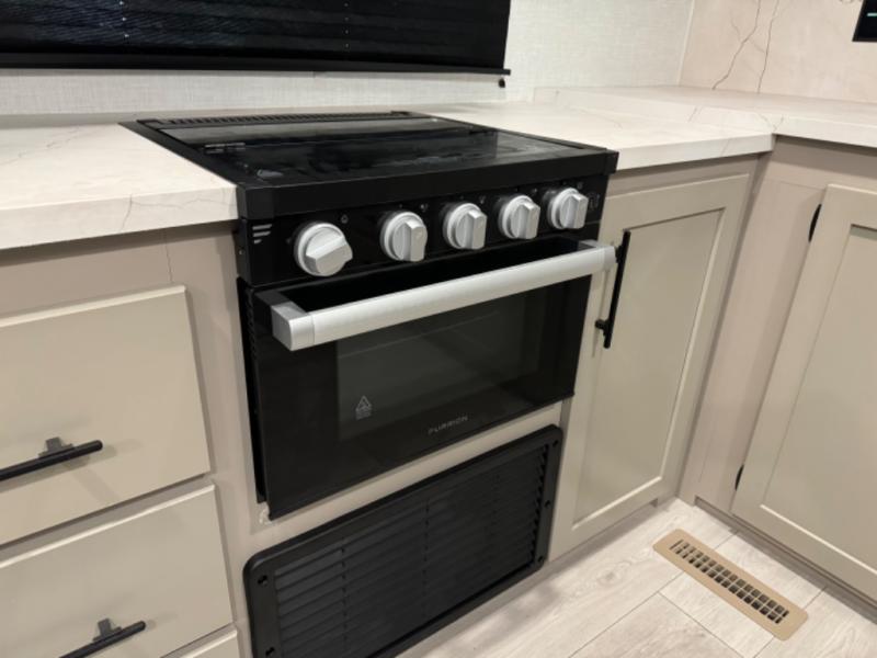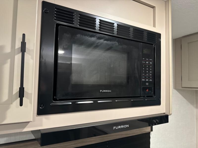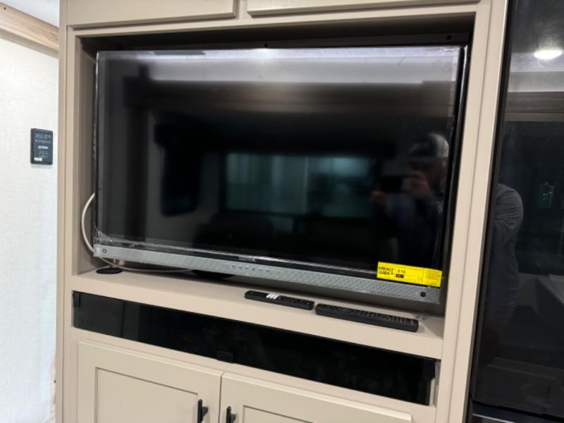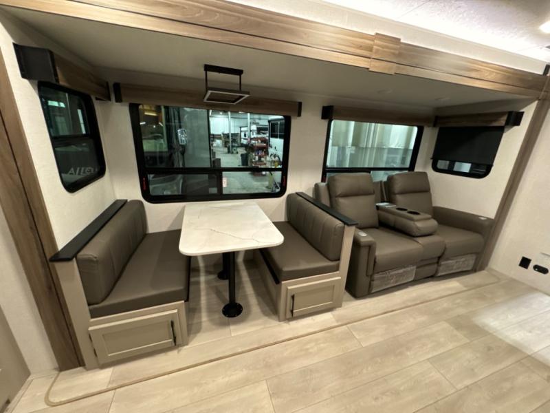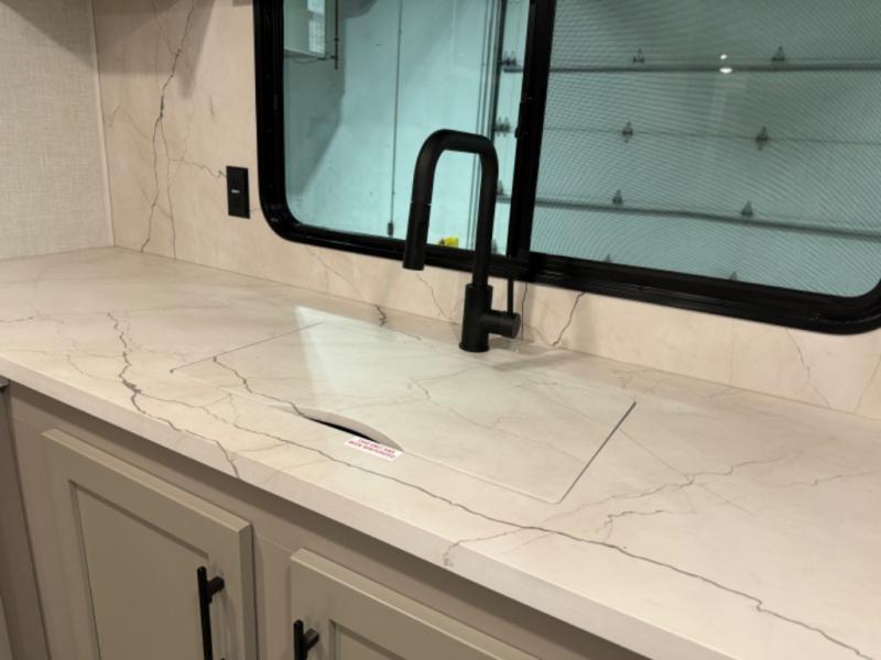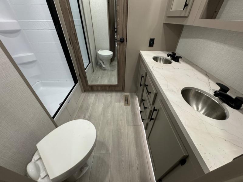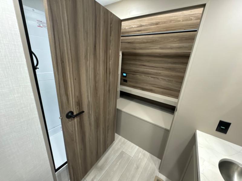 Pack your bags and head to the lake in this cozy RV for five. Once you unload your gear from the pass-through storage, prepare a quick lunch on the mini outside kitchen with a griddle and relax under the patio awning. If the weather is raining on your parade, just head indoors to cook on the three burner cooktop, and you'll find ample counter space in this rear kitchen to set out drinks and sides. Your crew can relax on the hide-a-bed sofa and booth dinette within the large slide out, and there is an LED TV and a 34" fireplace for a more at-home atmosphere. One of your favorite features of this trailer will probably be the master suite with a king bed slide out, a dresser and an entertainment center, plus easy access to the front full bath. Here, you'll find dual bath sinks, a spacious shower, plus a walk-in closet with a closet rod to keep your outfits wrinkle free. There is even a wardrobe in the bedroom with washer and dryer prep so you can keep all those clothes fresh and clean!