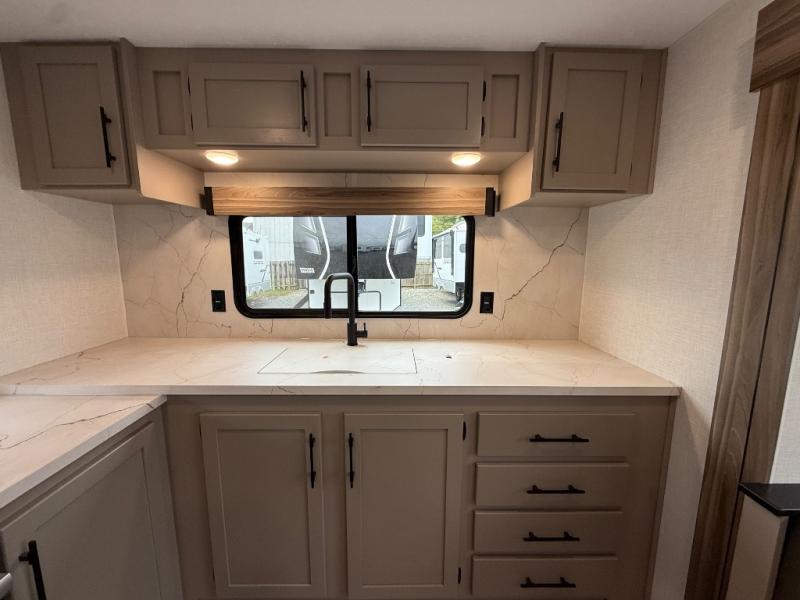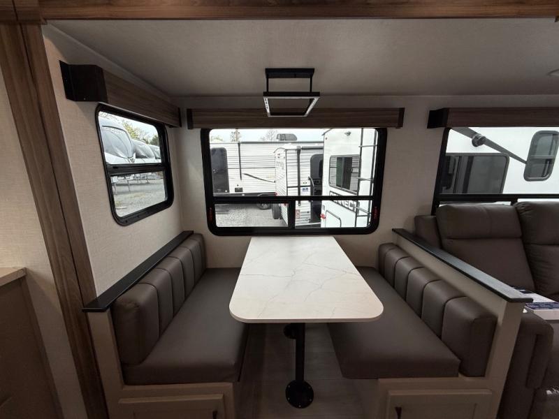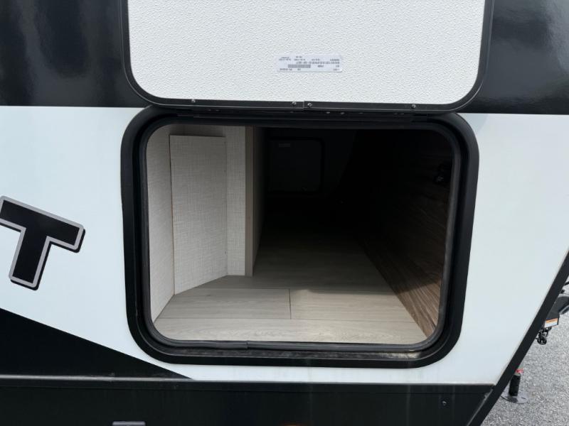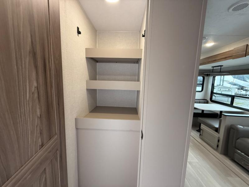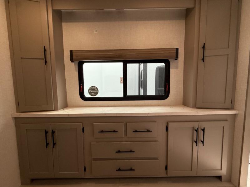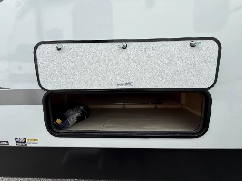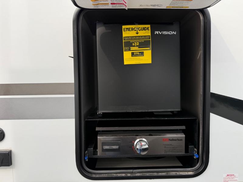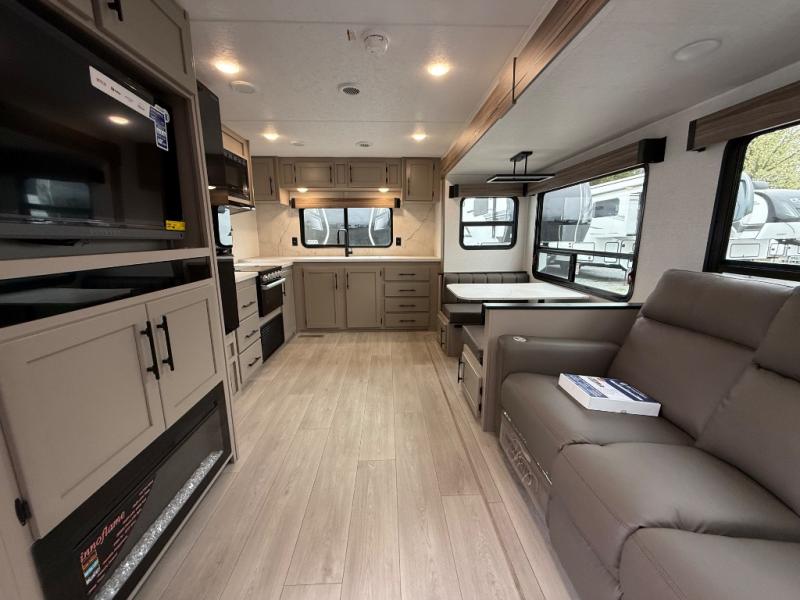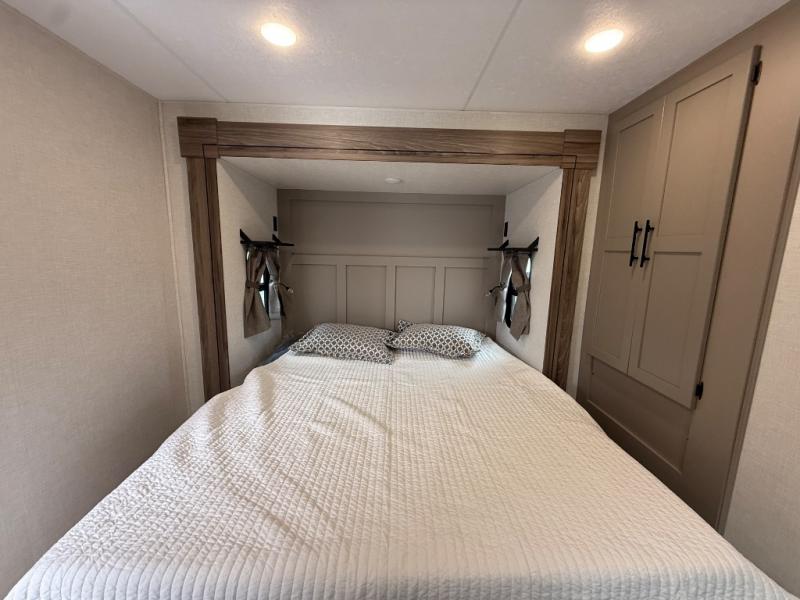 Pack your bags and head to the lake in this cozy travel trailer for five. Once you unload your gear from the pass-through storage, prepare a quick lunch on the mini outside kitchen with a griddle and relax under the patio awning. If the weather is raining on your parade, just head indoors to cook on the three burner cooktop, and you'll find ample counter space in this rear kitchen to set out drinks and sides. Your crew can relax on the hide-a-bed sofa and booth dinette within the large slide out, and there is an LED TV and a 34" fireplace for a more at-home atmosphere. One of your favorite features of this trailer will probably be the master suite with a king bed slide out, a dresser and an entertainment center, plus easy access to the front full bath. Here, you'll find dual bath sinks, a spacious shower, plus a walk-in closet with a closet rod to keep your outfits wrinkle free. There is even a wardrobe in the bedroom with washer and dryer prep so you can keep all those clothes fresh and clean!