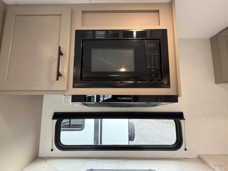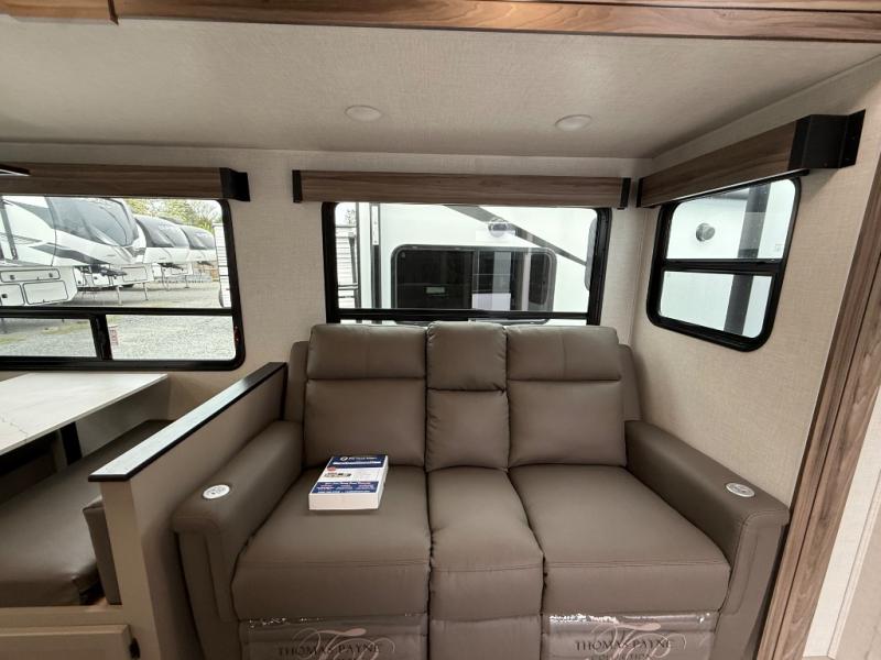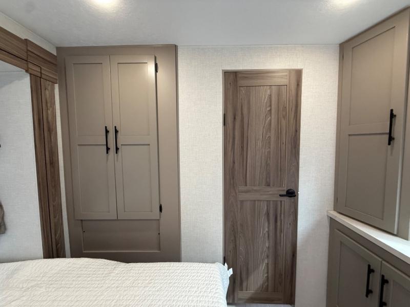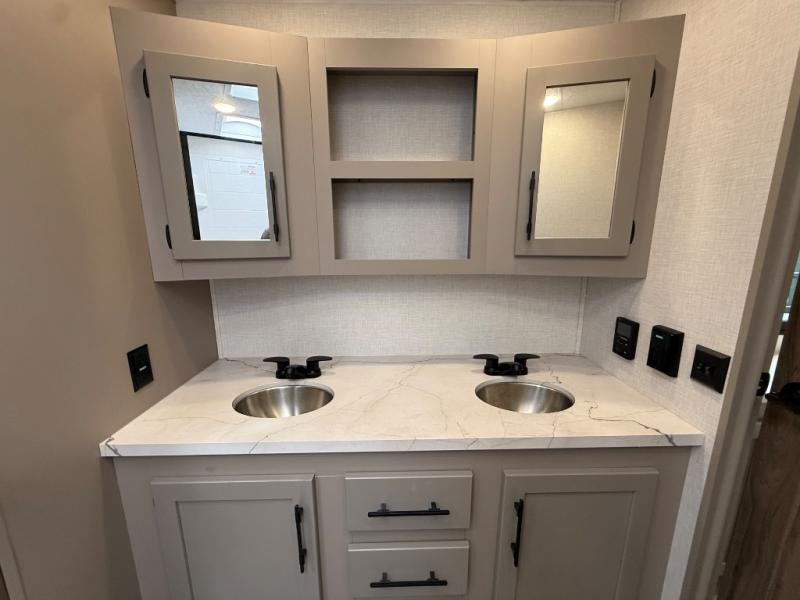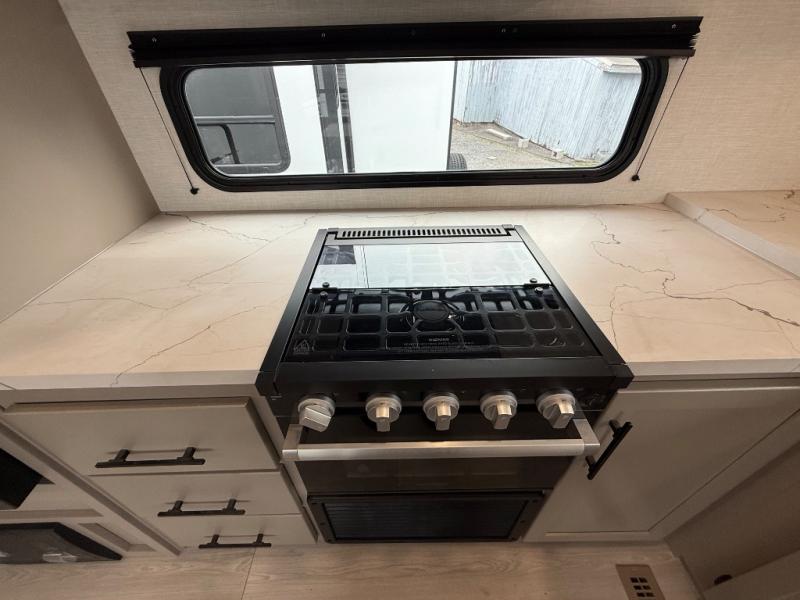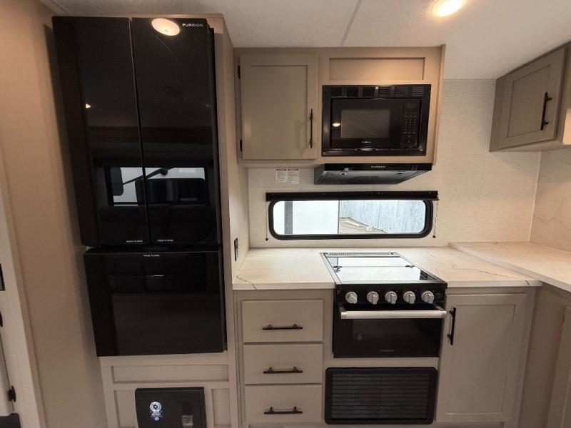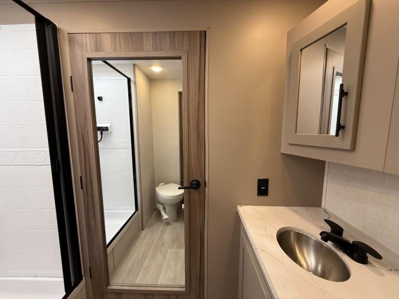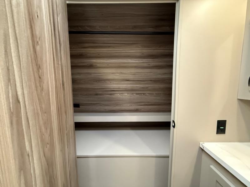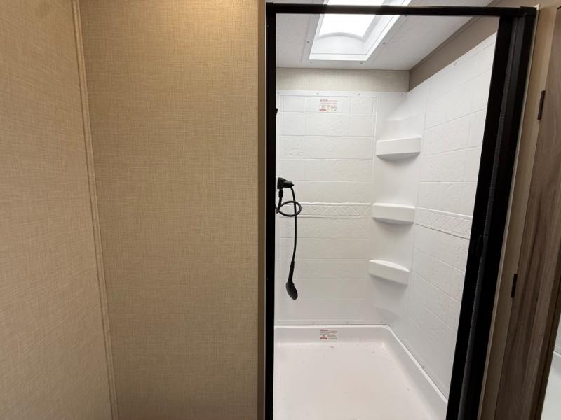 Pack your bags and head to the lake in this cozy travel trailer for five. Once you unload your gear from the pass-through storage, prepare a quick lunch on the mini outside kitchen with a griddle and relax under the patio awning. If the weather is raining on your parade, just head indoors to cook on the three burner cooktop, and you'll find ample counter space in this rear kitchen to set out drinks and sides. Your crew can relax on the hide-a-bed sofa and booth dinette within the large slide out, and there is an LED TV and a 34" fireplace for a more at-home atmosphere. One of your favorite features of this trailer will probably be the master suite with a king bed slide out, a dresser and an entertainment center, plus easy access to the front full bath. Here, you'll find dual bath sinks, a spacious shower, plus a walk-in closet with a closet rod to keep your outfits wrinkle free. There is even a wardrobe in the bedroom with washer and dryer prep so you can keep all those clothes fresh and clean!
