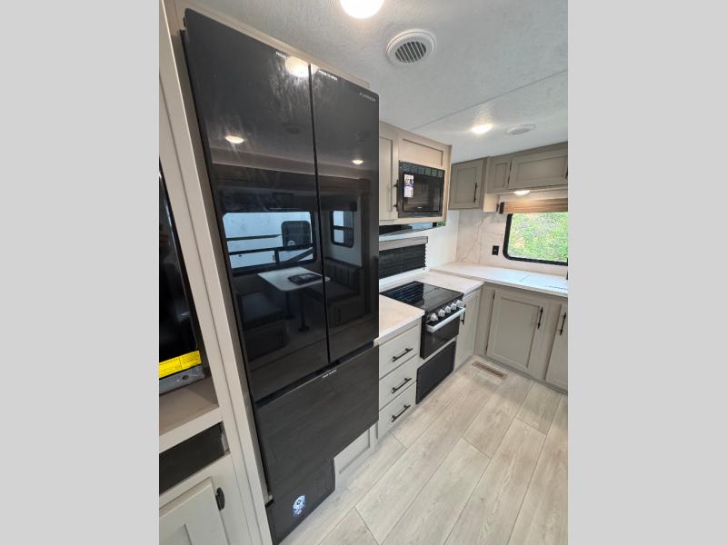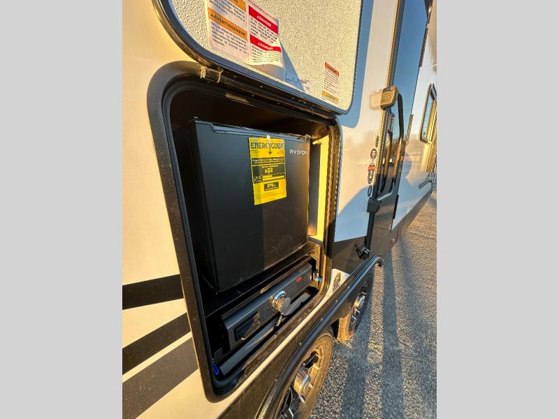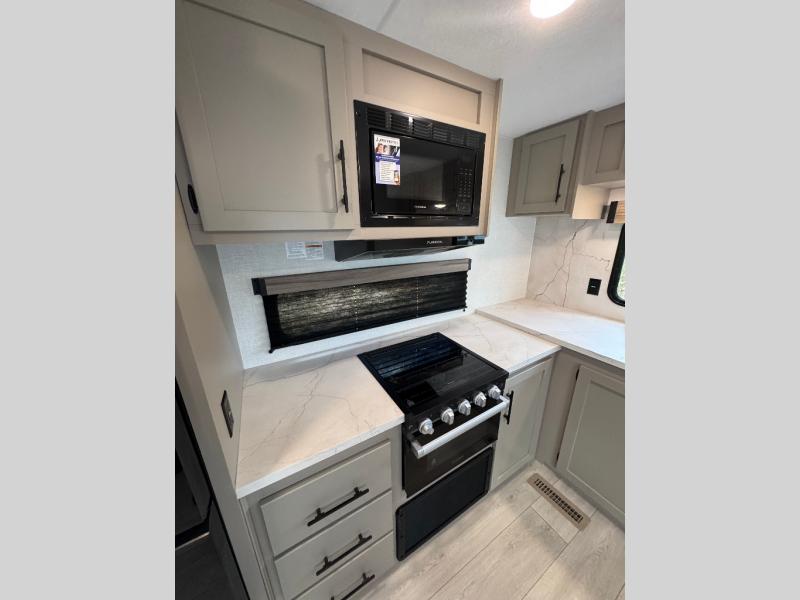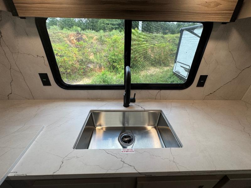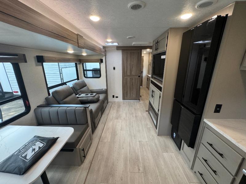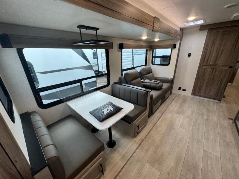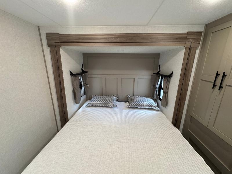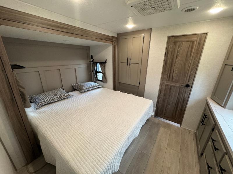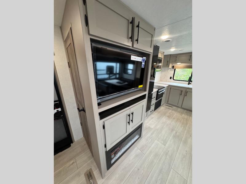Pack your bags and head to the lake in this cozy travel trailer for five. Once you unload your gear from the pass-through storage, prepare a quick lunch on the mini outside kitchen with a griddle and relax under the patio awning. If the weather is raining on your parade, just head indoors to cook on the three burner cooktop, and you'll find ample counter space in this rear kitchen to set out drinks and sides. Your crew can relax on the hide-a-bed sofa and booth dinette within the large slide out, and there is an LED TV and a 34" fireplace for a more at-home atmosphere. One of your favorite features of this trailer will probably be the master suite with a king bed slide out, a dresser and an entertainment center, plus easy access to the front full bath. Here, you'll find dual bath sinks, a spacious shower, plus a walk-in closet with a closet rod to keep your outfits wrinkle free. There is even a wardrobe in the bedroom with washer and dryer prep so you can keep all those clothes fresh and clean!