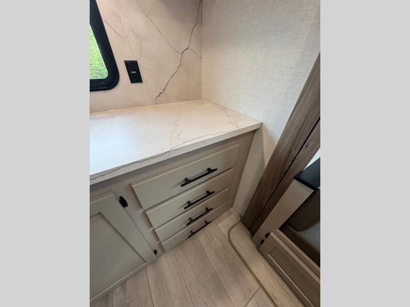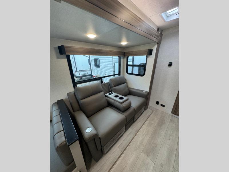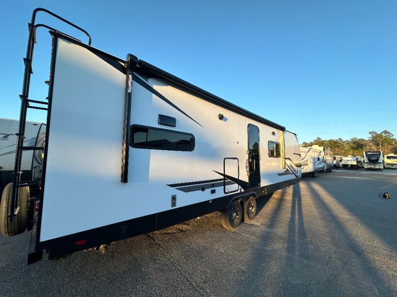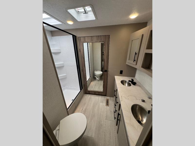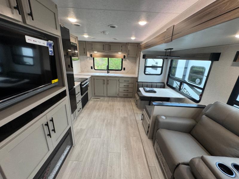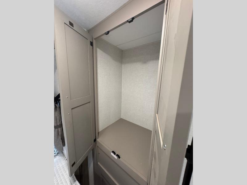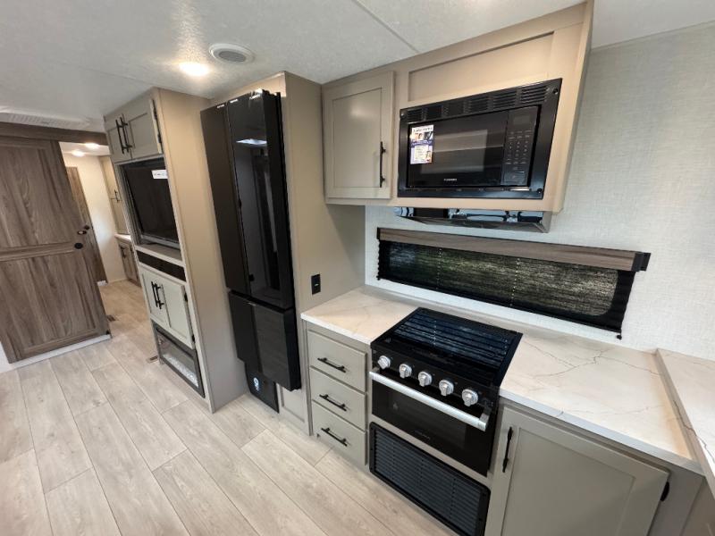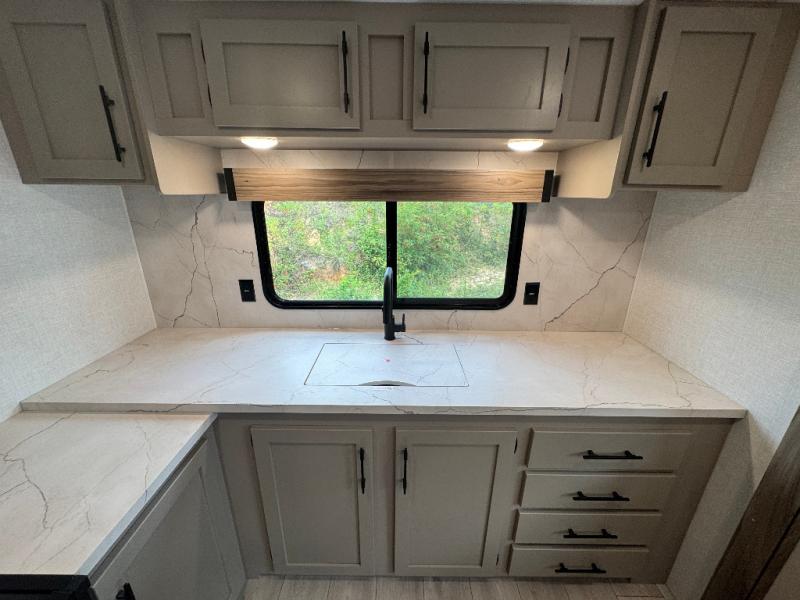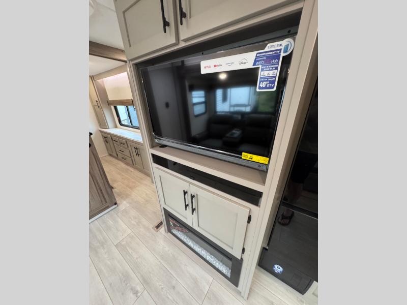 Pack your bags and head to the lake in this cozy travel trailer for five. Once you unload your gear from the pass-through storage, prepare a quick lunch on the mini outside kitchen with a griddle and relax under the patio awning. If the weather is raining on your parade, just head indoors to cook on the three burner cooktop, and you'll find ample counter space in this rear kitchen to set out drinks and sides. Your crew can relax on the hide-a-bed sofa and booth dinette within the large slide out, and there is an LED TV and a 34" fireplace for a more at-home atmosphere. One of your favorite features of this trailer will probably be the master suite with a king bed slide out, a dresser and an entertainment center, plus easy access to the front full bath. Here, you'll find dual bath sinks, a spacious shower, plus a walk-in closet with a closet rod to keep your outfits wrinkle free. There is even a wardrobe in the bedroom with washer and dryer prep so you can keep all those clothes fresh and clean!