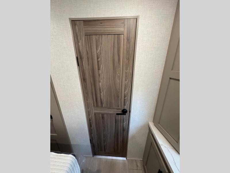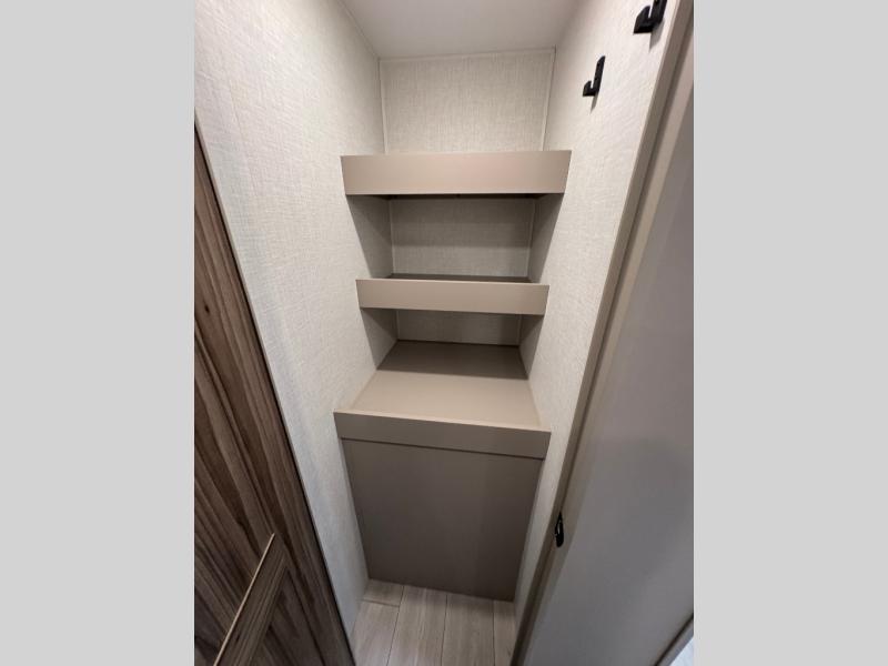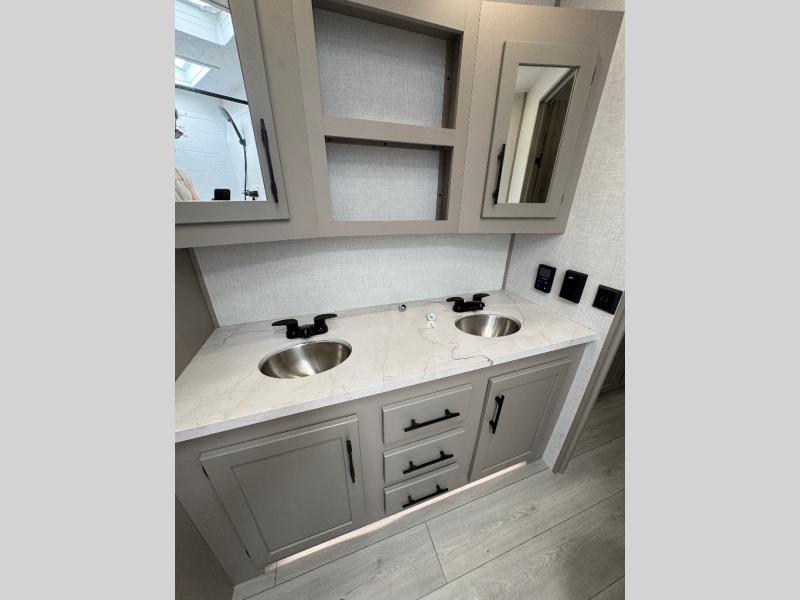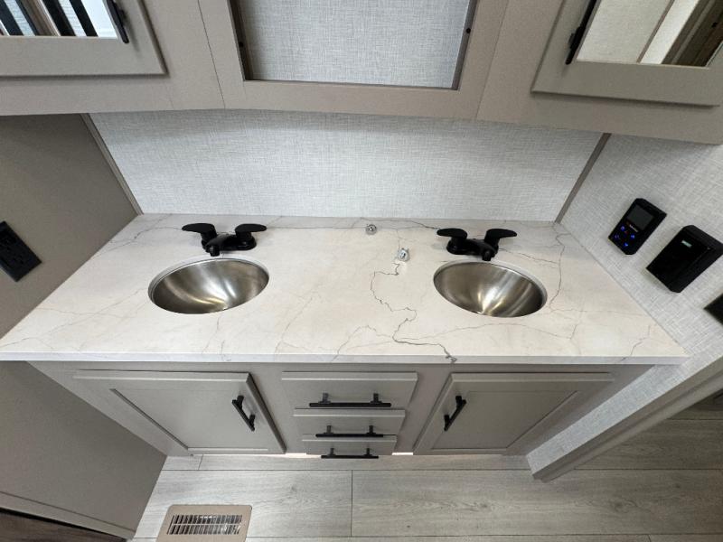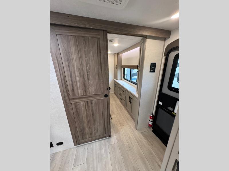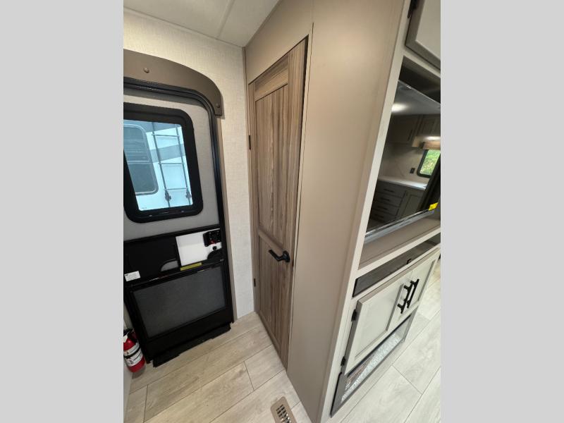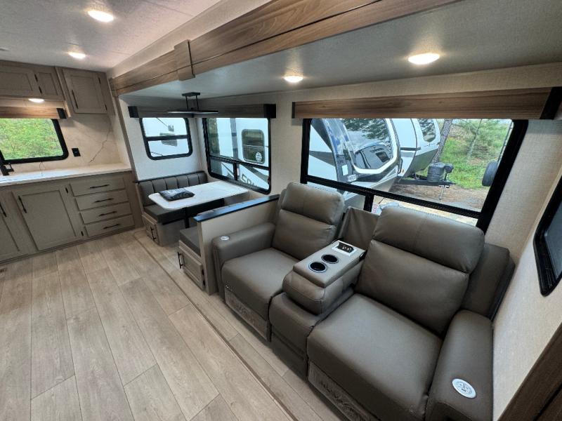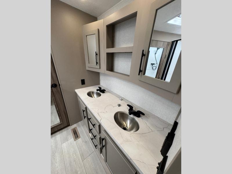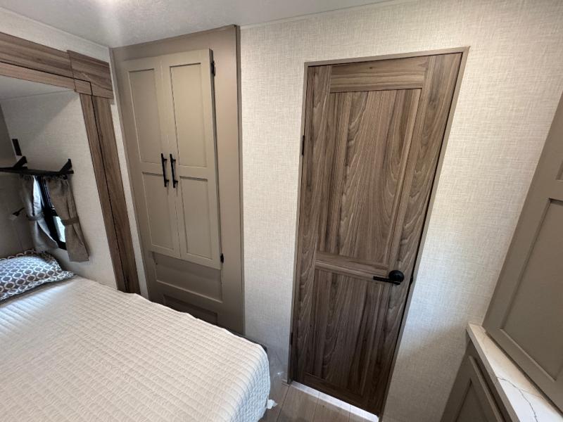 Pack your bags and head to the lake in this cozy travel trailer for five. Once you unload your gear from the pass-through storage, prepare a quick lunch on the mini outside kitchen with a griddle and relax under the patio awning. If the weather is raining on your parade, just head indoors to cook on the three burner cooktop, and you'll find ample counter space in this rear kitchen to set out drinks and sides. Your crew can relax on the hide-a-bed sofa and booth dinette within the large slide out, and there is an LED TV and a 34" fireplace for a more at-home atmosphere. One of your favorite features of this trailer will probably be the master suite with a king bed slide out, a dresser and an entertainment center, plus easy access to the front full bath. Here, you'll find dual bath sinks, a spacious shower, plus a walk-in closet with a closet rod to keep your outfits wrinkle free. There is even a wardrobe in the bedroom with washer and dryer prep so you can keep all those clothes fresh and clean!