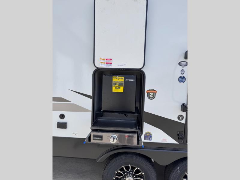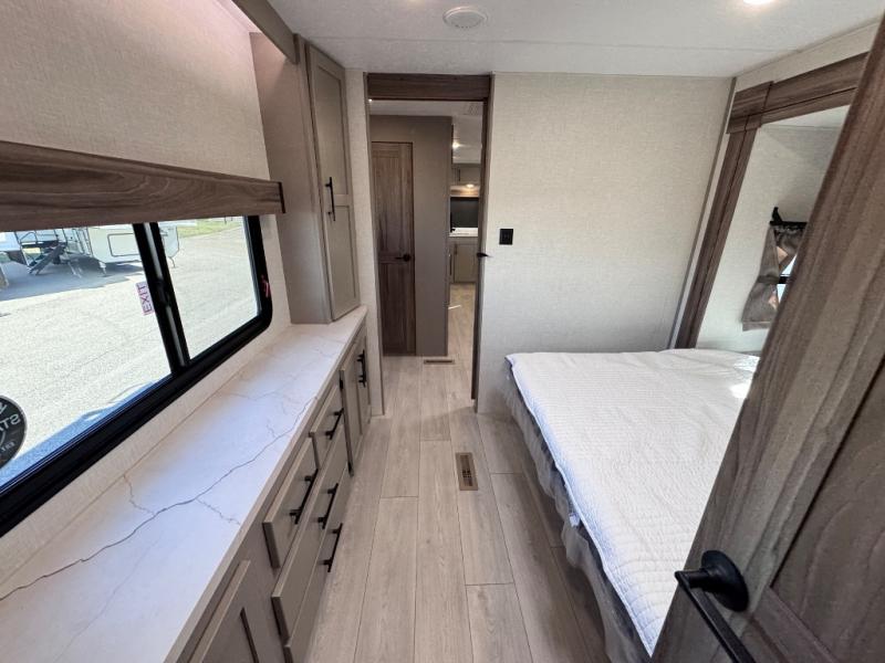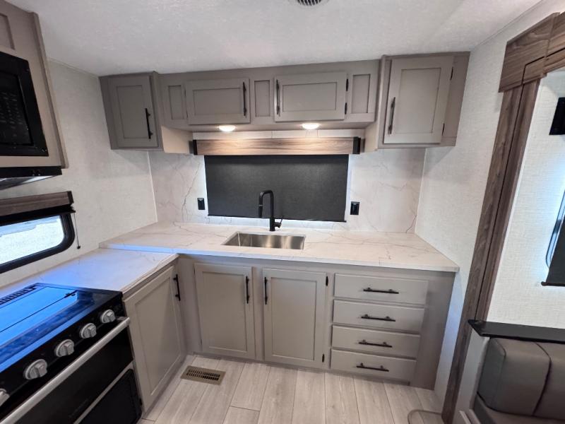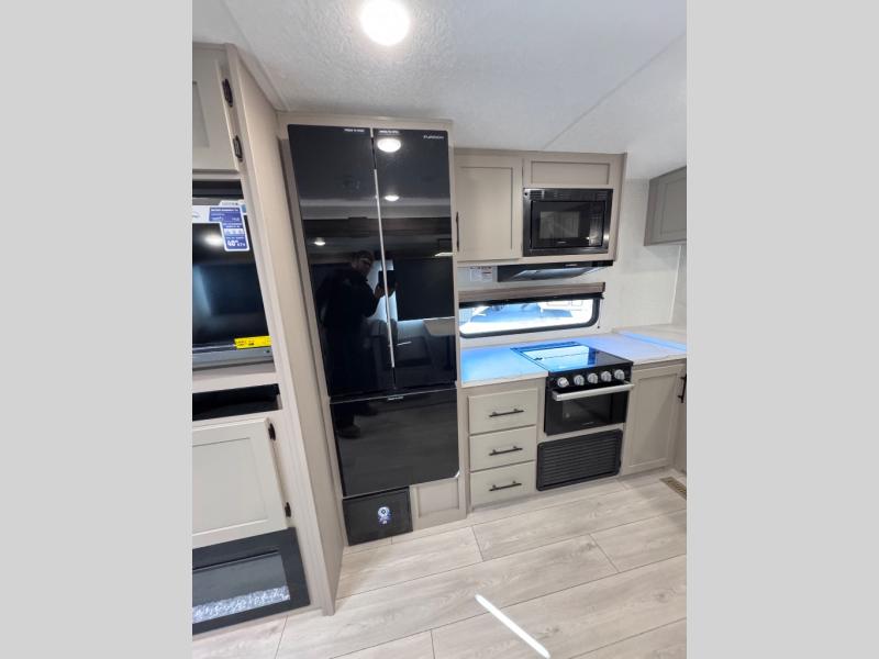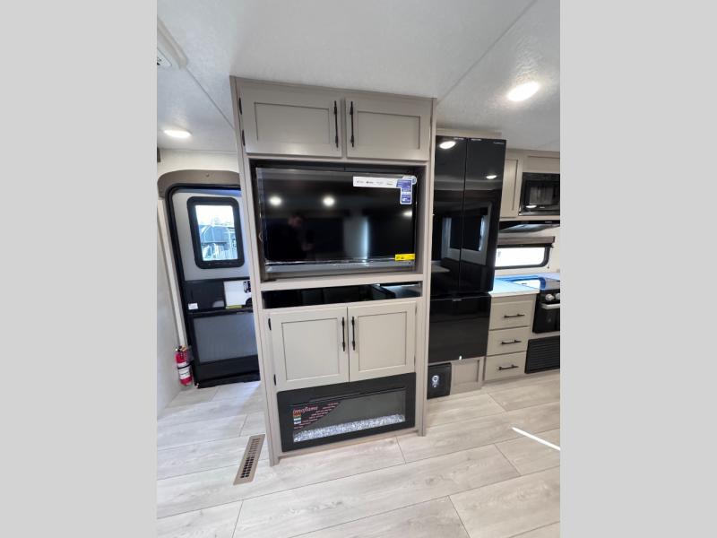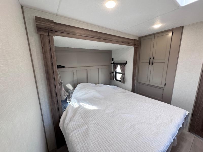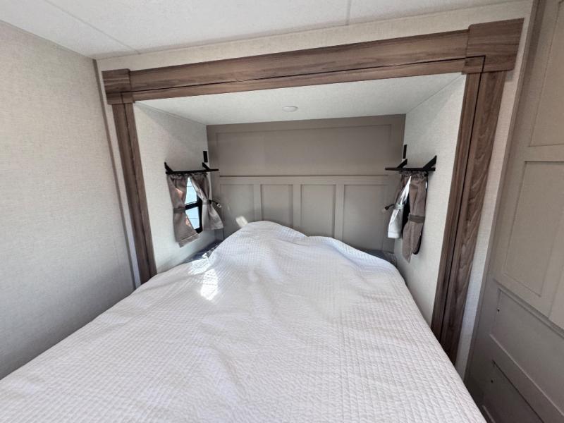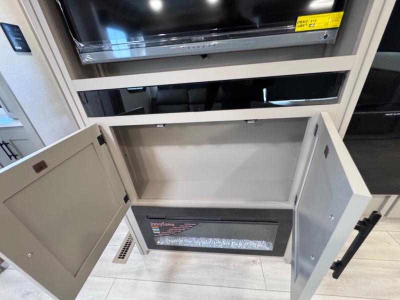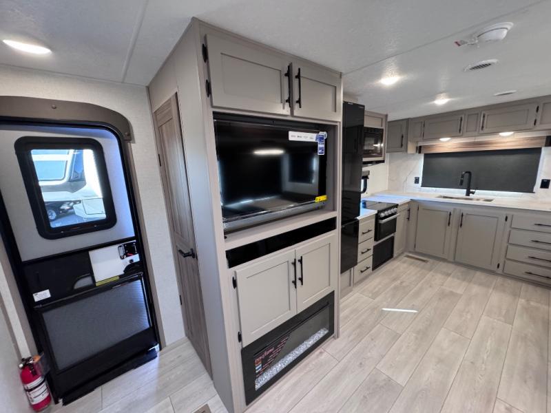 Pack your bags and head to the lake in this cozy travel trailer for five. Once you unload your gear from the pass-through storage, prepare a quick lunch on the mini outside kitchen with a griddle and relax under the patio awning. If the weather is raining on your parade, just head indoors to cook on the three burner cooktop, and you'll find ample counter space in this rear kitchen to set out drinks and sides. Your crew can relax on the hide-a-bed sofa and booth dinette within the large slide out, and there is an LED TV and a 34" fireplace for a more at-home atmosphere. One of your favorite features of this trailer will probably be the master suite with a king bed slide out, a dresser and an entertainment center, plus easy access to the front full bath. Here, you'll find dual bath sinks, a spacious shower, plus a walk-in closet with a closet rod to keep your outfits wrinkle free. There is even a wardrobe in the bedroom with washer and dryer prep so you can keep all those clothes fresh and clean!