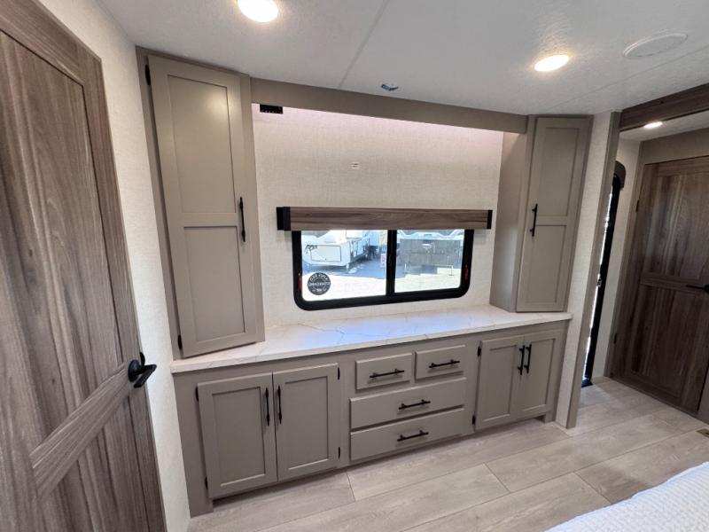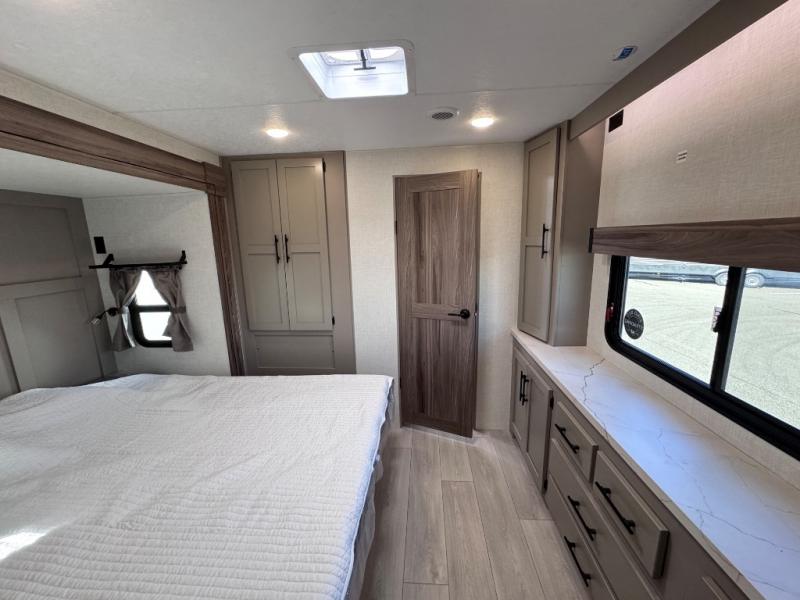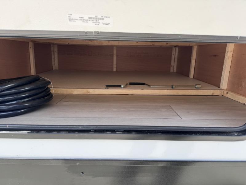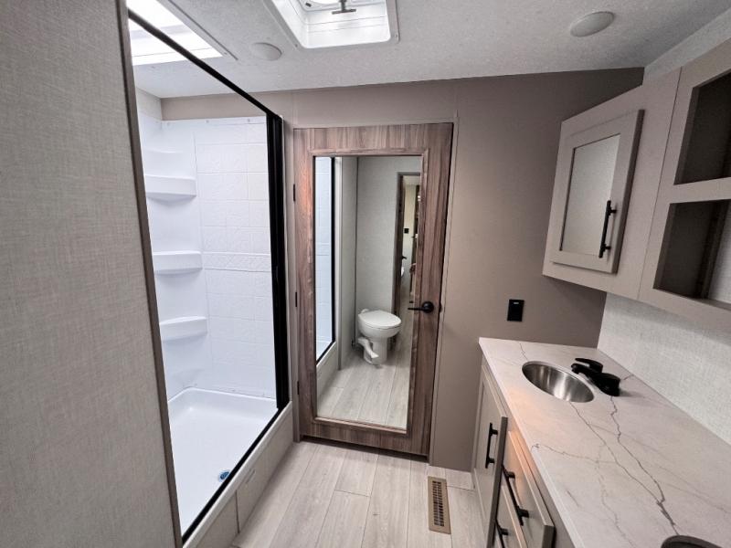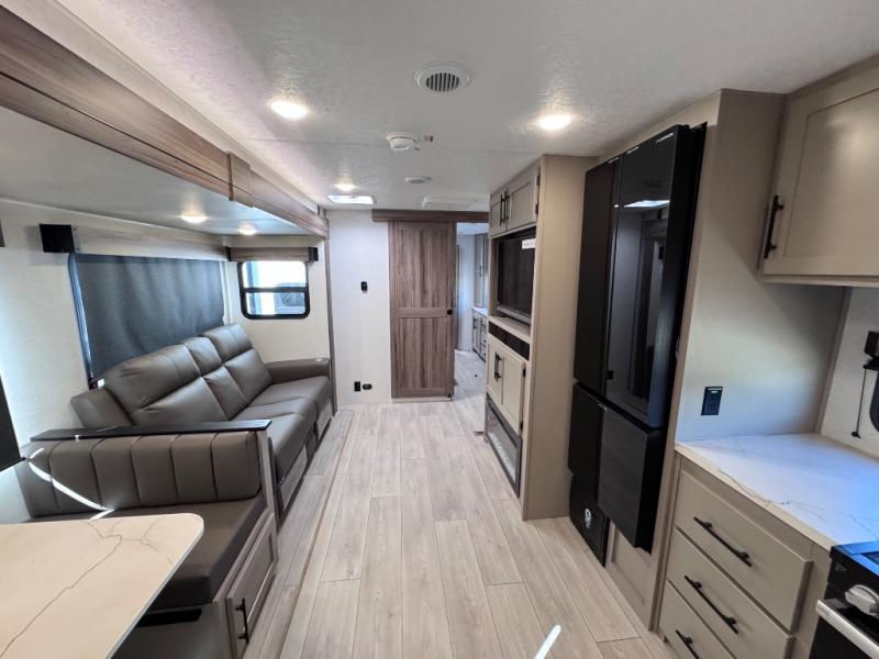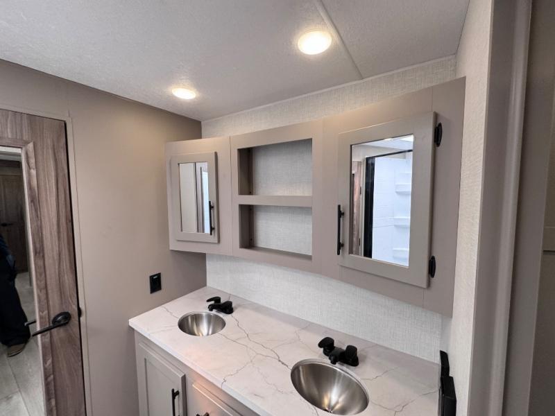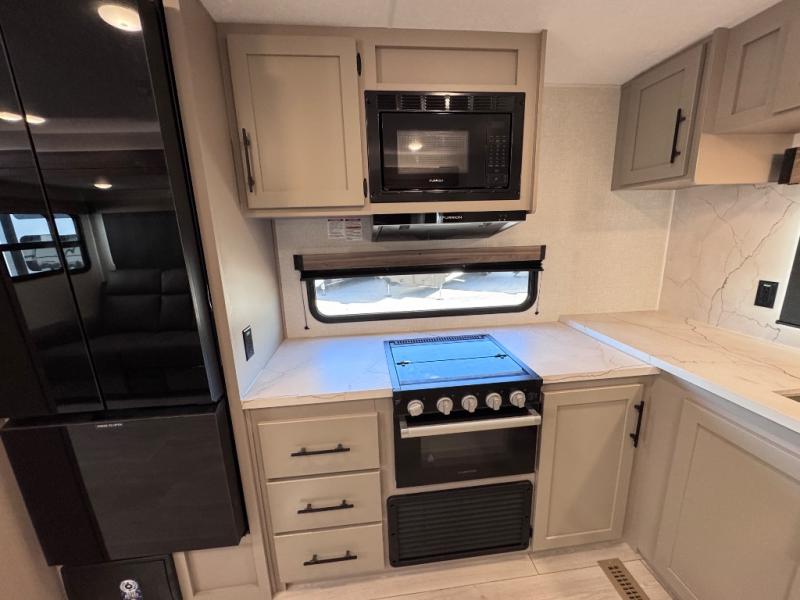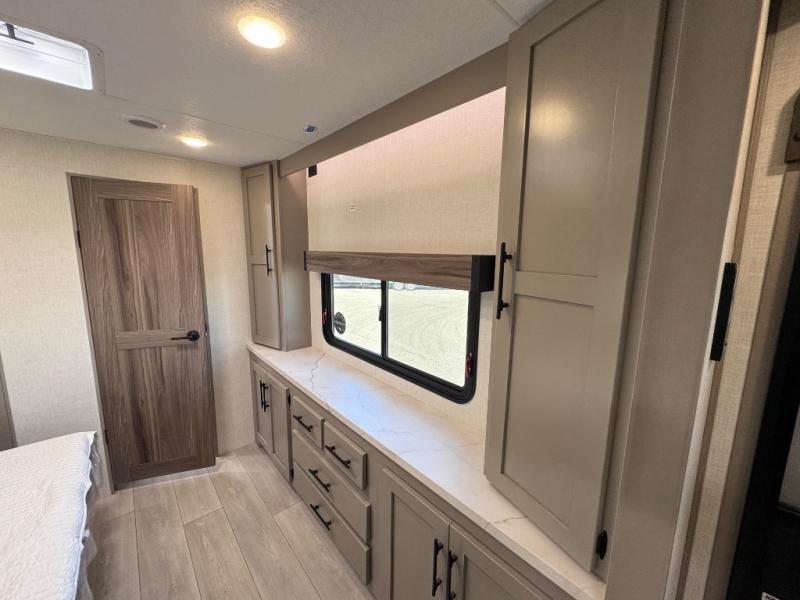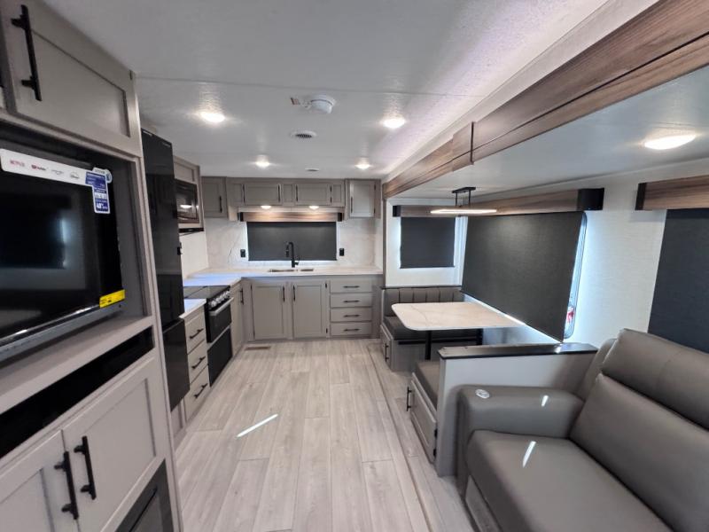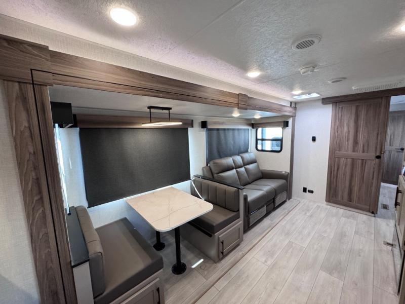 Pack your bags and head to the lake in this cozy travel trailer for five. Once you unload your gear from the pass-through storage, prepare a quick lunch on the mini outside kitchen with a griddle and relax under the patio awning. If the weather is raining on your parade, just head indoors to cook on the three burner cooktop, and you'll find ample counter space in this rear kitchen to set out drinks and sides. Your crew can relax on the hide-a-bed sofa and booth dinette within the large slide out, and there is an LED TV and a 34" fireplace for a more at-home atmosphere. One of your favorite features of this trailer will probably be the master suite with a king bed slide out, a dresser and an entertainment center, plus easy access to the front full bath. Here, you'll find dual bath sinks, a spacious shower, plus a walk-in closet with a closet rod to keep your outfits wrinkle free. There is even a wardrobe in the bedroom with washer and dryer prep so you can keep all those clothes fresh and clean!