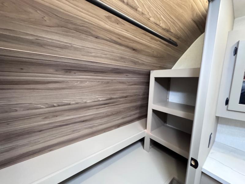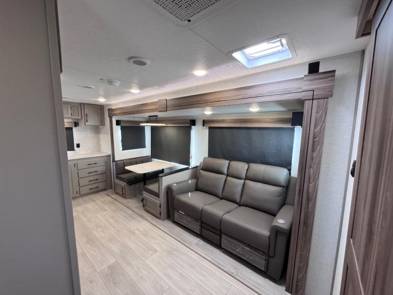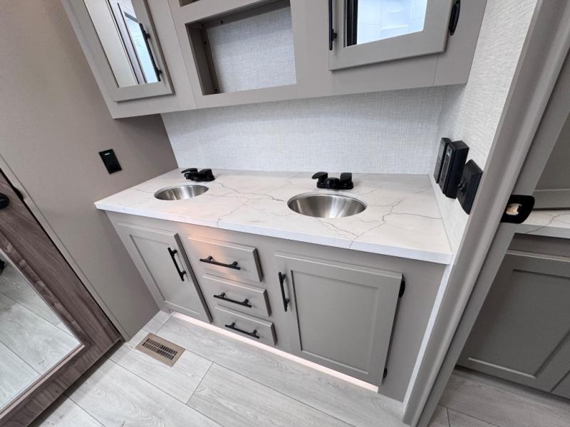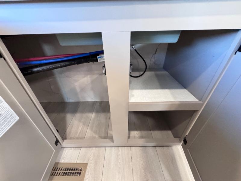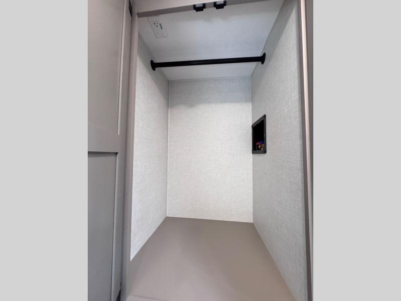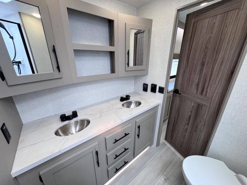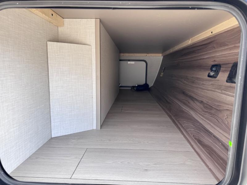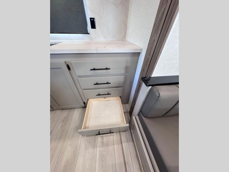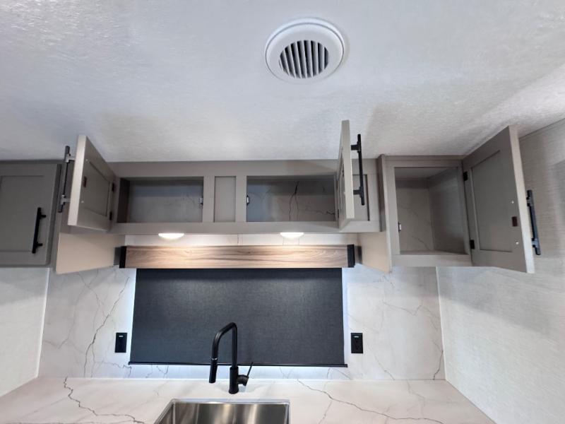 Pack your bags and head to the lake in this cozy travel trailer for five. Once you unload your gear from the pass-through storage, prepare a quick lunch on the mini outside kitchen with a griddle and relax under the patio awning. If the weather is raining on your parade, just head indoors to cook on the three burner cooktop, and you'll find ample counter space in this rear kitchen to set out drinks and sides. Your crew can relax on the hide-a-bed sofa and booth dinette within the large slide out, and there is an LED TV and a 34" fireplace for a more at-home atmosphere. One of your favorite features of this trailer will probably be the master suite with a king bed slide out, a dresser and an entertainment center, plus easy access to the front full bath. Here, you'll find dual bath sinks, a spacious shower, plus a walk-in closet with a closet rod to keep your outfits wrinkle free. There is even a wardrobe in the bedroom with washer and dryer prep so you can keep all those clothes fresh and clean!