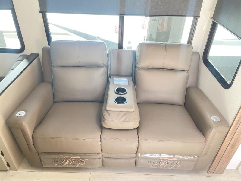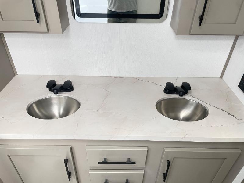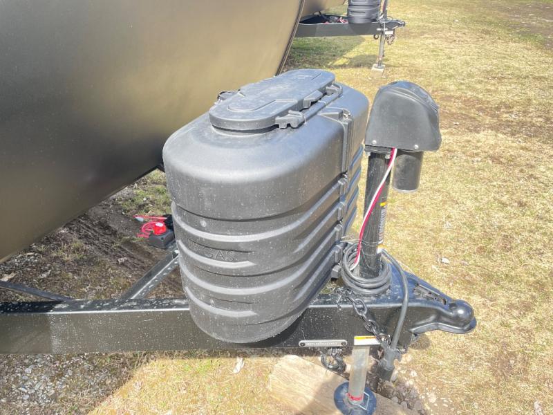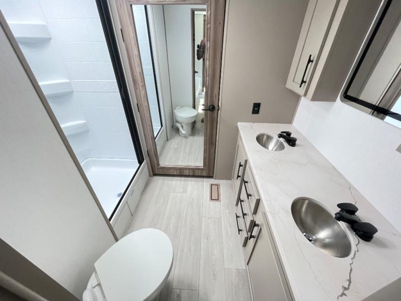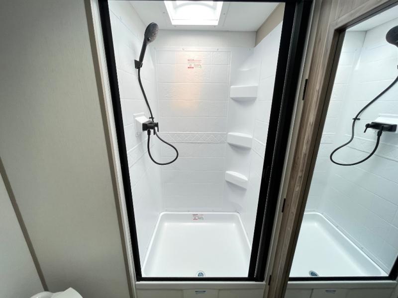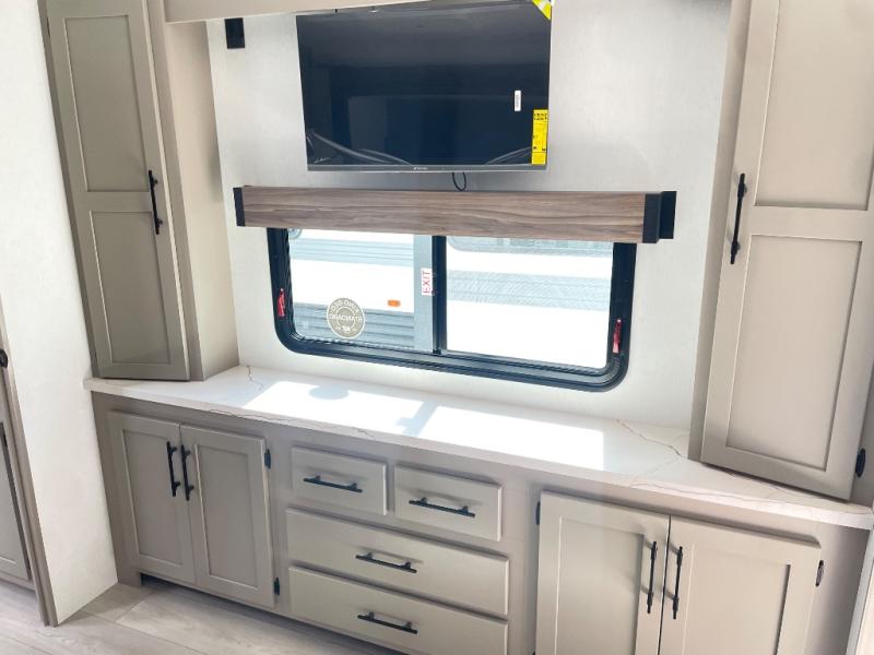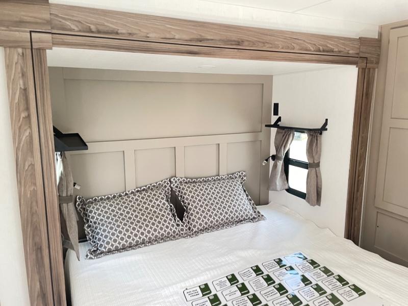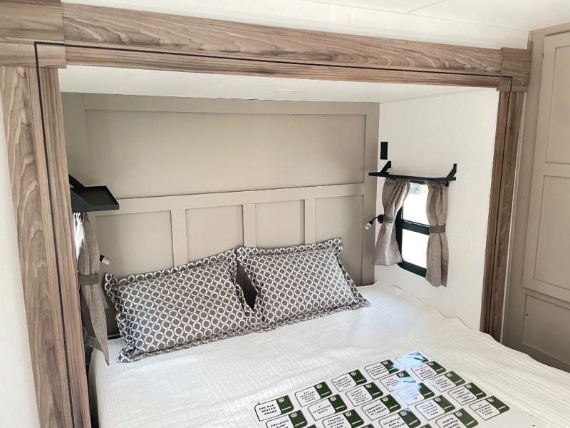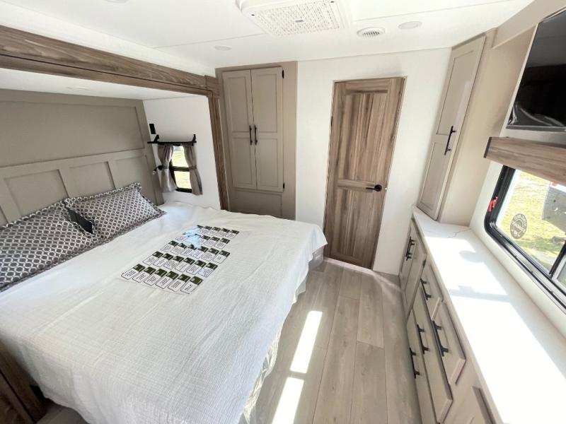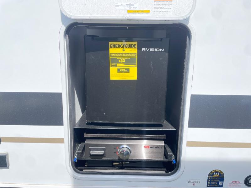 Pack your bags and head to the lake in this cozy travel trailer for five. Once you unload your gear from the pass-through storage, prepare a quick lunch on the mini outside kitchen with a griddle and relax under the patio awning. If the weather is raining on your parade, just head indoors to cook on the three burner cooktop, and you'll find ample counter space in this rear kitchen to set out drinks and sides. Your crew can relax on the hide-a-bed sofa and booth dinette within the large slide out, and there is an LED TV and a 34" fireplace for a more at-home atmosphere. One of your favorite features of this trailer will probably be the master suite with a king bed slide out, a dresser and an entertainment center, plus easy access to the front full bath. Here, you'll find dual bath sinks, a spacious shower, plus a walk-in closet with a closet rod to keep your outfits wrinkle free. There is even a wardrobe in the bedroom with washer and dryer prep so you can keep all those clothes fresh and clean!