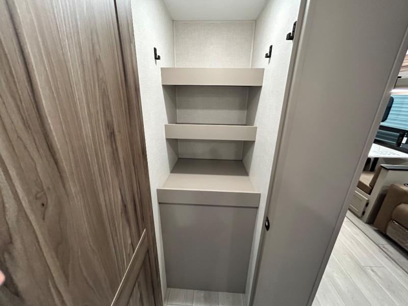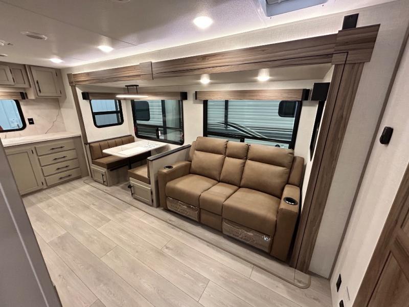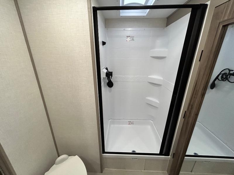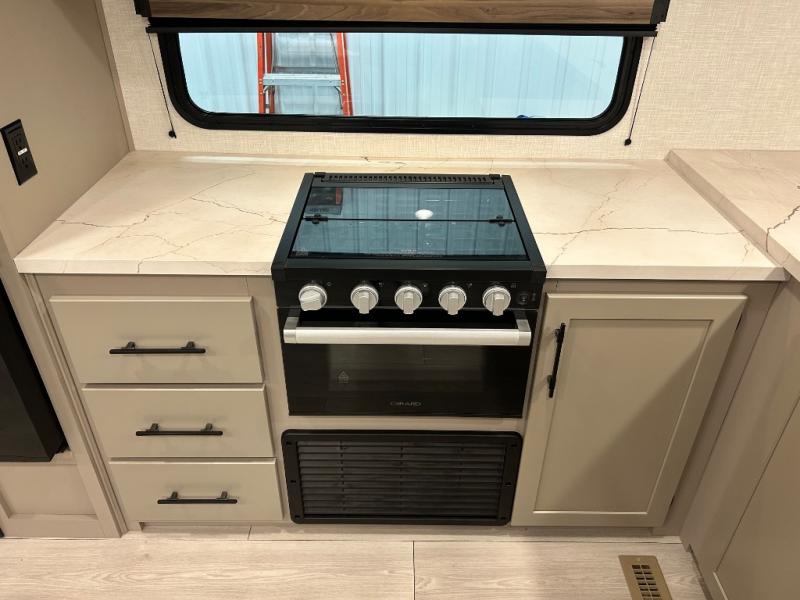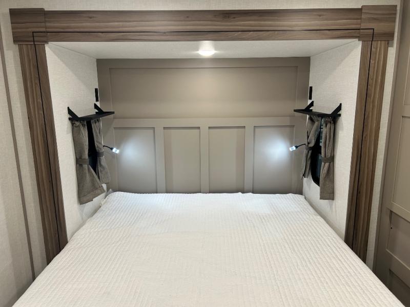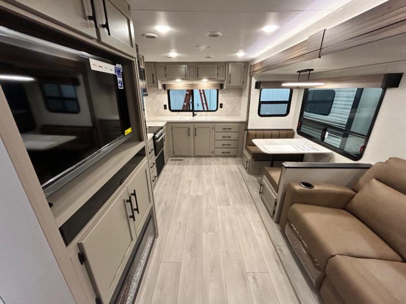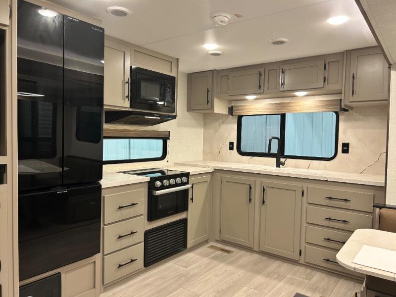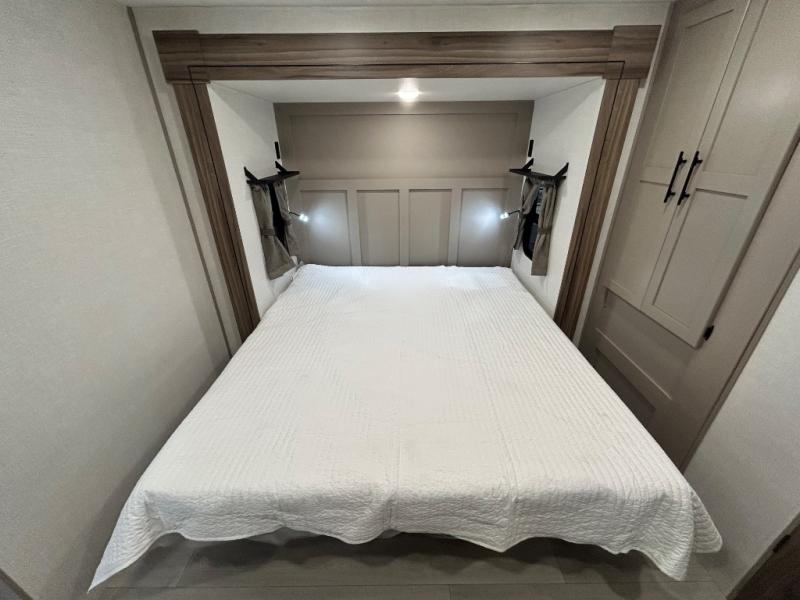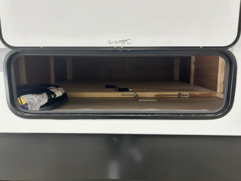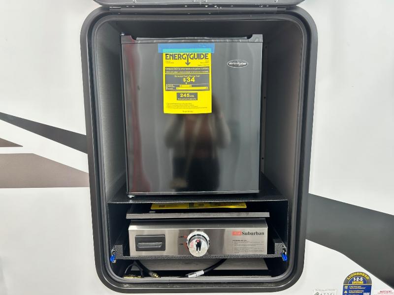 Pack your bags and head to the lake in this cozy travel trailer for five. Once you unload your gear from the pass-through storage, prepare a quick lunch on the mini outside kitchen with a griddle and relax under the patio awning. If the weather is raining on your parade, just head indoors to cook on the three burner cooktop, and you'll find ample counter space in this rear kitchen to set out drinks and sides. Your crew can relax on the hide-a-bed sofa and booth dinette within the large slide out, and there is an LED TV and a 34" fireplace for a more at-home atmosphere. One of your favorite features of this trailer will probably be the master suite with a king bed slide out, a dresser and an entertainment center, plus easy access to the front full bath. Here, you'll find dual bath sinks, a spacious shower, plus a walk-in closet with a closet rod to keep your outfits wrinkle free. There is even a wardrobe in the bedroom with washer and dryer prep so you can keep all those clothes fresh and clean!