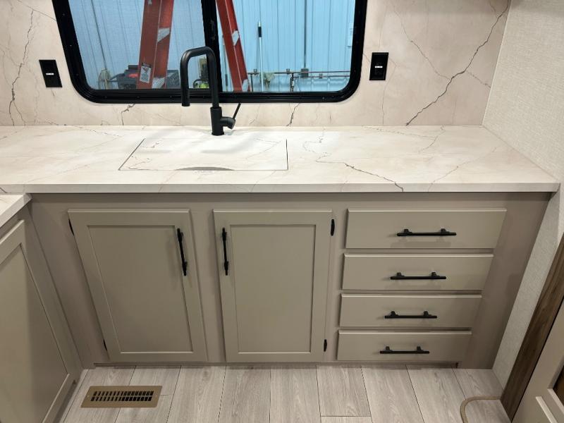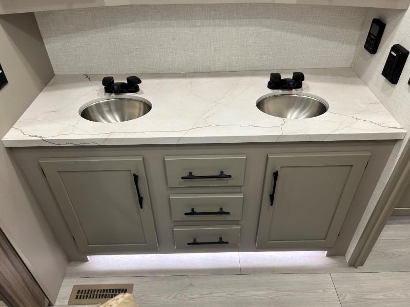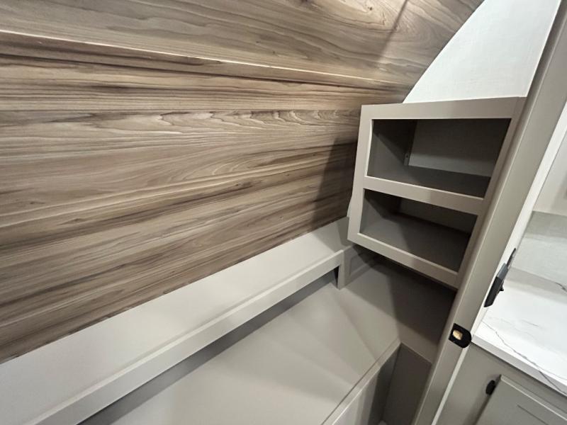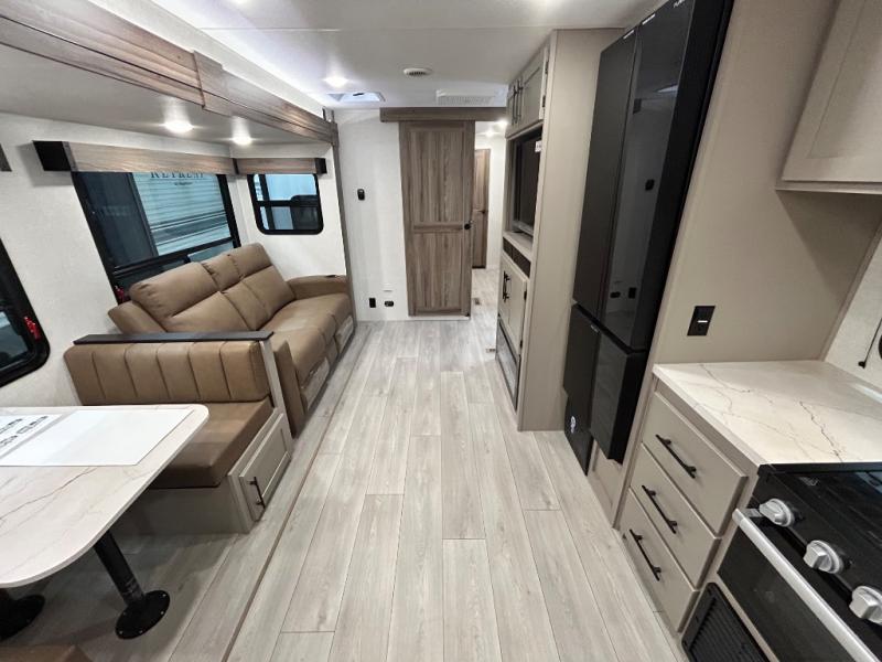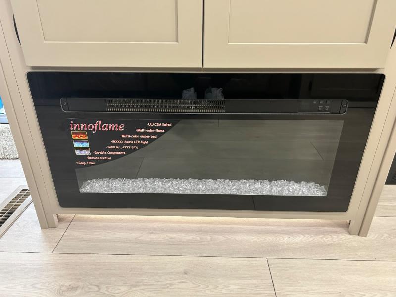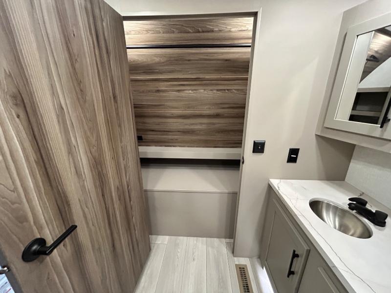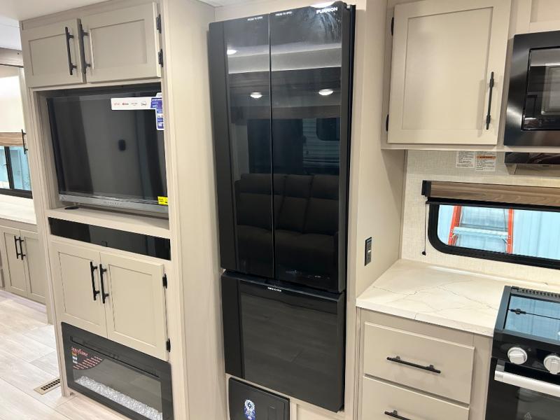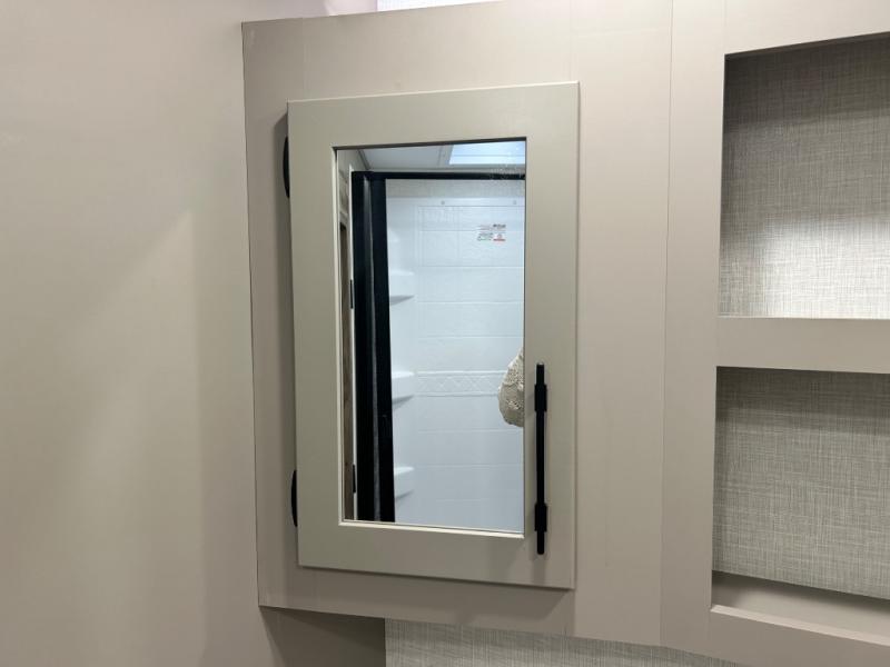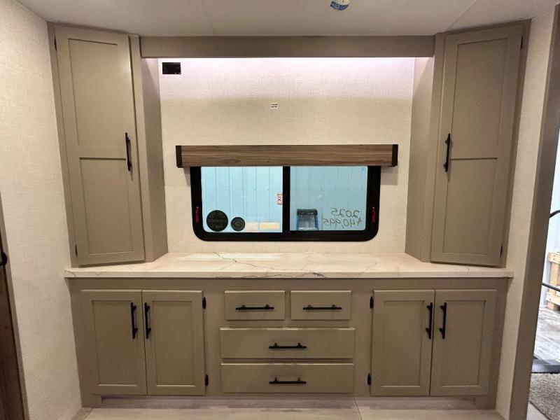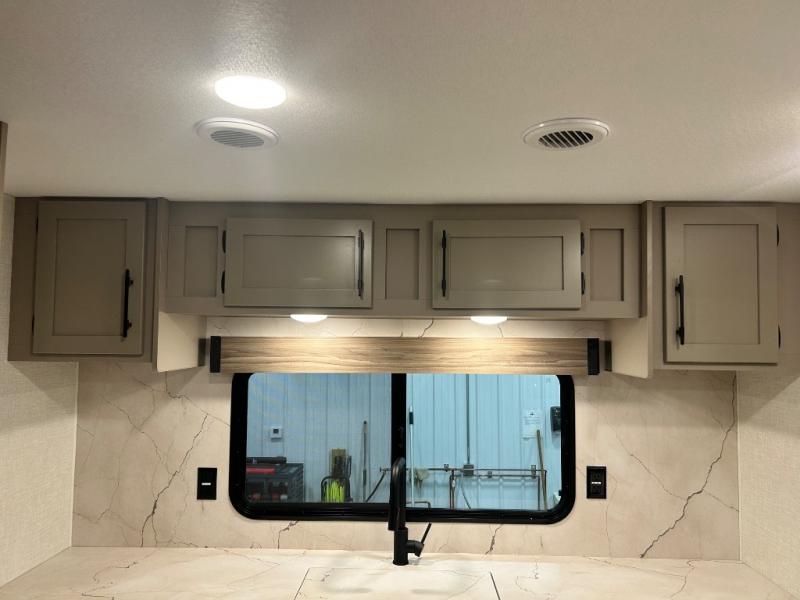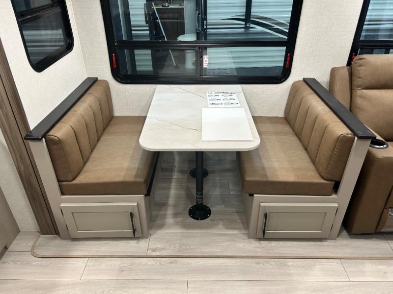 Pack your bags and head to the lake in this cozy travel trailer for five. Once you unload your gear from the pass-through storage, prepare a quick lunch on the mini outside kitchen with a griddle and relax under the patio awning. If the weather is raining on your parade, just head indoors to cook on the three burner cooktop, and you'll find ample counter space in this rear kitchen to set out drinks and sides. Your crew can relax on the hide-a-bed sofa and booth dinette within the large slide out, and there is an LED TV and a 34" fireplace for a more at-home atmosphere. One of your favorite features of this trailer will probably be the master suite with a king bed slide out, a dresser and an entertainment center, plus easy access to the front full bath. Here, you'll find dual bath sinks, a spacious shower, plus a walk-in closet with a closet rod to keep your outfits wrinkle free. There is even a wardrobe in the bedroom with washer and dryer prep so you can keep all those clothes fresh and clean!