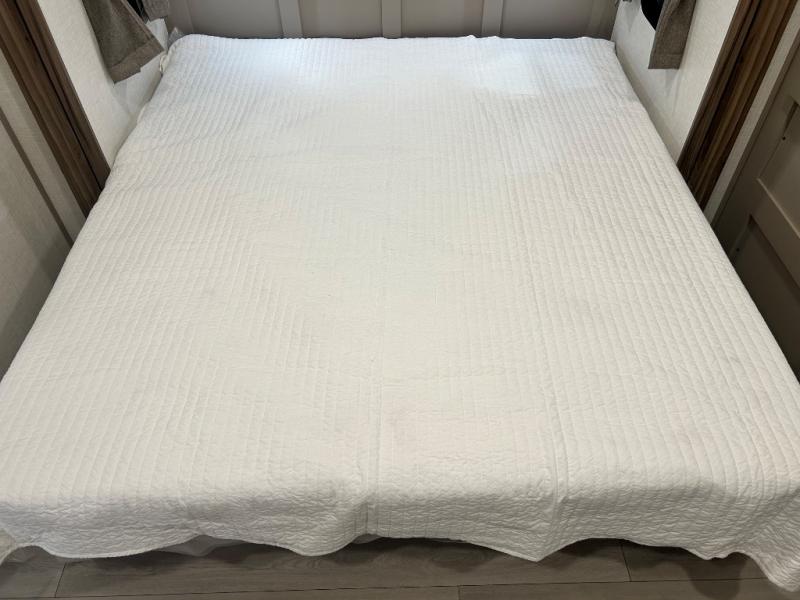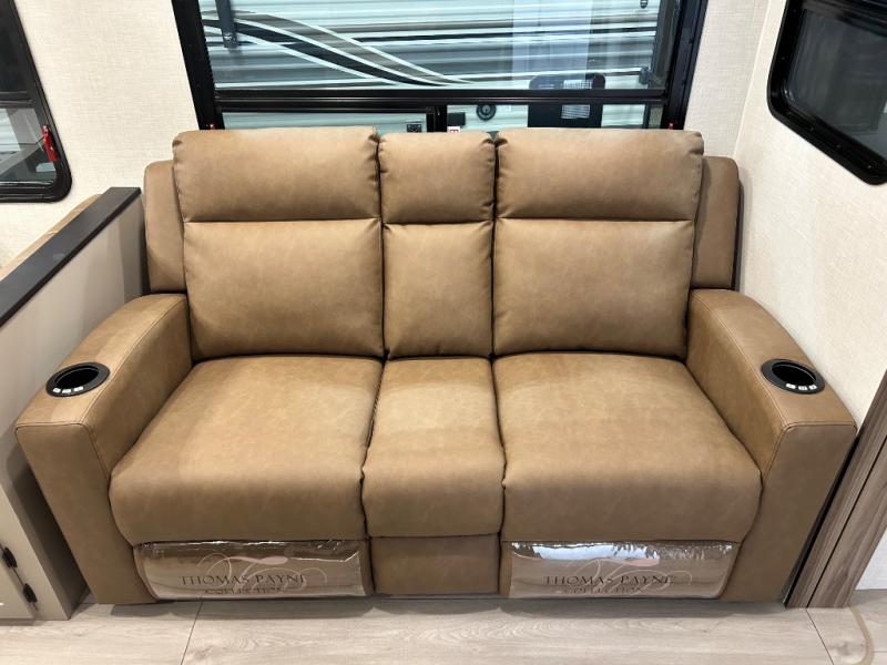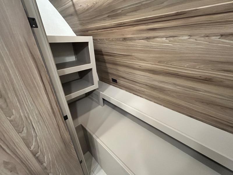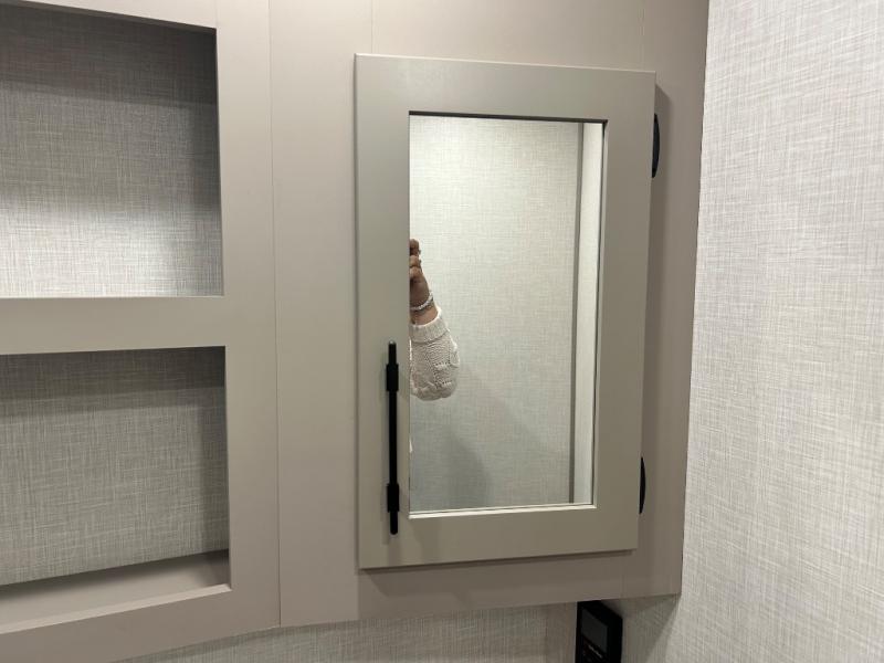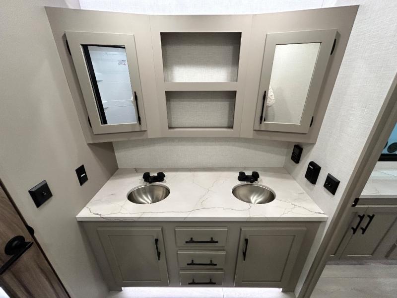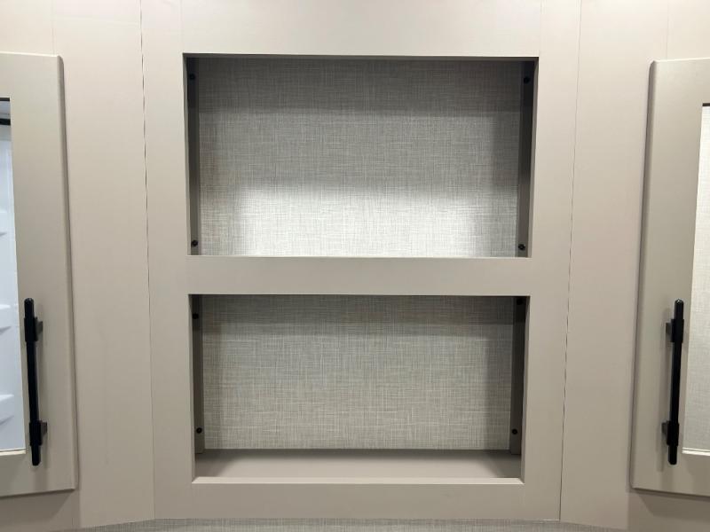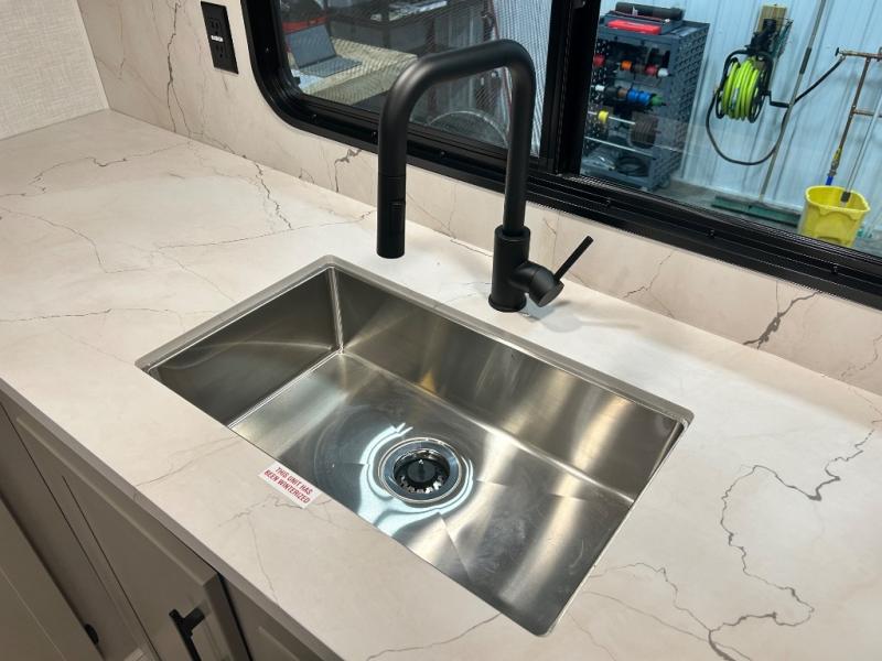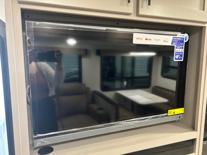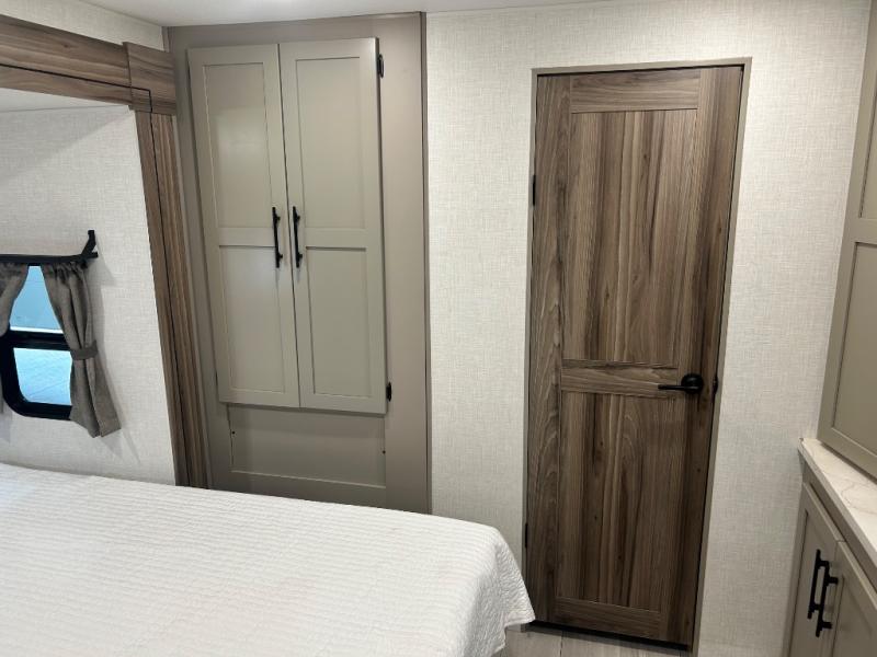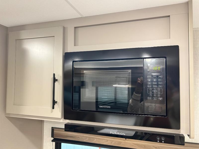 Pack your bags and head to the lake in this cozy travel trailer for five. Once you unload your gear from the pass-through storage, prepare a quick lunch on the mini outside kitchen with a griddle and relax under the patio awning. If the weather is raining on your parade, just head indoors to cook on the three burner cooktop, and you'll find ample counter space in this rear kitchen to set out drinks and sides. Your crew can relax on the hide-a-bed sofa and booth dinette within the large slide out, and there is an LED TV and a 34" fireplace for a more at-home atmosphere. One of your favorite features of this trailer will probably be the master suite with a king bed slide out, a dresser and an entertainment center, plus easy access to the front full bath. Here, you'll find dual bath sinks, a spacious shower, plus a walk-in closet with a closet rod to keep your outfits wrinkle free. There is even a wardrobe in the bedroom with washer and dryer prep so you can keep all those clothes fresh and clean!