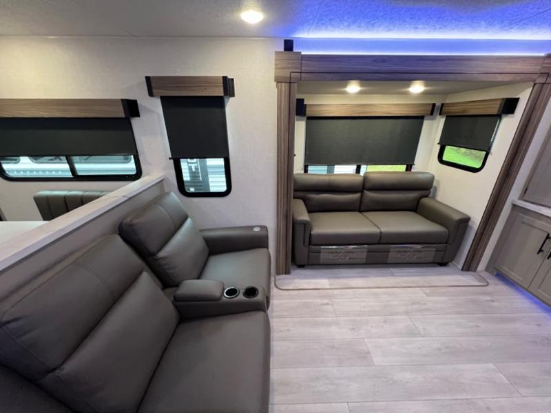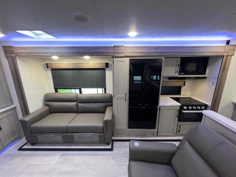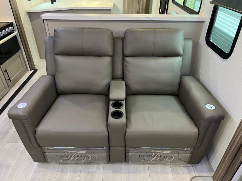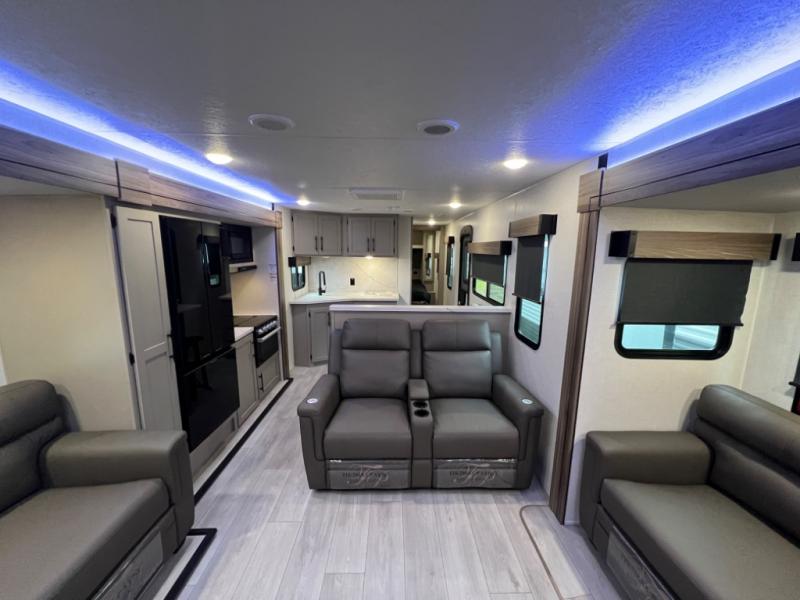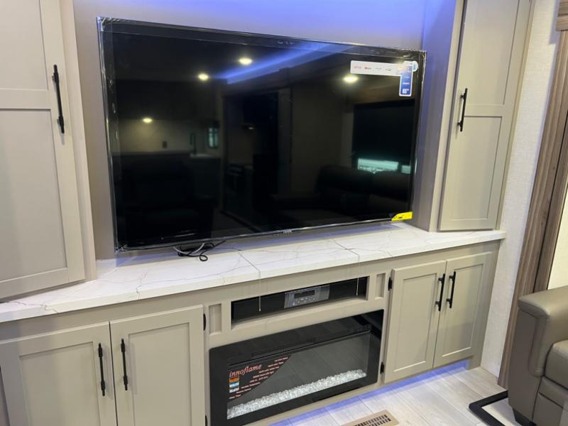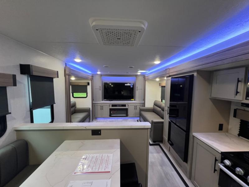 Head for the hills, lake, or woods in this spacious travel trailer. Once your gear is unloaded from the pass-through storage, set up the 19' power awning with LED lights and relax with a cold drink. Once you head inside you can make lunch on the three burner range and dine at the dinette that includes two chairs and bench seating. The rear living area includes a rear entertainment center with an LED TV and a 34" fireplace for a cozy atmosphere. There is also theater seating here and two 70" sofas within the dual opposing slides where your guests can sleep. And you will enjoy the front private bedroom with a king bed all to yourselves!