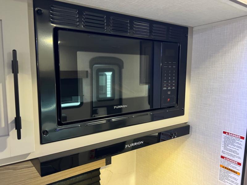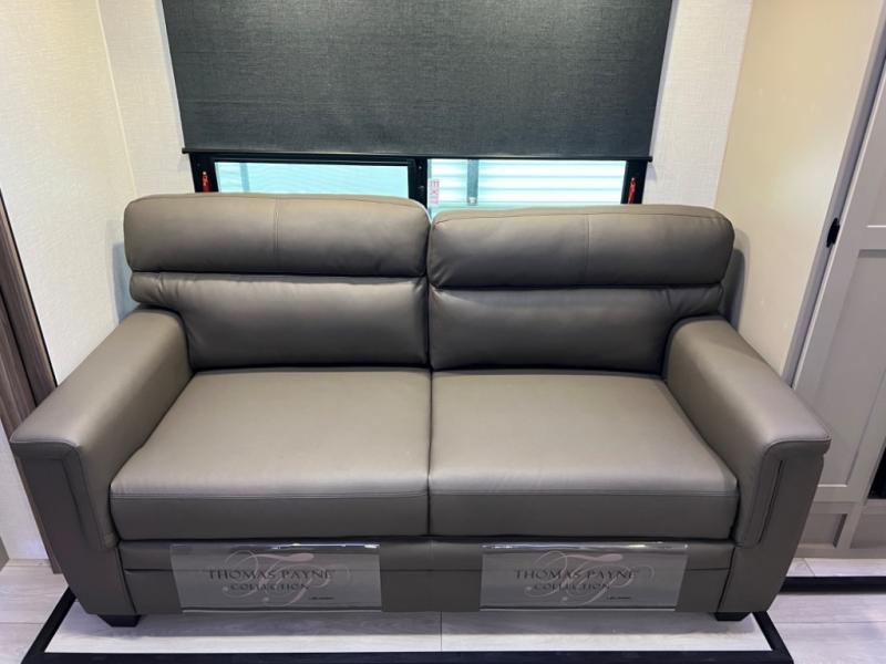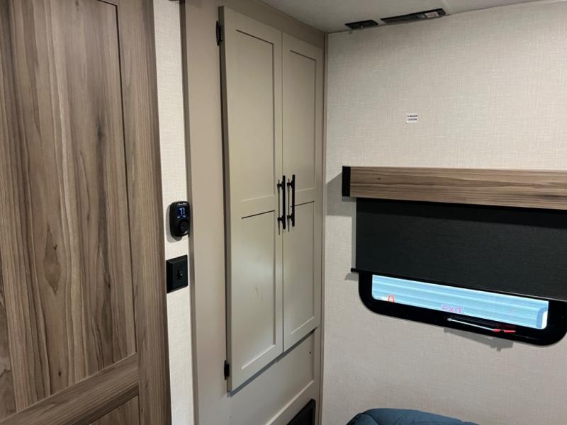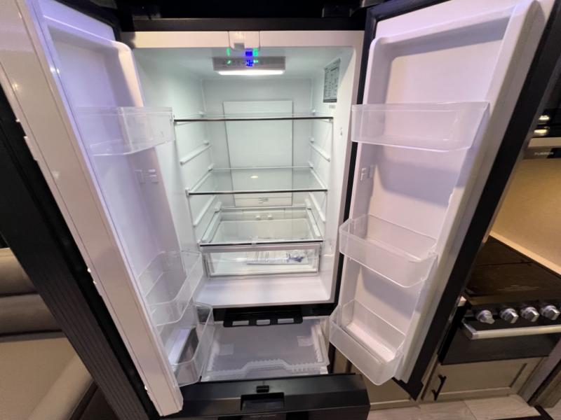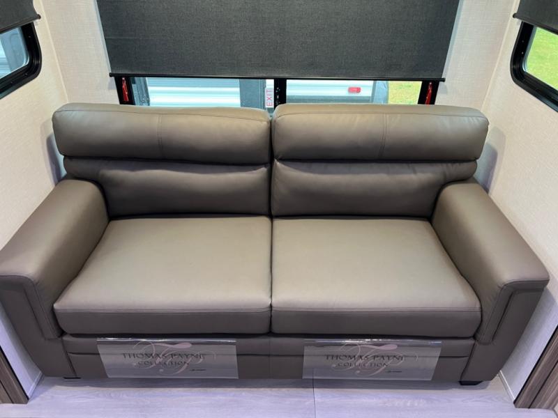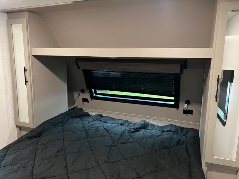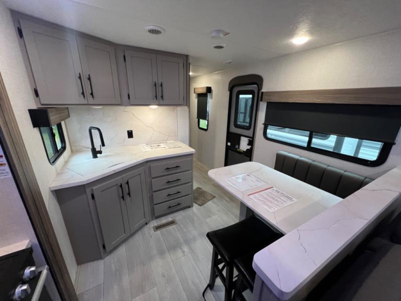 Head for the hills, lake, or woods in this spacious travel trailer. Once your gear is unloaded from the pass-through storage, set up the 19' power awning with LED lights and relax with a cold drink. Once you head inside you can make lunch on the three burner range and dine at the dinette that includes two chairs and bench seating. The rear living area includes a rear entertainment center with an LED TV and a 34" fireplace for a cozy atmosphere. There is also theater seating here and two 70" sofas within the dual opposing slides where your guests can sleep. And you will enjoy the front private bedroom with a king bed all to yourselves!
