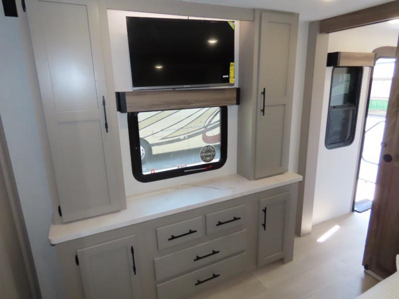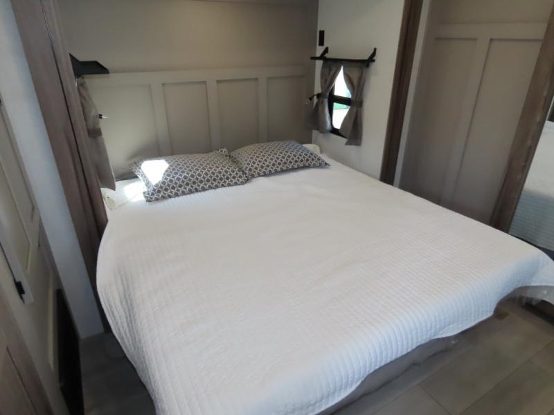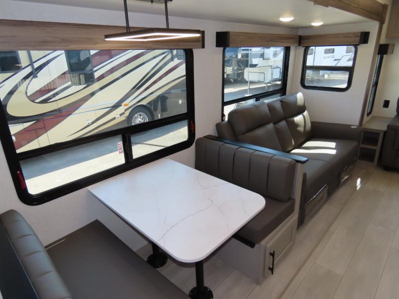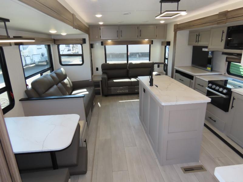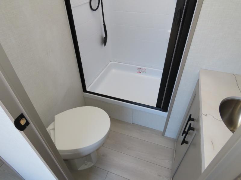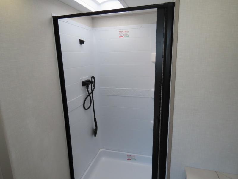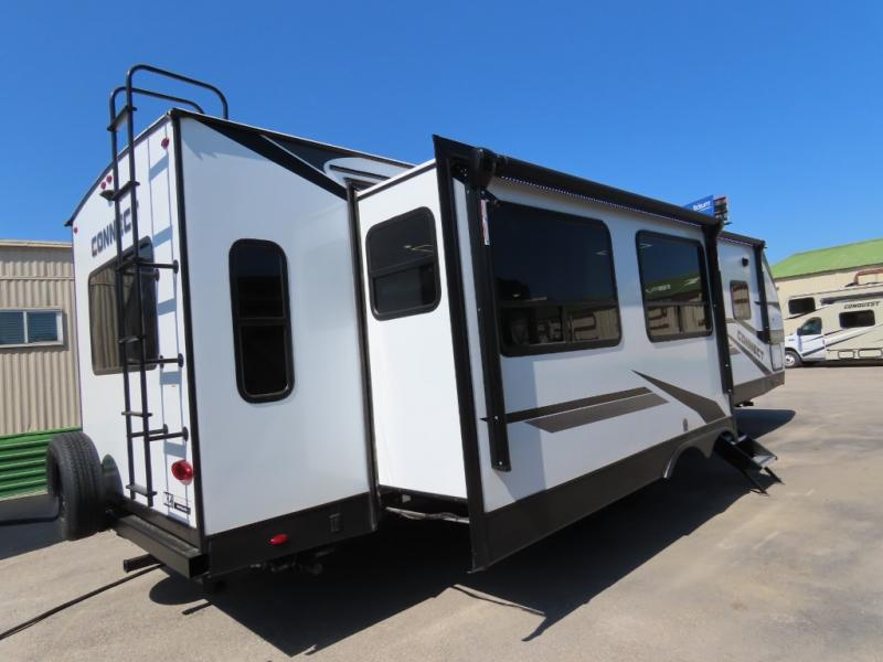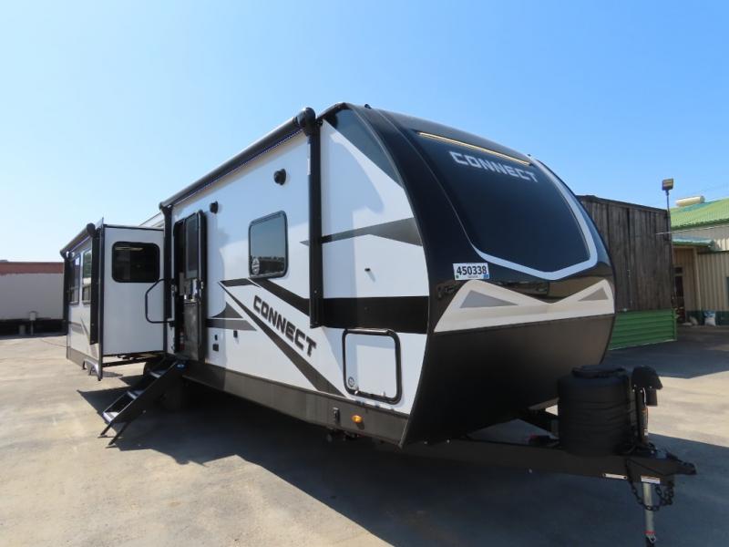 How about a nice afternoon of relaxing on the lake and then rinsing off in the 30" x 36" shower on this Connect travel trailer? After you get clean, you can grab a fresh change of clothes from the front walk-in closet and dresser in the private bedroom. The bedroom also has an area prepped for a washer and dryer and a king bed slide. Out in the main living area, you'll be able to prepare a meal without much effort at all since this trailer has a three-burner range, a microwave, a 10 cu. ft. 12V refrigerator, and a kitchen island for more prep space. You can even have your friends sit on the 70" sofa, theater seating, and booth dinette to chat with you while you finish the meal. You all will also benefit from the two electric awnings with LED lights on the exterior.