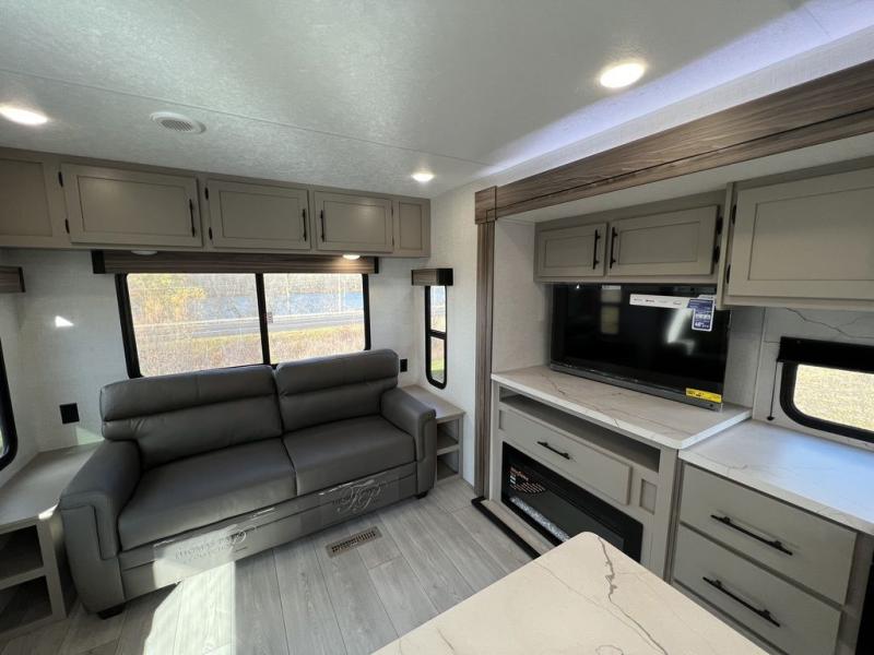 The KZ Connect travel trailer comes with an RV Airflow System which optimizes the airflow for your air conditioner by increasing the airflow by an average of 40%. This improves performance, speeds up cooling times, and reduces noise in your trailer. Some of the other helpful features found on the Connect are the heated, insulated, and enclosed underbelly, the exterior docking station, the fiberglass front cap with front windshield, the 82" interior ceiling height, and the protective front diamond plate. There are some useful technological features, like the two LED motion-sensor lights, the HDMI and USB charge, and the multi-media entertainment system with a DVD player. The KZ Engage is powered by OneControl, and it monitors battery levels and controls slide rooms, the leveling system, the awning, inside/outside lighting, and the TPMS prep.