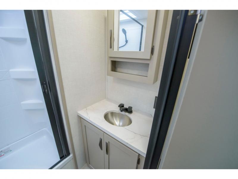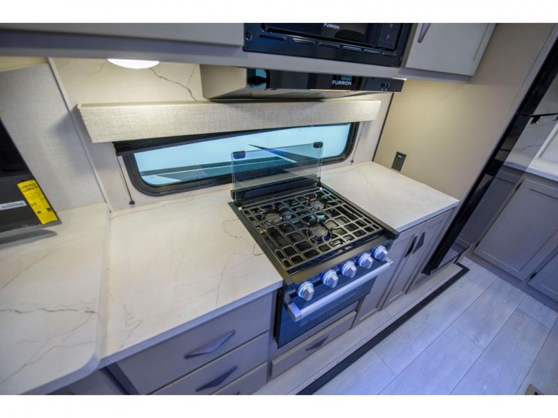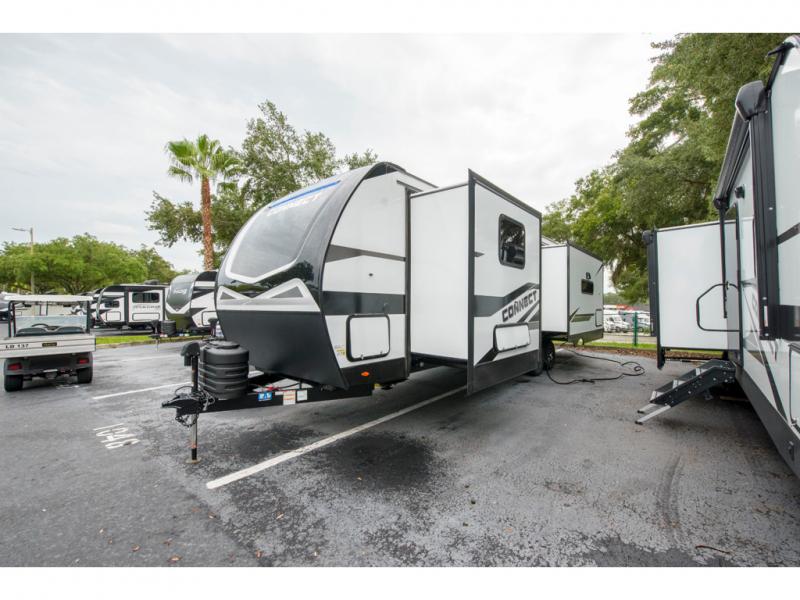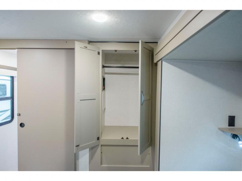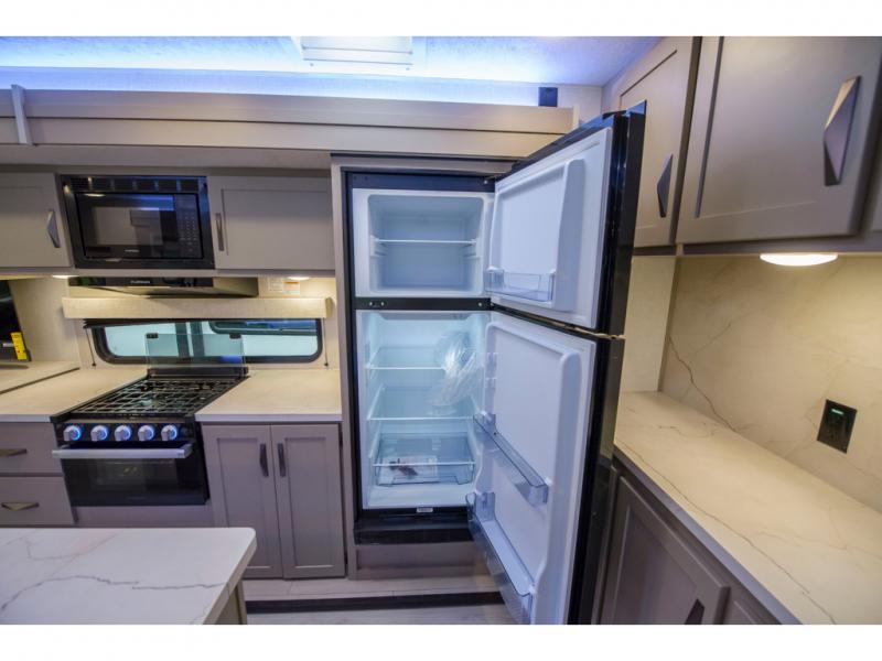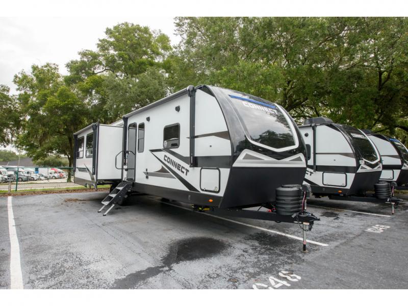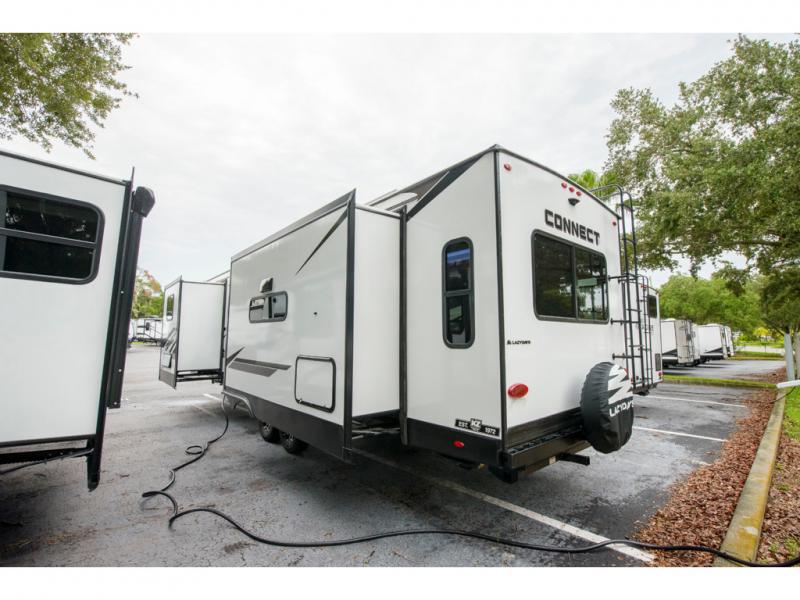 How about a nice afternoon of relaxing on the lake and then rinsing off in the 30" x 36" shower on this Connect travel trailer? After you get clean, you can grab a fresh change of clothes from the front walk-in closet and dresser in the private bedroom. The bedroom also has an area prepped for a washer and dryer and a king bed slide. Out in the main living area, you'll be able to prepare a meal without much effort at all since this trailer has a three-burner range, a microwave, a 10 cu. ft. 12V refrigerator, and a kitchen island for more prep space. You can even have your friends sit on the 70" sofa, theater seating, and booth dinette to chat with you while you finish the meal. You all will also benefit from the two electric awnings with LED lights on the exterior.
