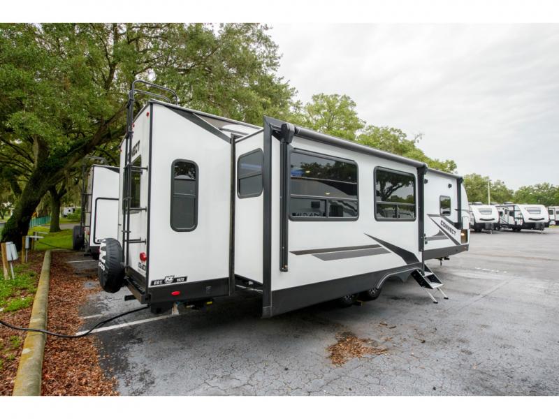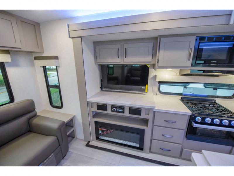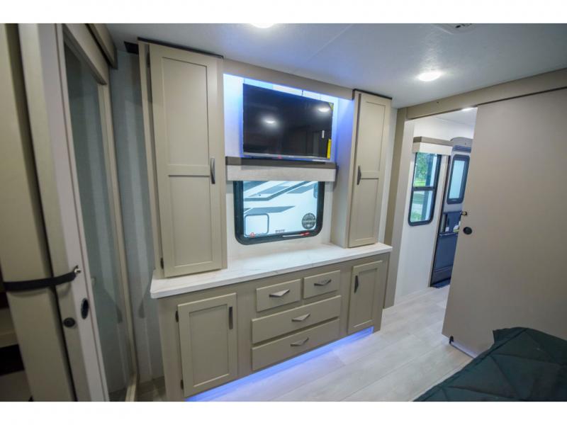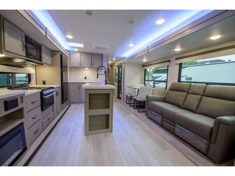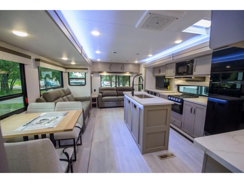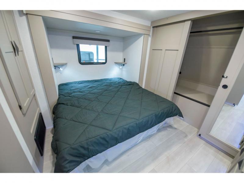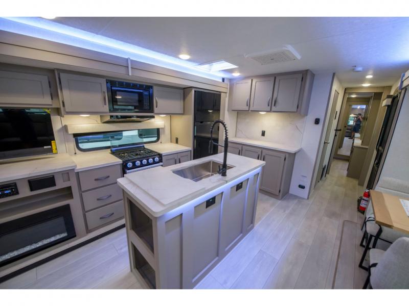 How about a nice afternoon of relaxing on the lake and then rinsing off in the 30" x 36" shower on this Connect travel trailer? After you get clean, you can grab a fresh change of clothes from the front walk-in closet and dresser in the private bedroom. The bedroom also has an area prepped for a washer and dryer and a king bed slide. Out in the main living area, you'll be able to prepare a meal without much effort at all since this trailer has a three-burner range, a microwave, a 10 cu. ft. 12V refrigerator, and a kitchen island for more prep space. You can even have your friends sit on the 70" sofa, theater seating, and booth dinette to chat with you while you finish the meal. You all will also benefit from the two electric awnings with LED lights on the exterior.