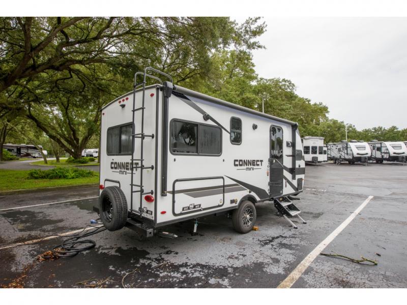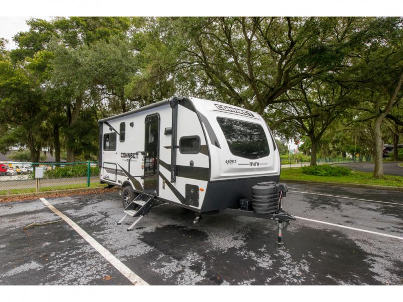 With any Connect Mini travel trailer by KZ, you will enjoy lightweight towing, interior comforts, and a price point you're sure to appreciate. Each model is constructed with durable 1-piece Tufflex material, 5/8" tongue and groove plywood flooring, and a molded fiberglass front cap with a windshield to let of your outdoor views in! You will love the look of the full glass friction hinged entry door, and the power awning with an LED light strip will provide a place to visit outdoors with friends and family. A hot and cold exterior shower also comes standard, along with nitrogen filled tires, a folding grab handle plus roof mounted solar prep and backup camera prep. Head inside to find residential grade linoleum, seamless countertops, roller shades, and painted hardwood cabinet doors. The 42,000 BTU tankless hot water heater will provide endless hot showers, and the low profile 13,500 BTU A/C will keep you comfortable during the summer!