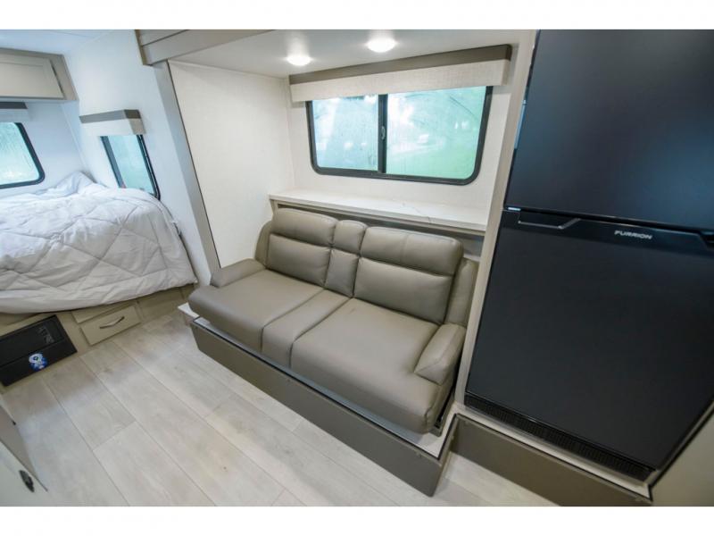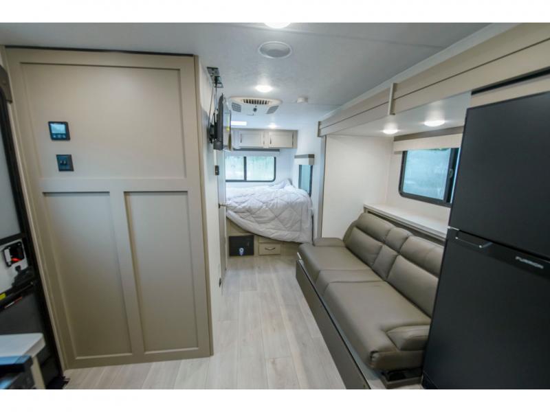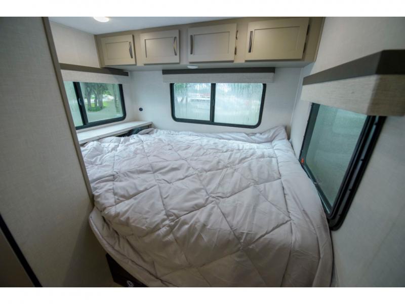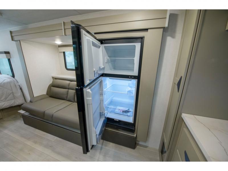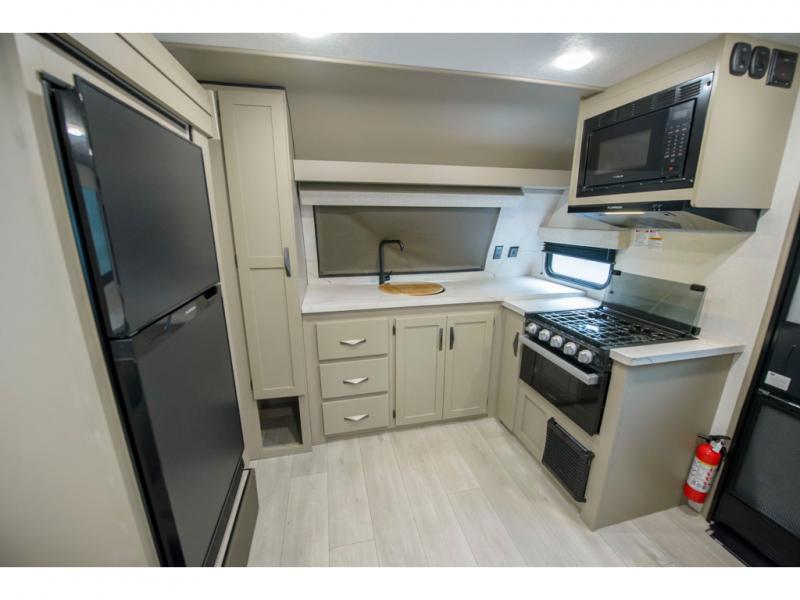 You'll love every minute spent in this front kitchen travel trailer for three campers! There is generous counter space to prep your best meals, and you can cook them on the interior three burner cooktop or on the outside griddle! A jackknife sofa with a table provides a place to relax, dine, and let a guest stay over, and the full bath onboard is sure to be appreciated. The back of this unit includes the 60" x 75" RV queen bed for a great night's rest!