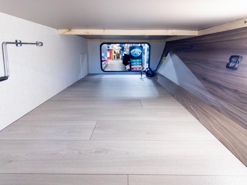 Travel on weekends, weekdays or whenever you want with this spacious trailer that has a large slide out that holds the theater seats with cupholders and USB ports, the 10 cu. ft. 12V refrigerator, and the cooking appliances. The rear corner has the kitchen sink and more counter space, giving the cook plenty of space to whip up camping meals. You can dine at the booth dinette or outside under the 18' power awning after grabbing your camping chairs from the pass-through storage. At night, get cleaned in the full bathroom with a nice amount of counter space for your toiletries, and fall quickly to sleep on your own queen bed up front with dual wardrobes for your clothing.